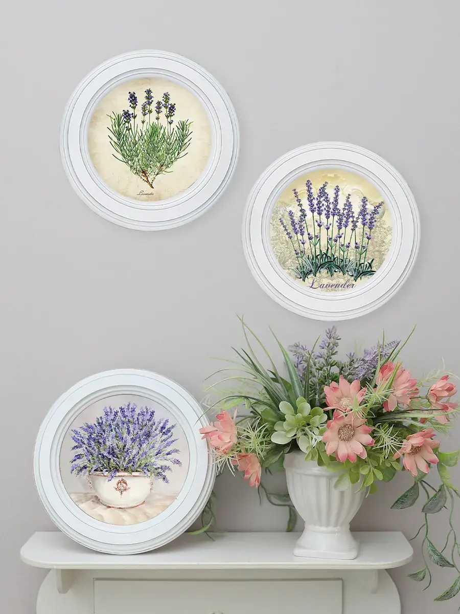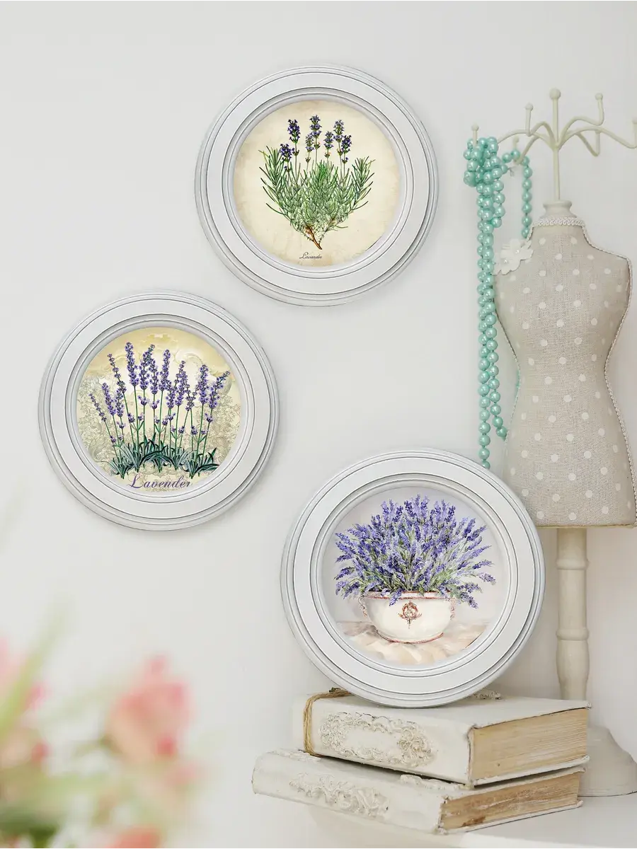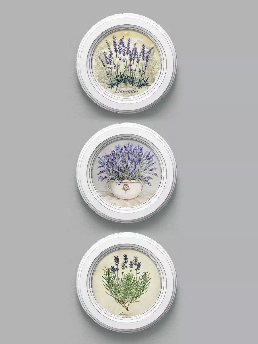 Настенный / настольный декор в стиле прованс с лавандой в белой деревянной раме. Набор из трех картин с разной лавандой для украшения интерьера дома или пасхального стола. Картины напечатаны на натуральном холсте, покрыты матовым лаком в круглой раме станет прекрасным украшением интерьера. Эта картина станет стильным акцентом в интерьере. Она идеально подойдет для оформления стен в различных помещениях: от кухни до спальни, от гостиной до прихожей. Настенное панно выполнено на холсте и отличается яркими цветами, изображающими цветы, что придаст уют и свежесть любому дому или квартире. Декоративное оформление в рамке добавит элегантности и завершенности, делая картину не только предметом декора, но и важной частью атмосферы вашего пространства. Это решение отлично впишется в интерьер офиса, зала или любой комнаты, создавая ощущение счастья и гармонии. Пусть данное предметы искусства придаст вашему дому индивидуальность и изысканный стиль.
