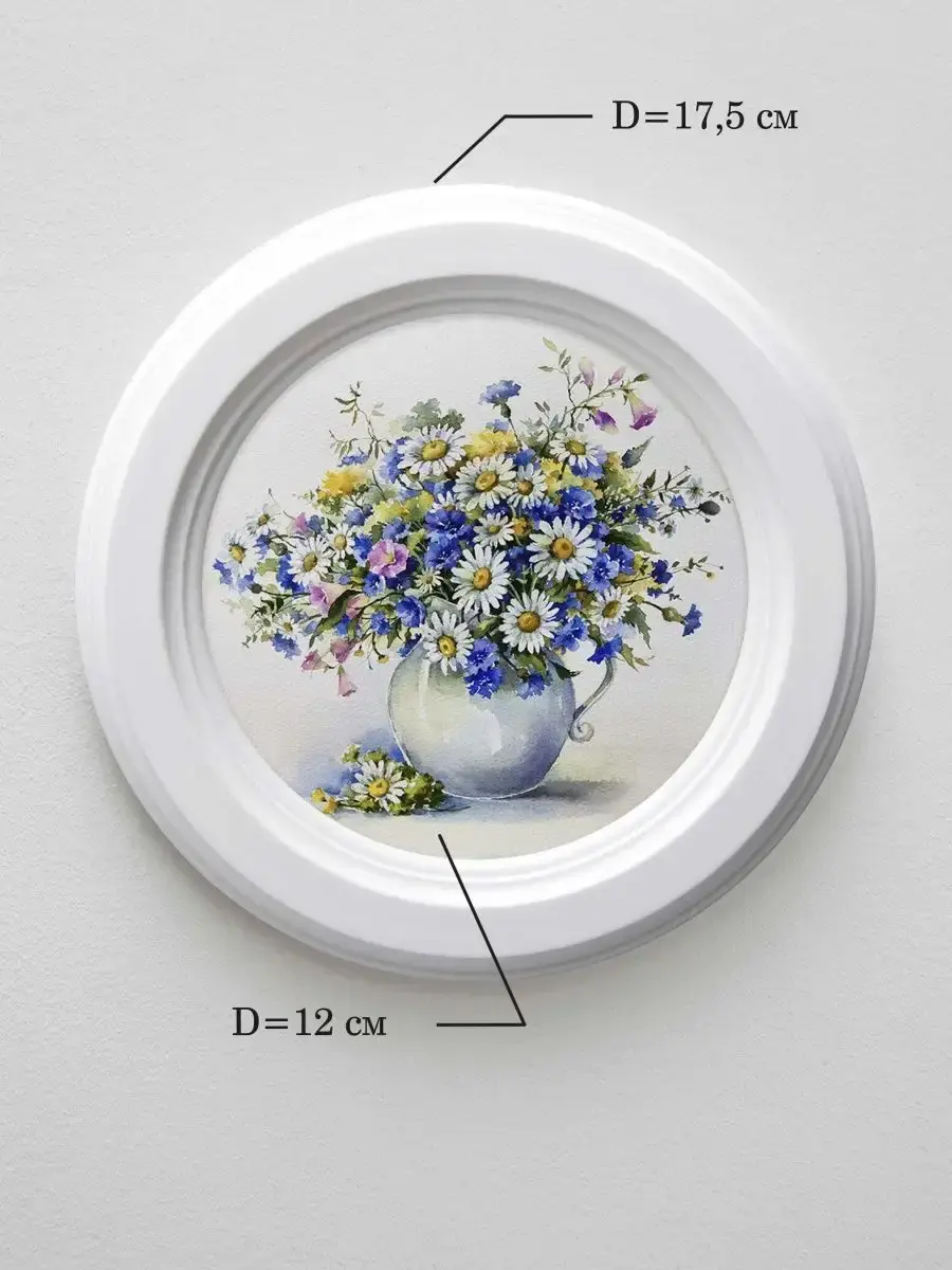 Множество вариантов дает возможность создать собственную коллекцию. Рама изготовлена из цельного листа МДФ 16 мм, не имеет зазоров и стыков. Окрашена экологичной акриловой эмалью в белый, коричневый, мятный цвет или с эффектом старения. Диаметр картины 17,5 см, диаметр изображения 12 см. Крепление для стены и для установки на стол в комплекте.