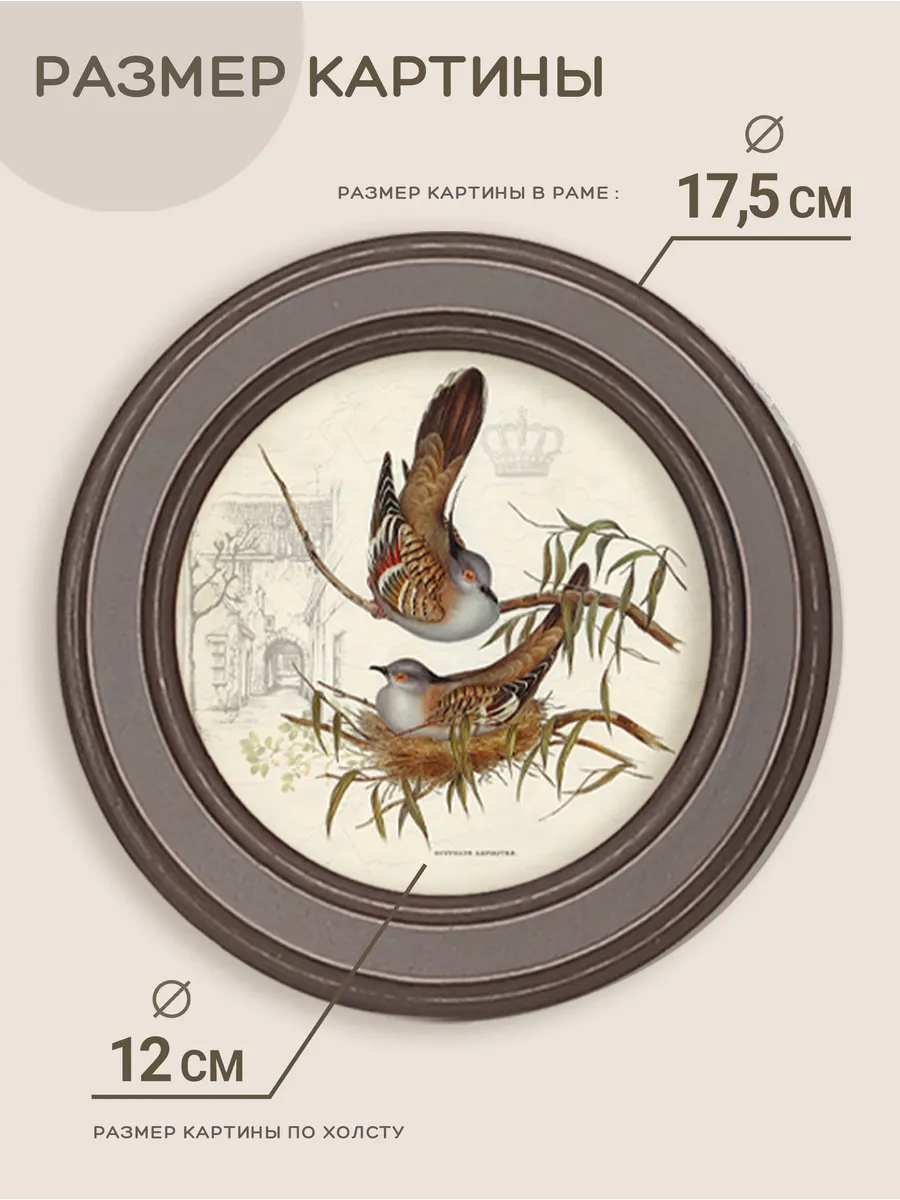 Настенный или настольный декор в нежных пастельный тонах с изящными птичками или цветочками в деревянной раме. Картины напечатаны на натуральном холсте, покрыты матовым лаком в круглой раме станет прекрасным украшением интерьера кухни, гостиной, детской. Картину можно повесить на стену, а так же использовать как настольный декор. Множество вариантов дает возможность создать собственную коллекцию. Коллекцию можно дополнить зеркалом, оформить свои творческие работы или фотографии в раму. Рама изготовлена из цельного листа МДФ 16 мм, не имеет зазоров и стыков. Окрашена экологичной акриловой эмалью в белый, коричневый, мятный цвет. Диаметр картины 17,5 см, диаметр изображения 12 см. Крепление для стены и для установки на стол в комплекте.