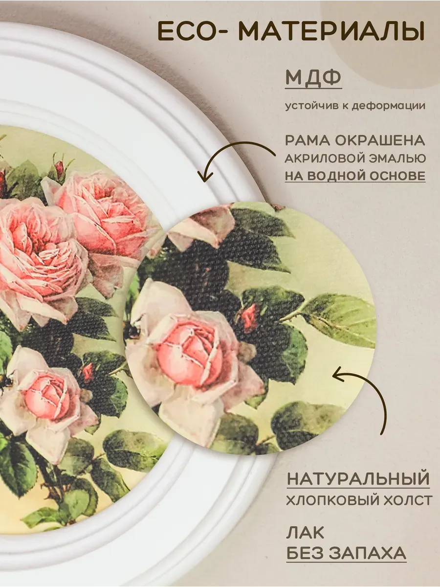 Настенный или настольный декор в нежных пастельный тонах с изящными птичками или цветочками в деревянной раме. Картины напечатаны на натуральном холсте, покрыты матовым лаком в круглой раме станет прекрасным украшением интерьера кухни, гостиной, детской. Картину можно повесить на стену, а так же использовать как настольный декор. Множество вариантов дает возможность создать собственную коллекцию. Коллекцию можно дополнить зеркалом, оформить свои творческие работы или фотографии в раму. Рама изготовлена из цельного листа МДФ 16 мм, не имеет зазоров и стыков. Окрашена экологичной акриловой эмалью в белый, коричневый, мятный цвет. Диаметр картины 17,5 см, диаметр изображения 12 см. Крепление для стены и для установки на стол в комплекте.