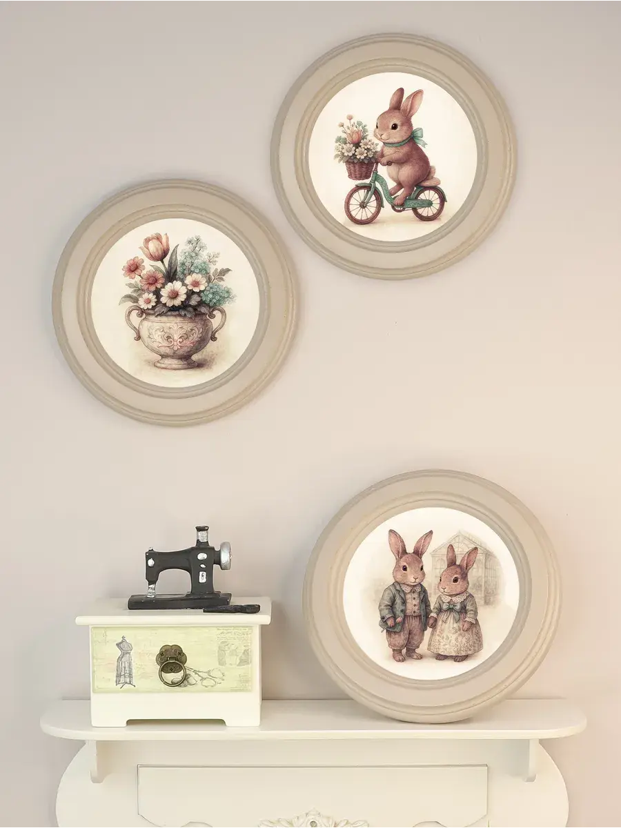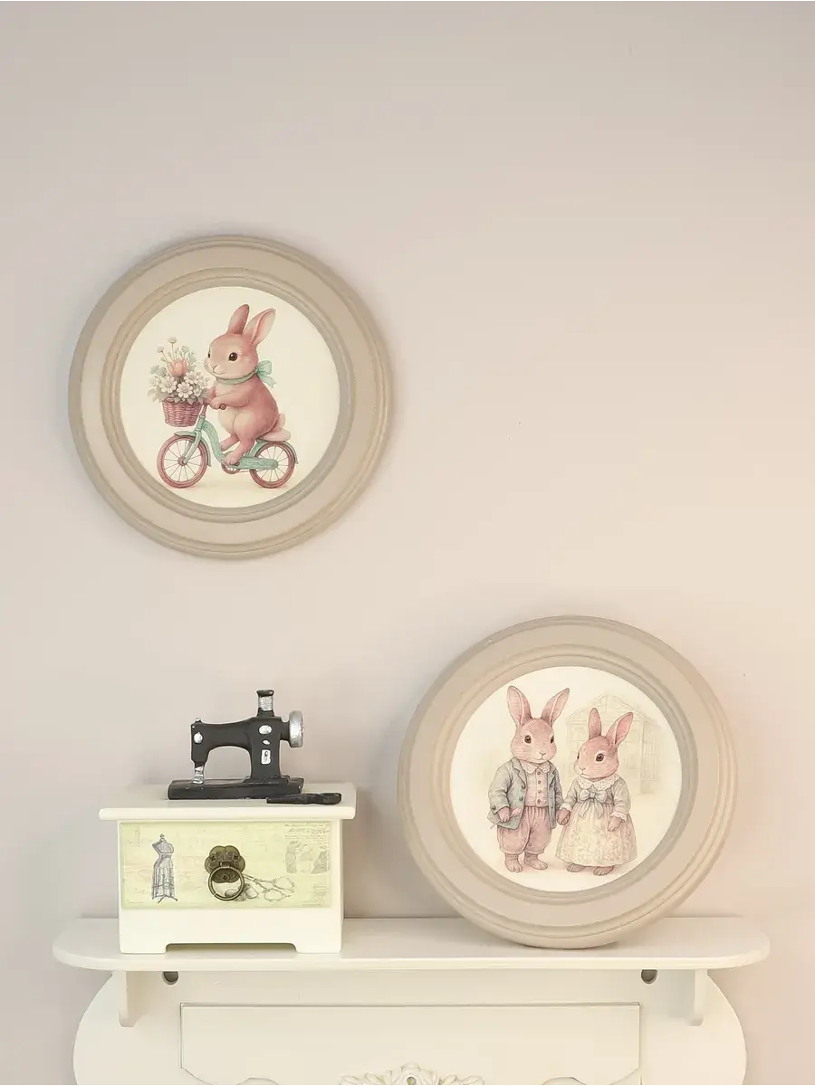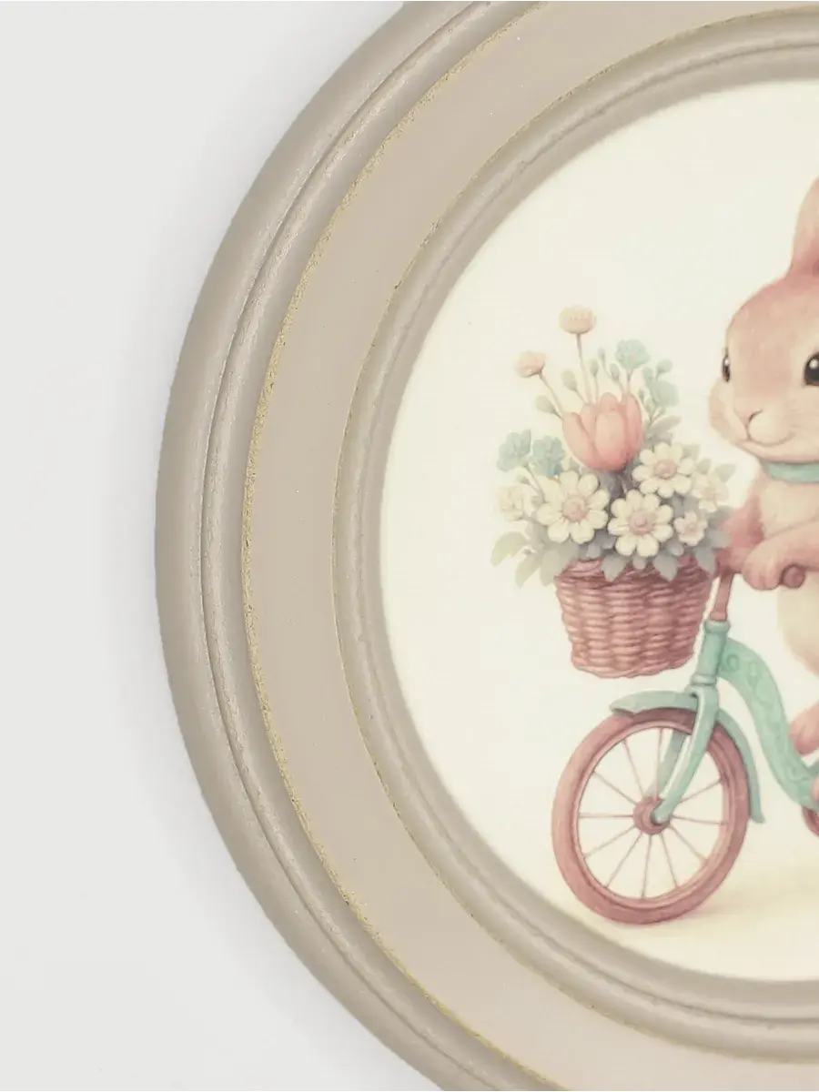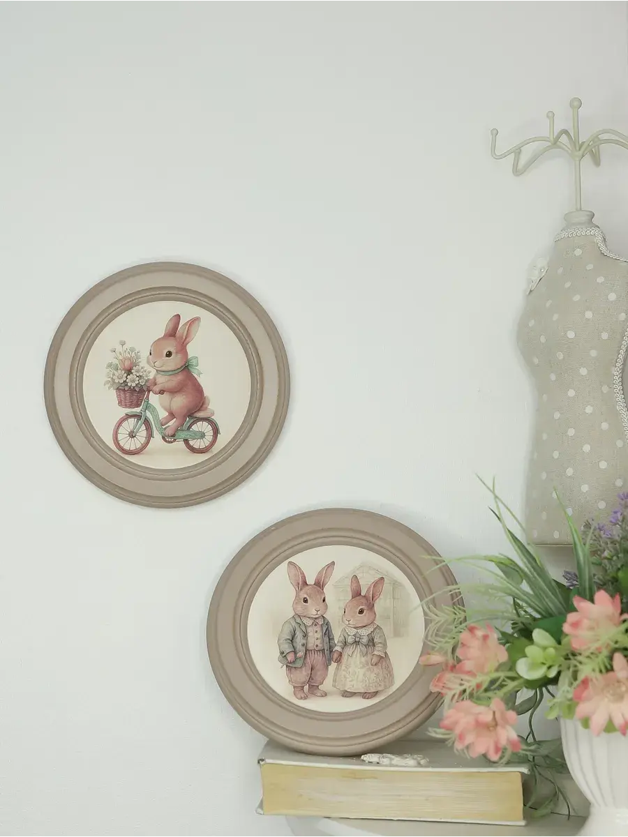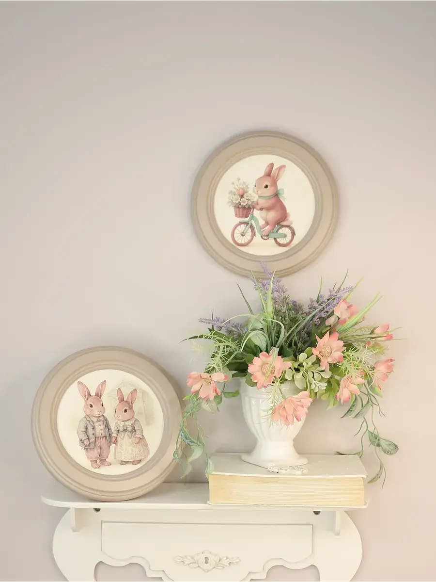 Настенный или настольный декор в нежных пастельный тонах с изящными зайчиками и цветочками в деревянной раме.