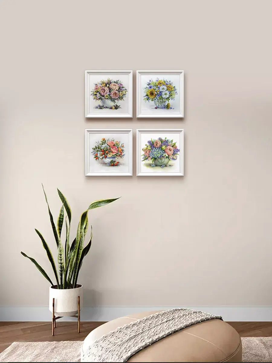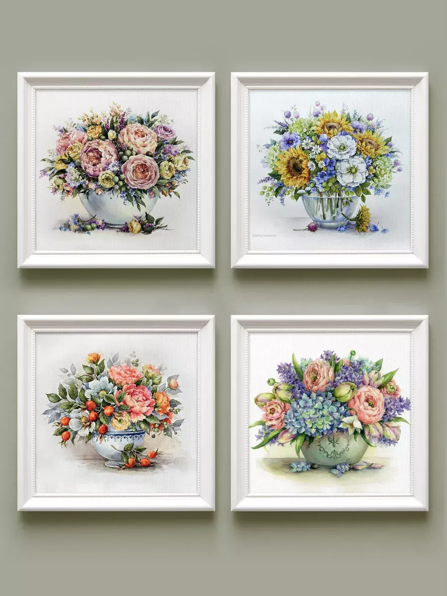 Набор из четырех репродукций картин российской художницы Елены Вавилиной. Картины напечатаны на натуральном холсте. Размер каждой картины 23х23 см. Настенный декор в раме, это современный способ украсить стены вашего дома и расслабить вас после работы, атмосфера релакса, уюта и тепла. Картина напечатана в высоком разрешении на натуральном холсте, покрыта матовым лаком, размер холста 19х19 см, размер с рамой 23х23 см. Белоснежная багетная рама придает картине лаконичности. В комплекте шуруп с дюбелем и зубчатый крепеж на раме. Рама из полиуретана белого цвета. Картины предназначены для создания коллекций в гостиной, детской, прихожей, спальне или кухне. Украшение для дома и дачи, подарок в дом друзьям и коллегам. Картины упакованы в пакет и коробку.
