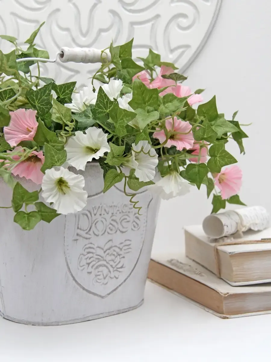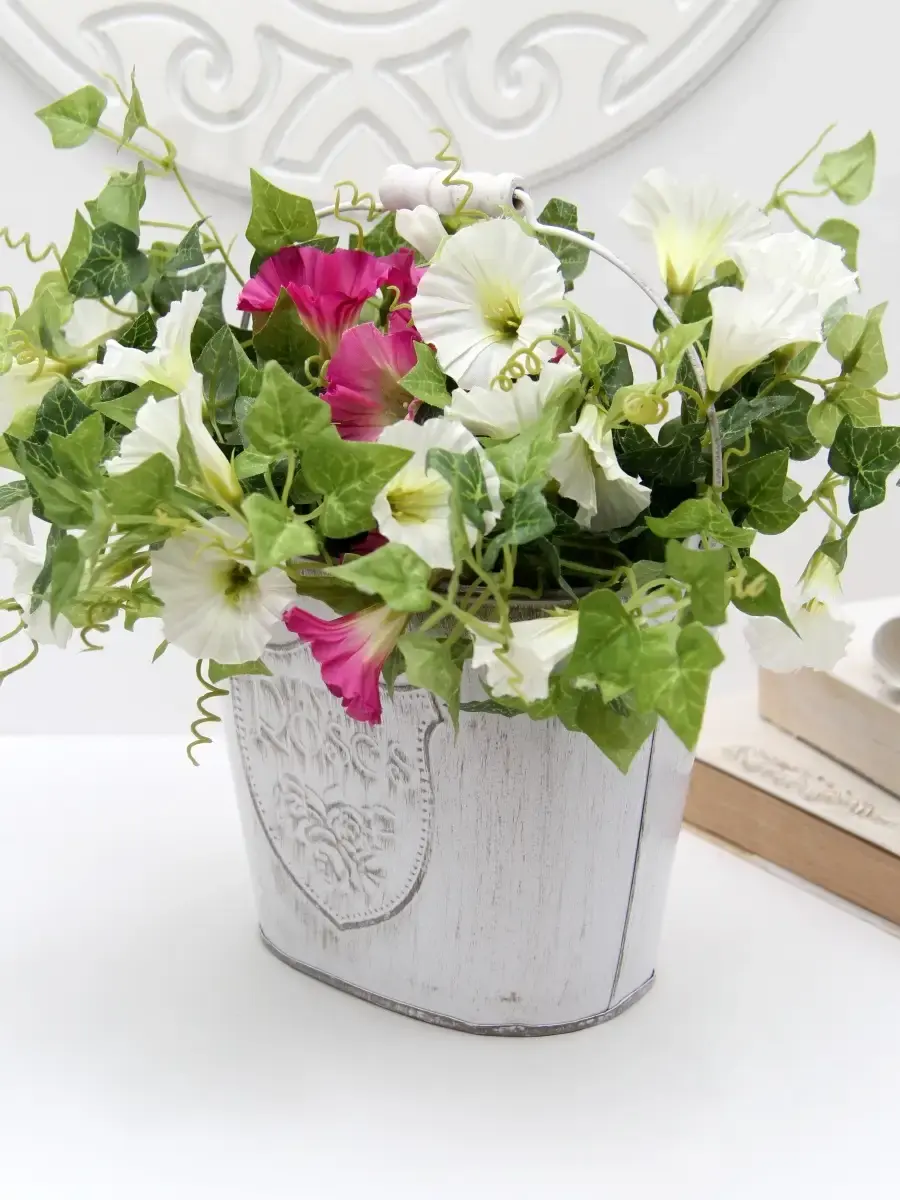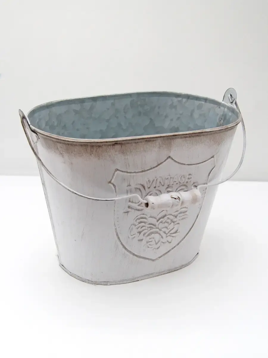 Металлическое ведерко-кашпо для растений. Станет прекрасным украшением интерьера в стиле прованс. ВНИМАНИЕ - цветы в комплект не входят, использованы для примера на фото. Размер кашпо 17х25х15 см, высота с ручкой 30 см.