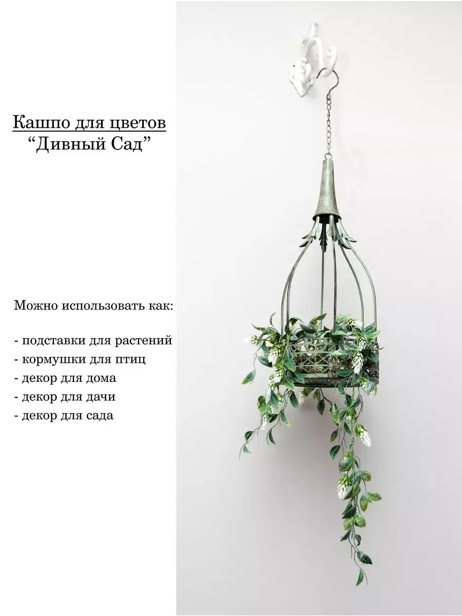 Кашпо подвесное для комнатных растений или искусственных цветов из коллекции "Дивный сад". Кашпо с декоративной клеткой станет прекрасным дополнение к интерьеру, в нем комфортно размесятятся ампельные растения или папоротники.