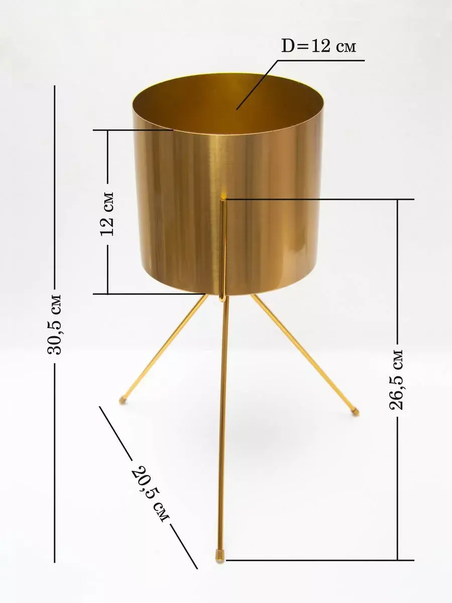 Кашпо металлическое на ножках от бренда Elenadecor - идеальное решение для оформления интерьера в современном стиле. Это красивое декоративное изделие обязательно подчеркнет ваш уникальный дизайн и добавит шарма в ваш дом. Кашпо имеет диаметр 12 см и высоту 12 см, высота с ножками 30.5 см, идеально подходит для различных растений и цветов. Металлические ножки надежно держат кашпо. Кашпо легко впишется в любой интерьер. Этот продукт отличается высоким качеством материалов и стильным цветовым решением. Подарите своему интерьеру оригинальный акцент с помощью этого кашпо на металлических ножках.