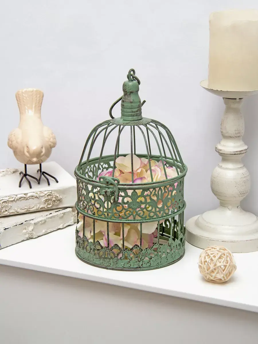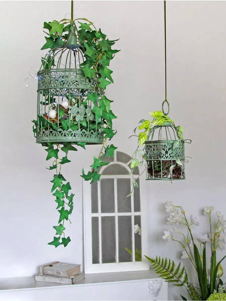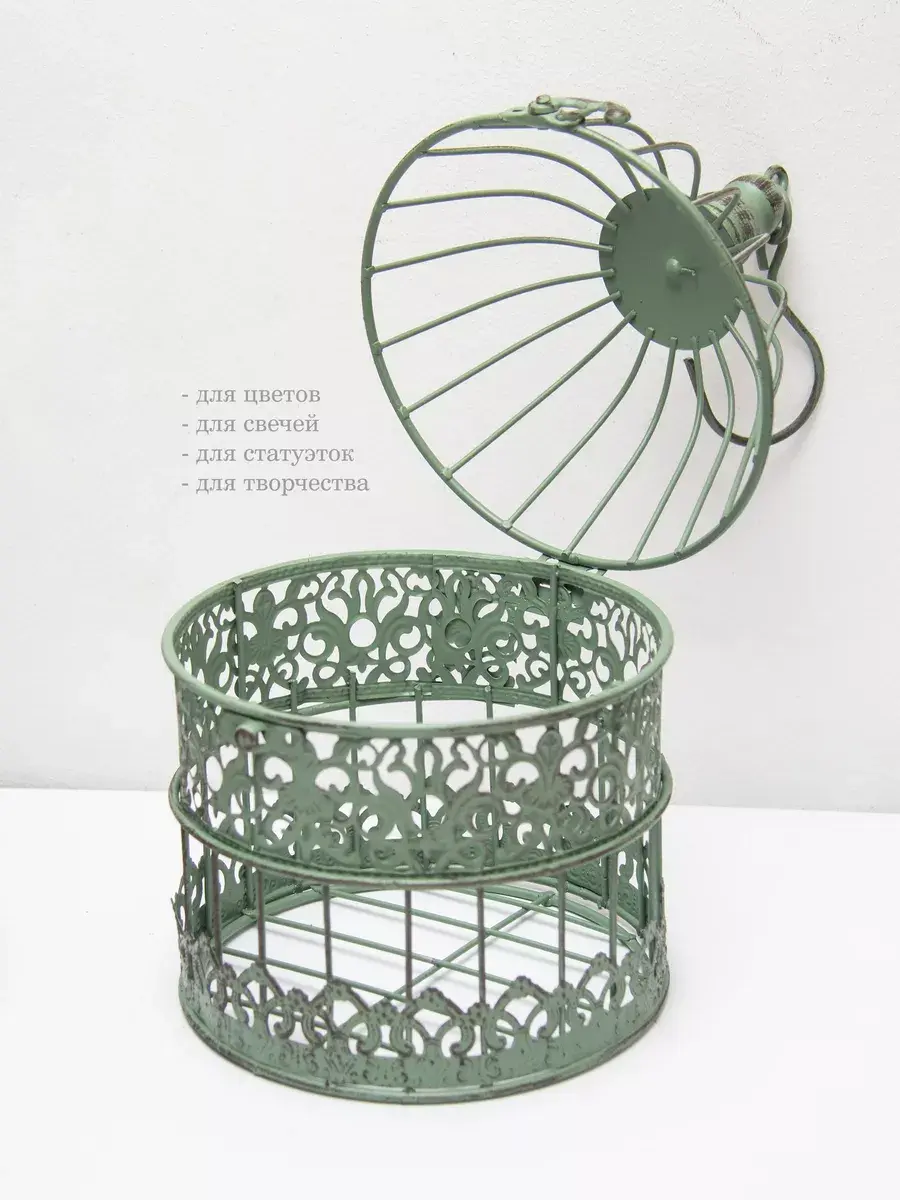 Клетка декоративная для подвешивания растений 35*19,5 см. В клетку можно поставить кашпо для растений или искусственные цветы. Интерьерную клетку можно использовать как держатель для кашпо, как подсвечник или декор на полке. Для декора интерьера используйте декоративные клетки, их можно дополнить светодидодами, свечами на батарейках и цветами. Декоративные подвесы на летней террасе, в кафе или на кухне создадут романтический интерьер. Используйте подвесной декор для украшения окон и балконов. Декоративная металлическая клетка как декор на полку для украшения интерьера в стиле прованс. Размер клетки 18,5*10 см. Клетка может стоять на столике, подоконнике или подвешиваться за кольцо на крышке. Подойдет для миниатюрного горшочка с живыми цветами, статуэтки, искусственного растения, свечей.