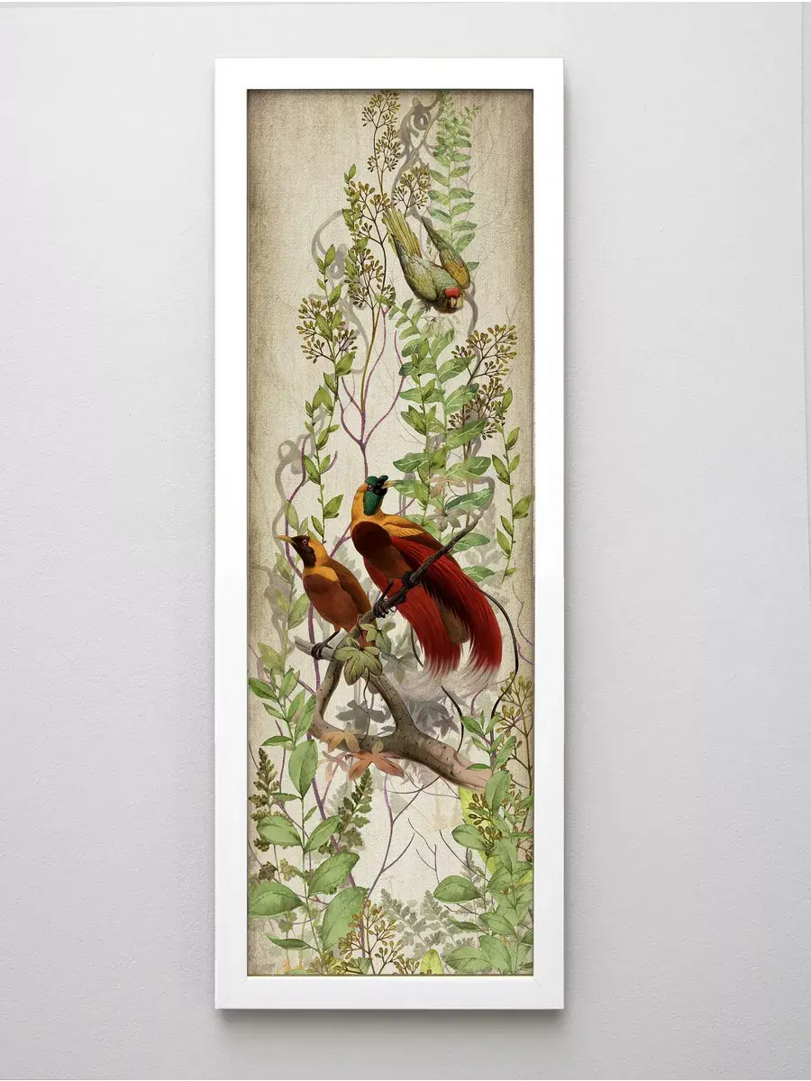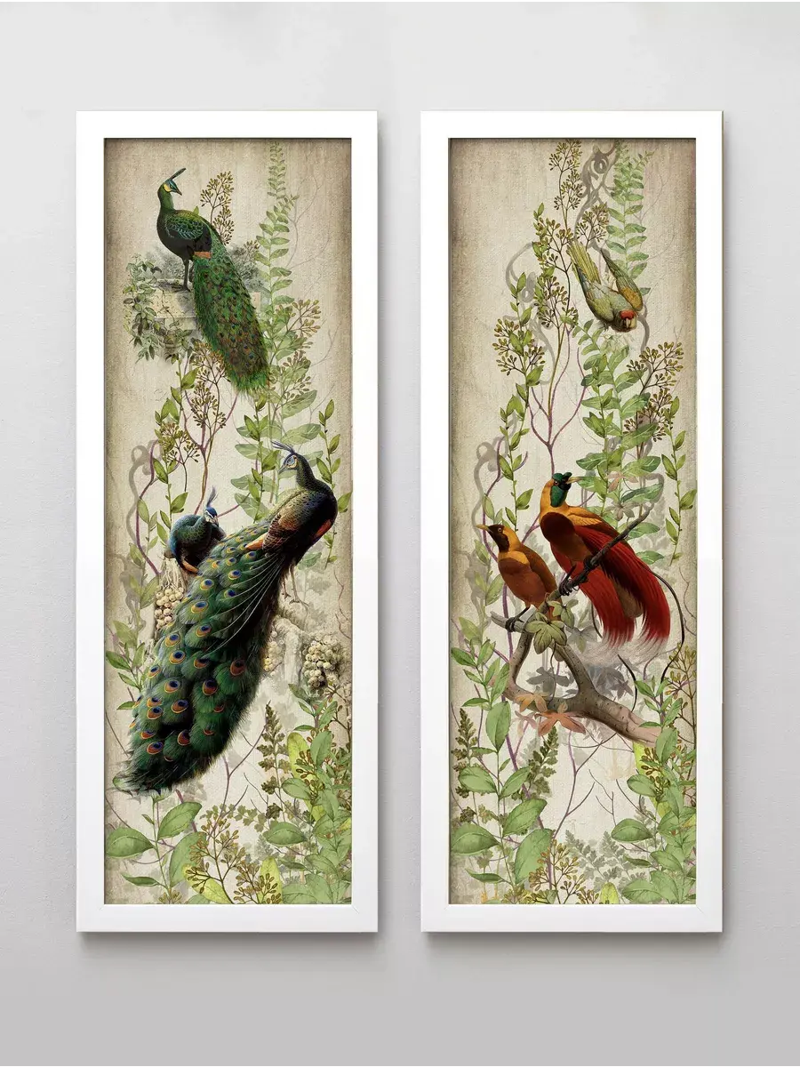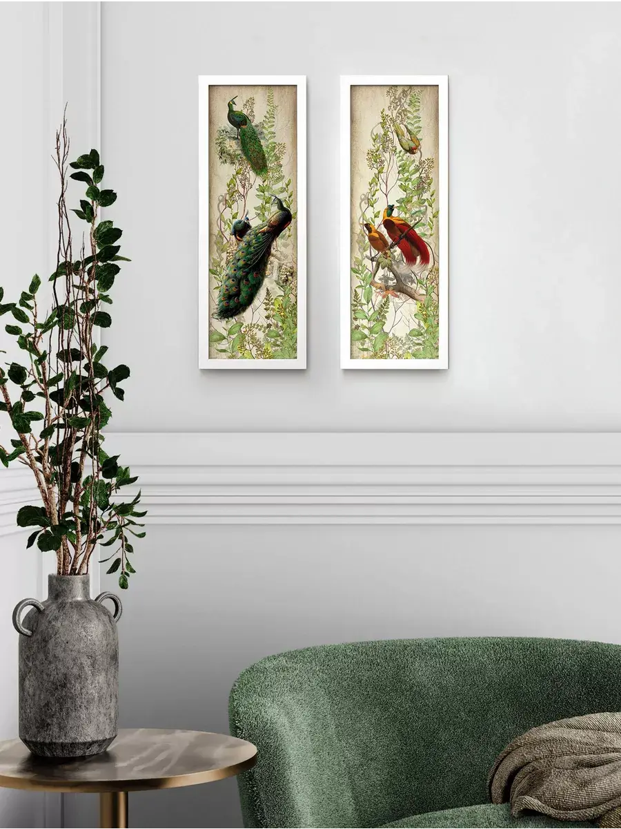 Набор их 2х вертикальных картин в тонкой багетной раме. Постеры для украшения стен дома, на даче или в кафе. Настенные панно с птичками станут поистине прекрасным украшением интерьера, подходят для создания коллекций. Картина напечатана на фото-бумаге, покрыта матовой ламинацией. Рама из полиуретана. Комплект из двух картин. Размер каждой картины 18х50 см. Крепление для стены в комплекте.Обратите ВНИМАНИЕ в серии представлены картины в рамах 4х расцветок: изумрудно-зеленого, коричневого, белого и бежевого цветов. Будьте внимательны при подборе комплектов.