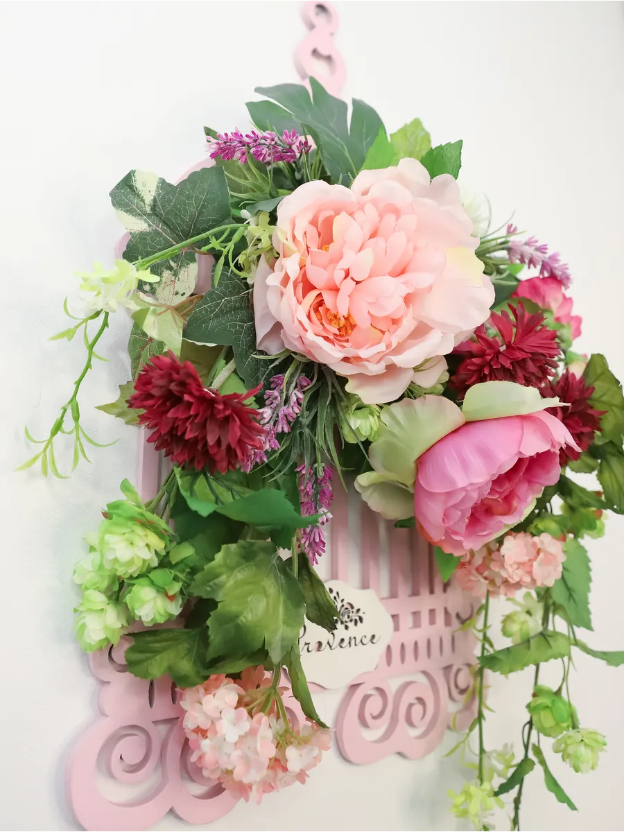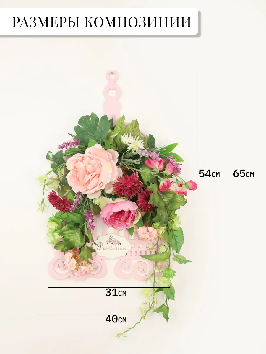 Авторская композиция из интерьерных цветов на деревянной подложке 54*31 см. Настенная цветочная композиция с искусственными интерьерными цветами. Выполнена из высококачественных искусственных цветов и растений: пионы, розы, горошек, хмель. В комплекте шуруп с дюбелем и зубчатый крепеж на подложке. Отличное украшение к зеркалу, коллекции картин с цветами или в прихожей, где живым цветам недостаточно света. Панно долго будет радовать и добавлять уюта в дом.