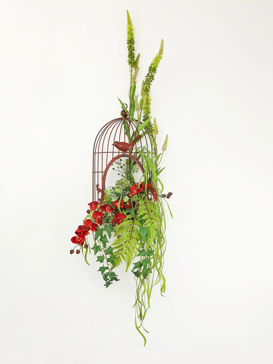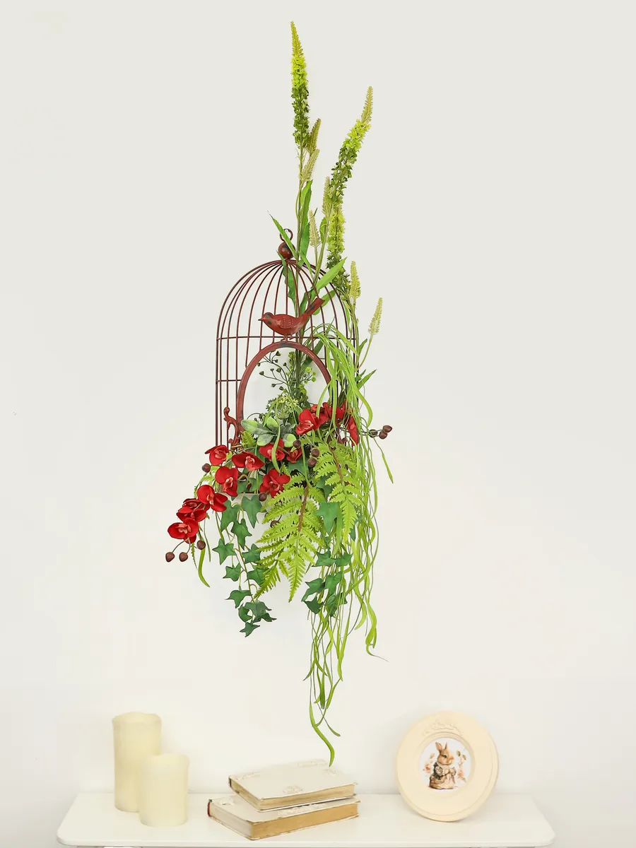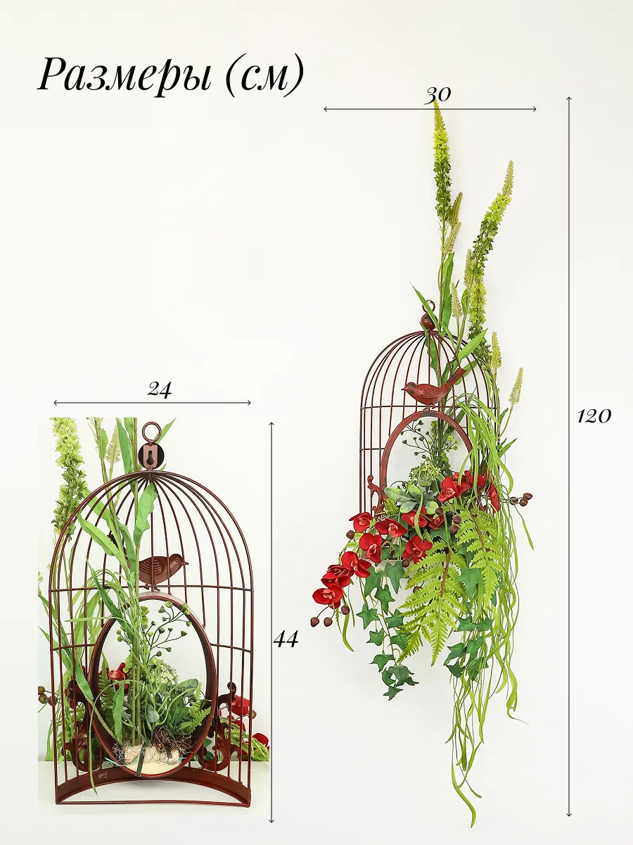 Авторская композиция из интерьерных цветов в металлической клетке. Настенная цветочная композиция с искусственными интерьерными цветами. Выполнена из высококачественных искусственных цветов и растений: папоротник, орхидея, хмель. В комплекте шуруп с дюбелем, а на клетке есть колечко для подвешивания. Отличное украшение к зеркалу или коллекции картин с цветами, в прихожей или там, где живым цветам недостаточно света. Панно долго будет радовать и добавлять уюта в дом.