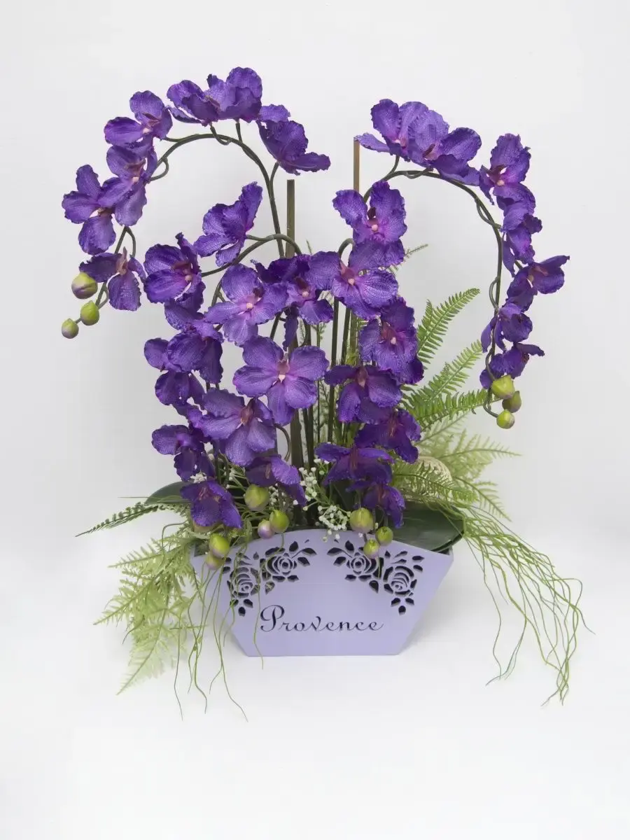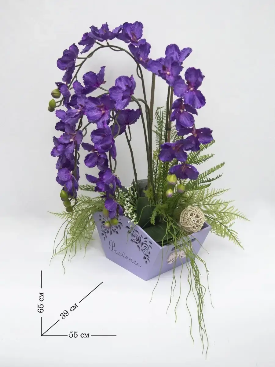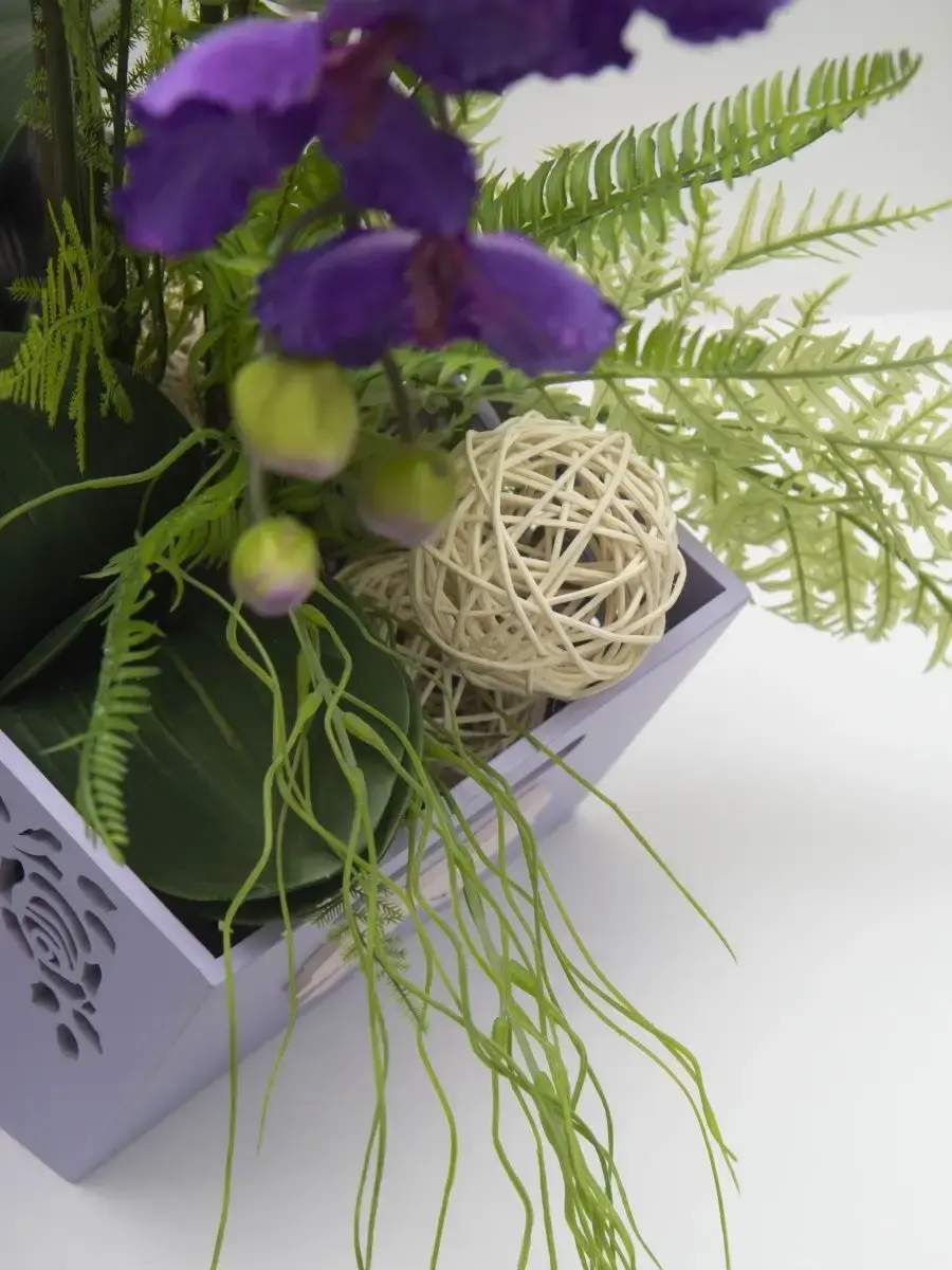Авторская цветочная композиция "Орхидея". Изготовлена из высококачественных цветов и растений. Композиция надежно установлена в деревянном кашпо.Размер композиции 66*55*39.