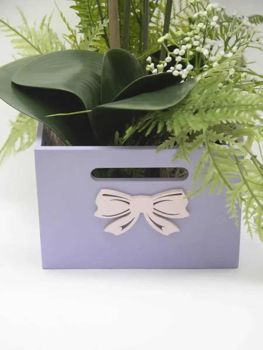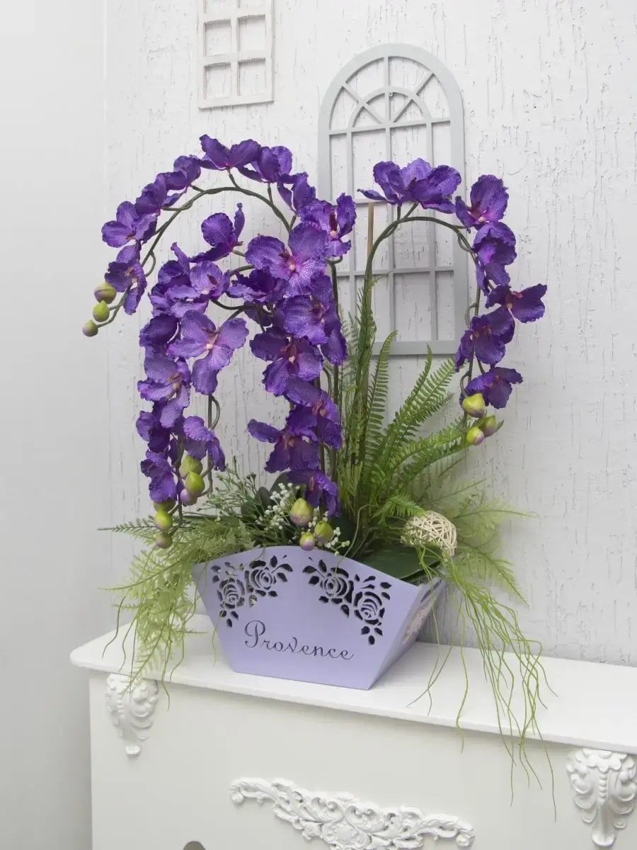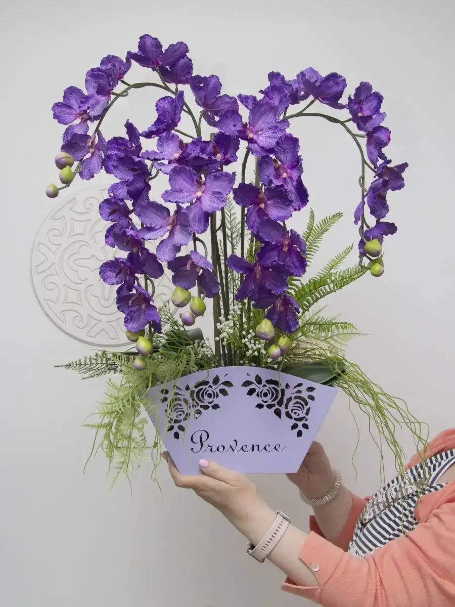 Авторская цветочная композиция "Орхидея". Изготовлена из высококачественных цветов и растений. Композиция надежно установлена в деревянном кашпо.Размер композиции 66*55*39.