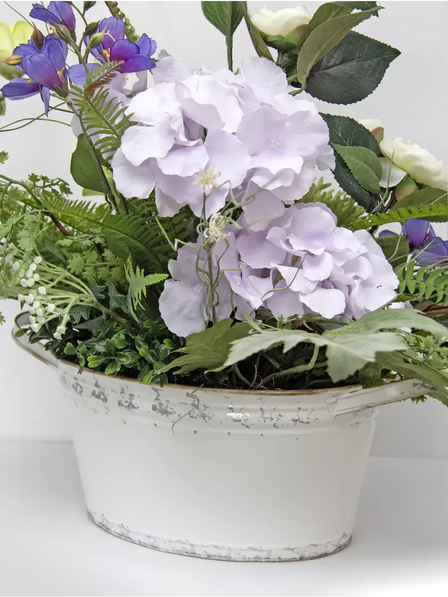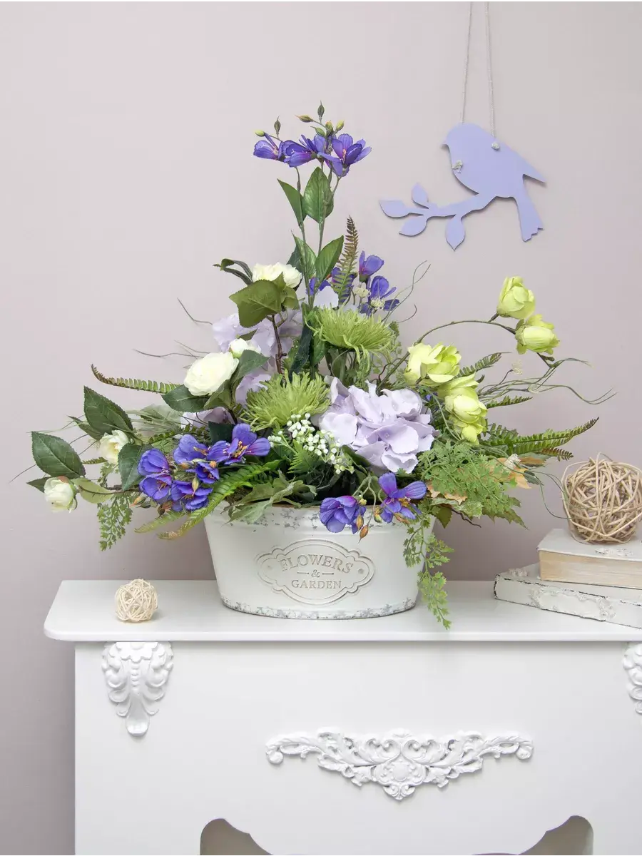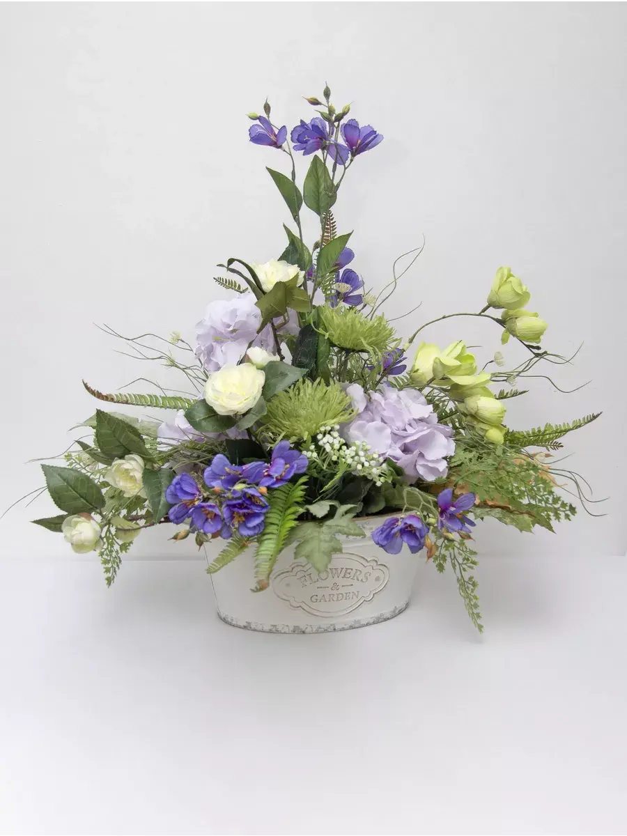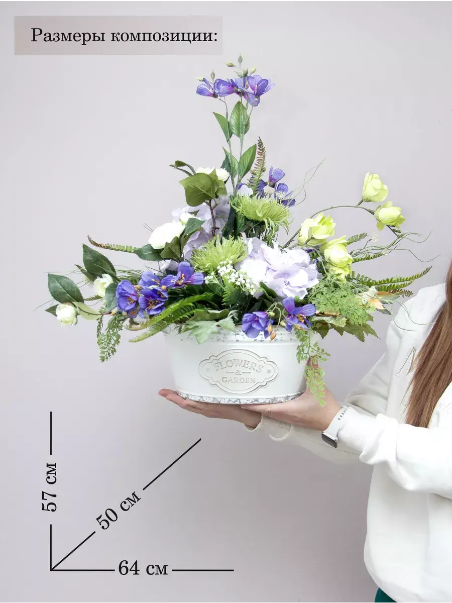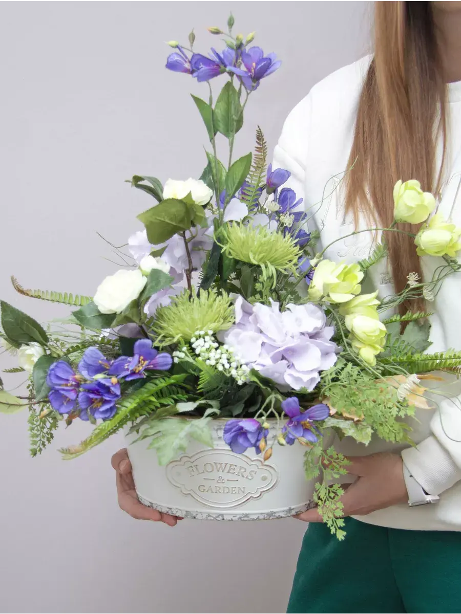 Цветочная композиция "Весенний сад" в металлическом кашпо. Искусственные растения надежно закреплены в кашпо. Большая интерьерная композиция для украшения полок, консолей, зимнего сада. Декор прекрасно дополнит декоративное окно или зеркало. Может устанавливаться на стол. Размер композиции целиком 57*60*54 см.