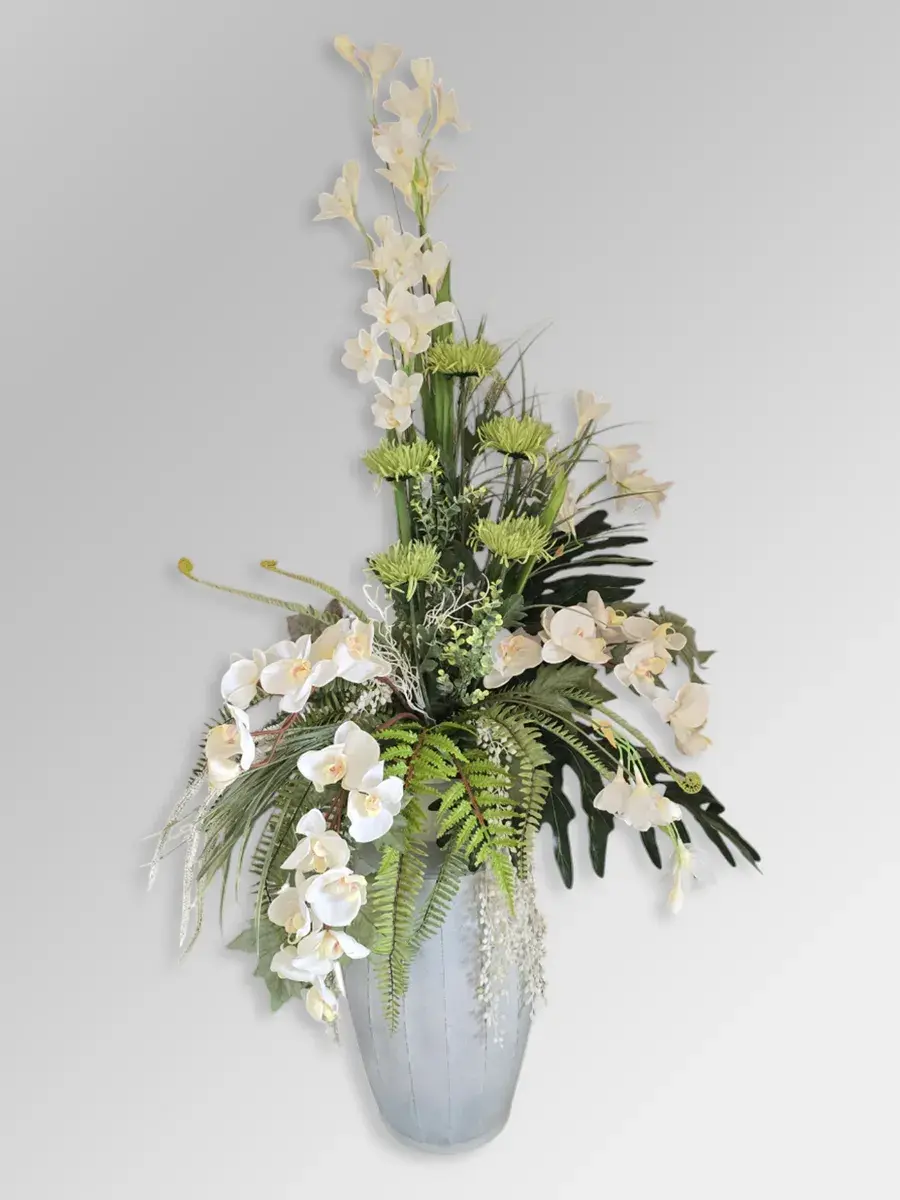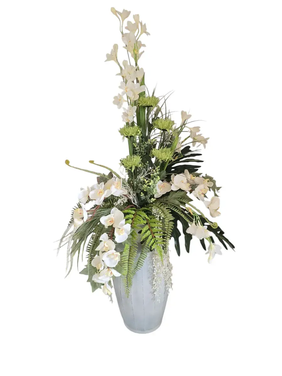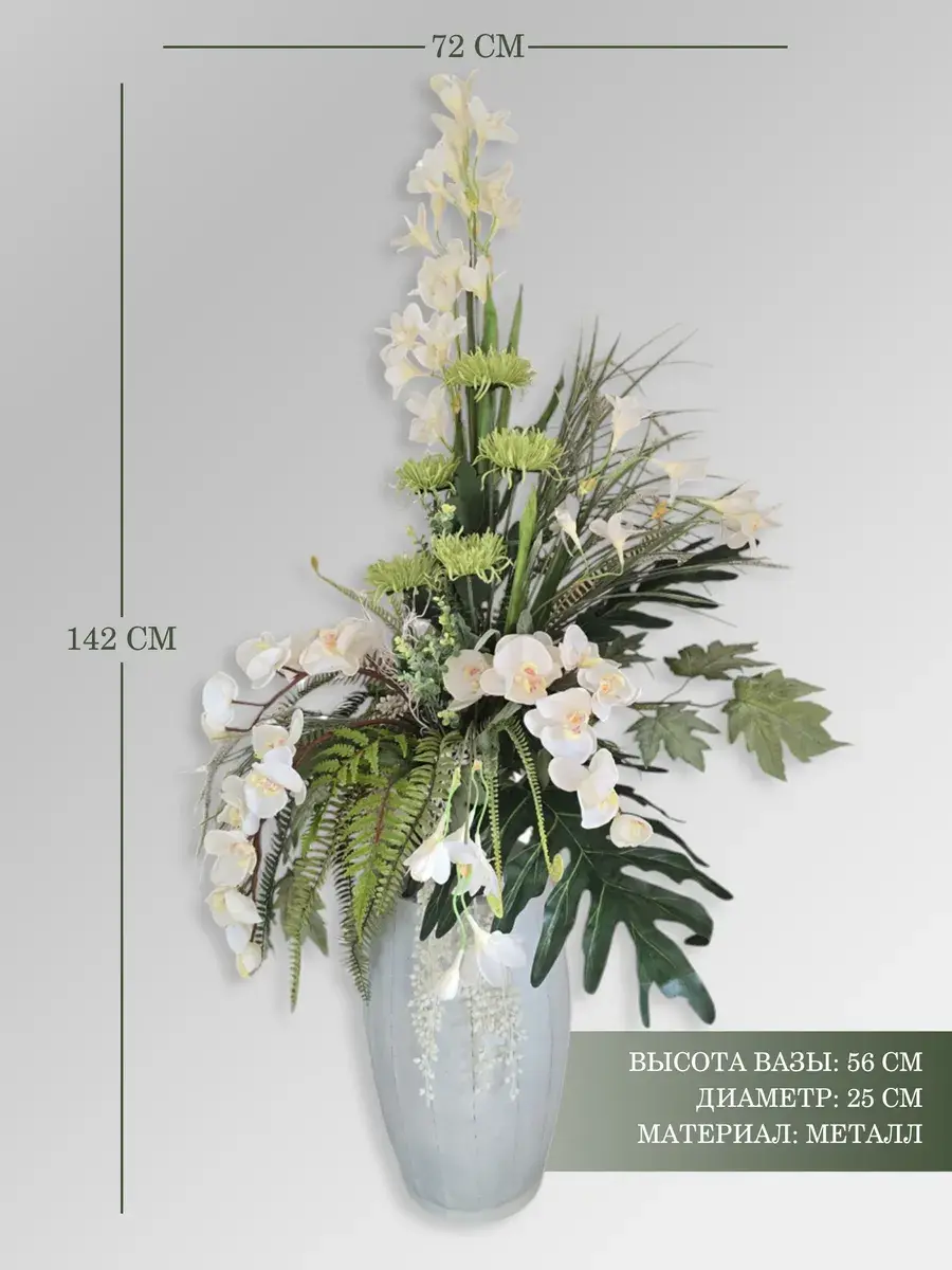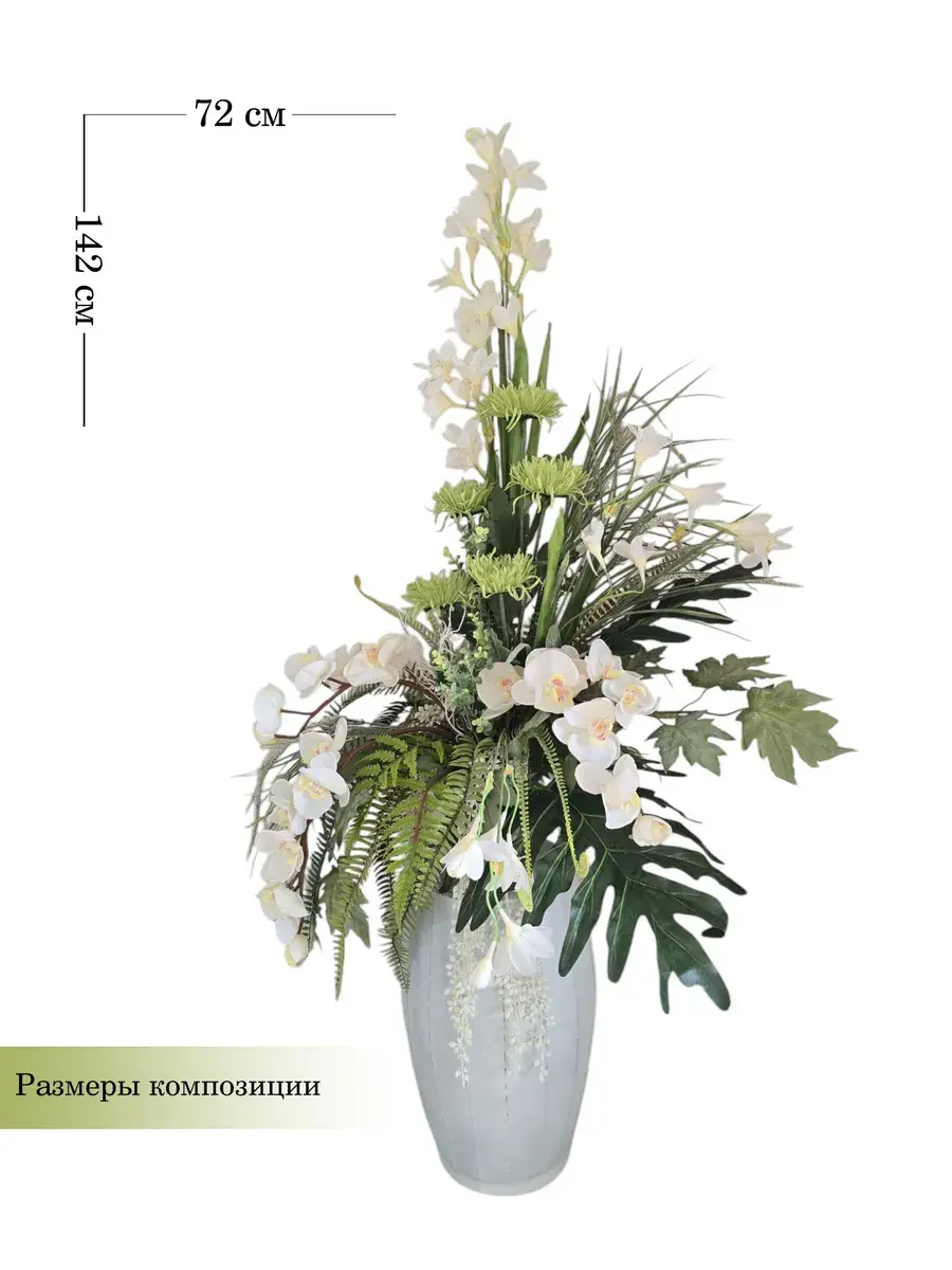Цветочная композиция "Белая Орхидея" в классическом стиле в напольной вазе. Ваза с эффектом состаривания, искусственные растения надежно закреплены. Цветы для украшения полок, консолей, зимнего сада. Декор прекрасно дополнит декоративное окно или зеркало. Может устанавливаться на стол. Размер вазы 55*24 см, размер композиции целиком 142х72х46 см.