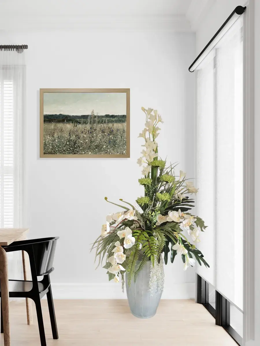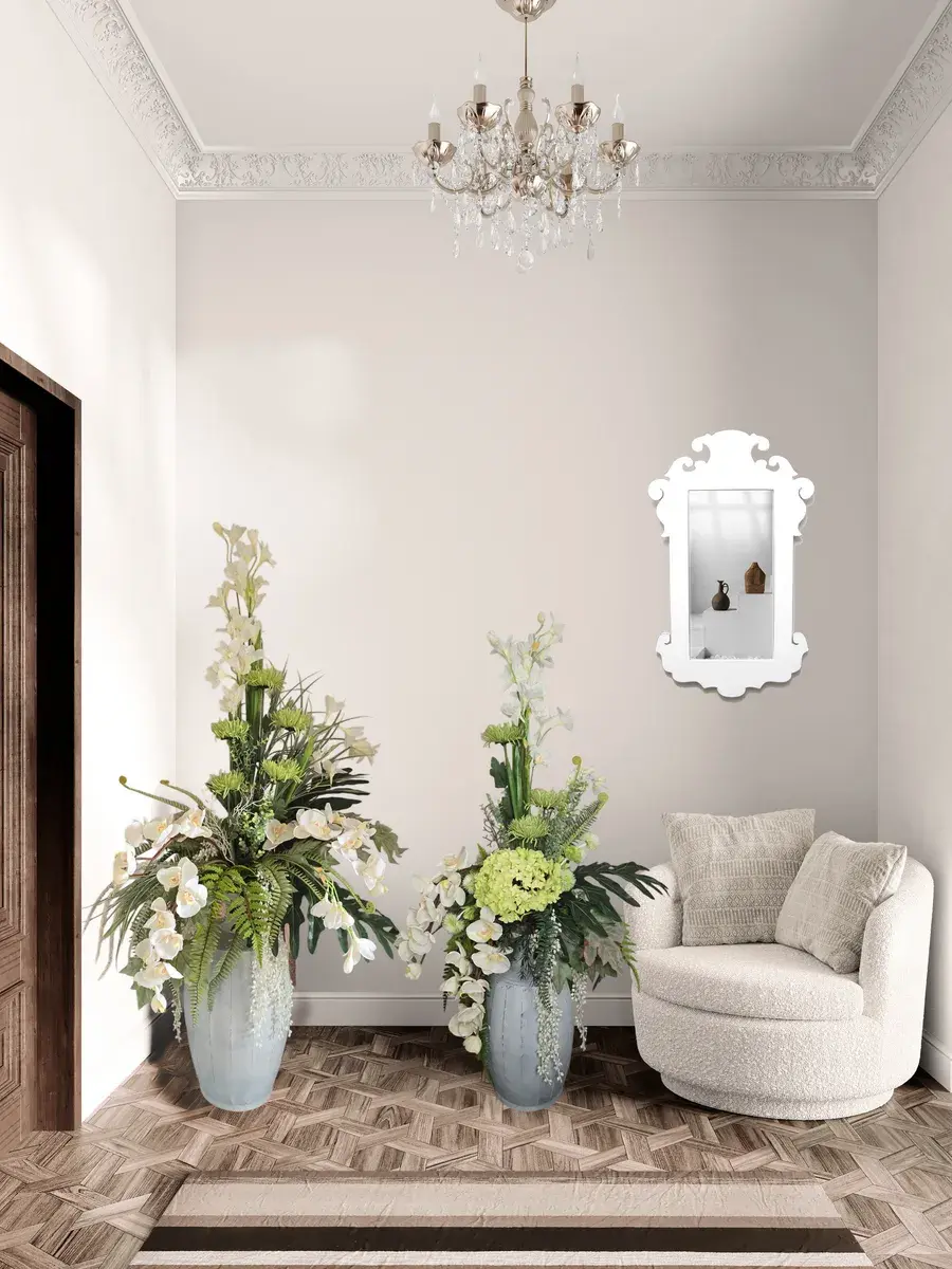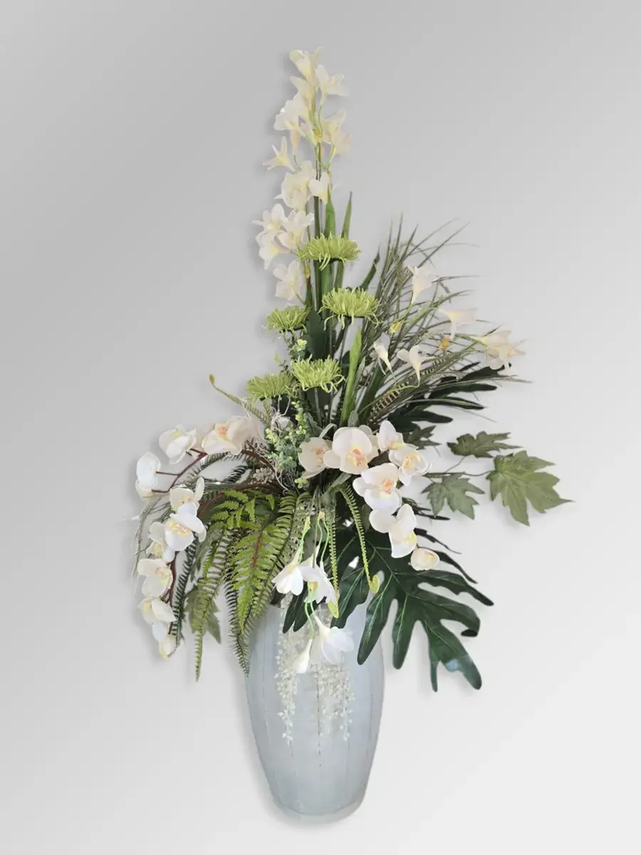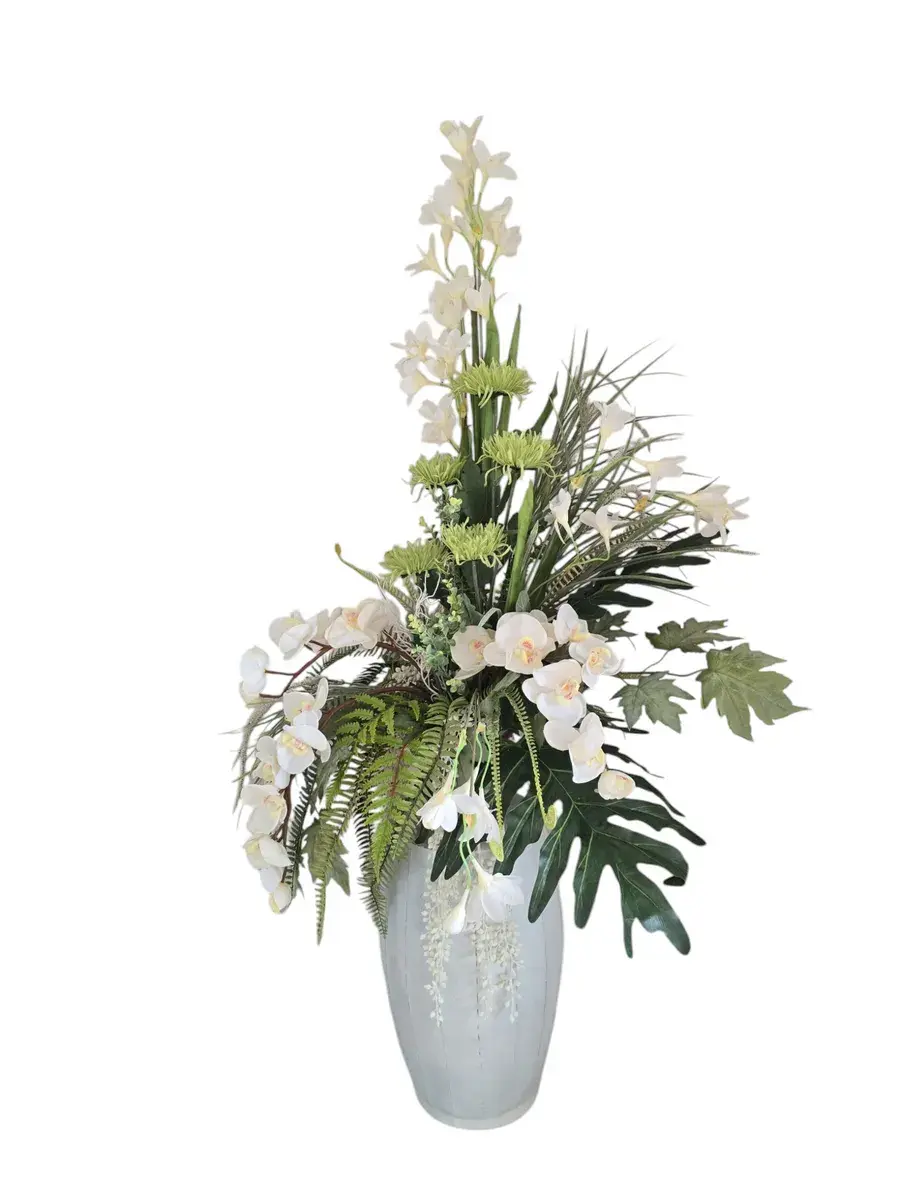 Цветочная композиция "Белая Орхидея" в классическом стиле в напольной вазе. Ваза с эффектом состаривания, искусственные растения надежно закреплены. Цветы для украшения полок, консолей, зимнего сада. Декор прекрасно дополнит декоративное окно или зеркало. Может устанавливаться на стол. Размер вазы 55*24 см, размер композиции целиком 142х72х46 см.