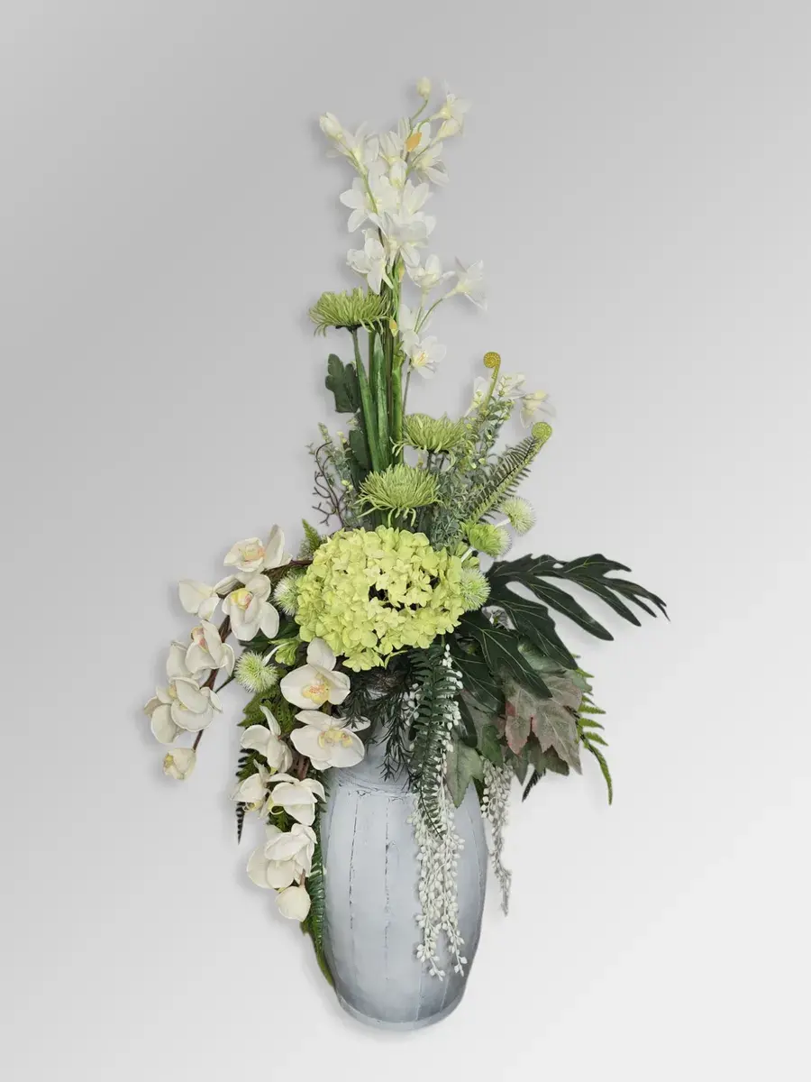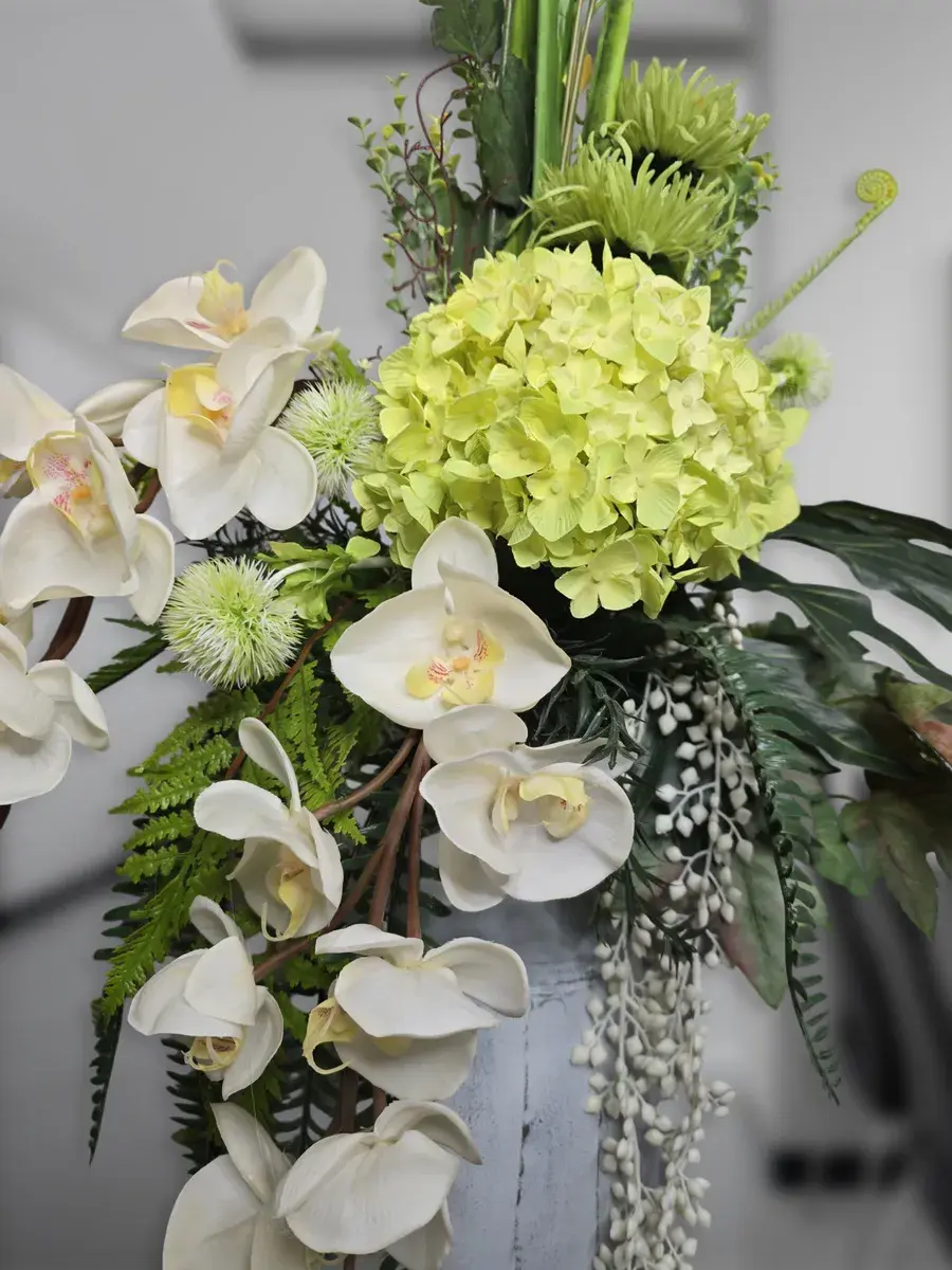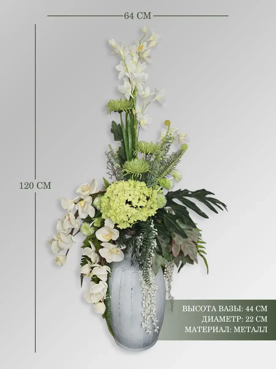 Цветочная композиция "Гортензия" в классическом стиле в напольной вазе. Ваза с эффектом состаривания, искусственные растения надежно закреплены. Цветы для украшения полок, консолей, зимнего сада. Декор прекрасно дополнит декоративное окно или зеркало. Может устанавливаться на стол. Размер вазы 44*22 см, размер композиции целиком 120х64х46 см.