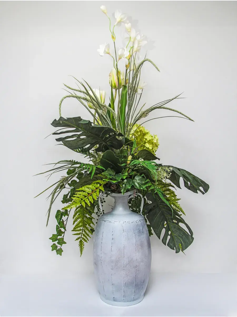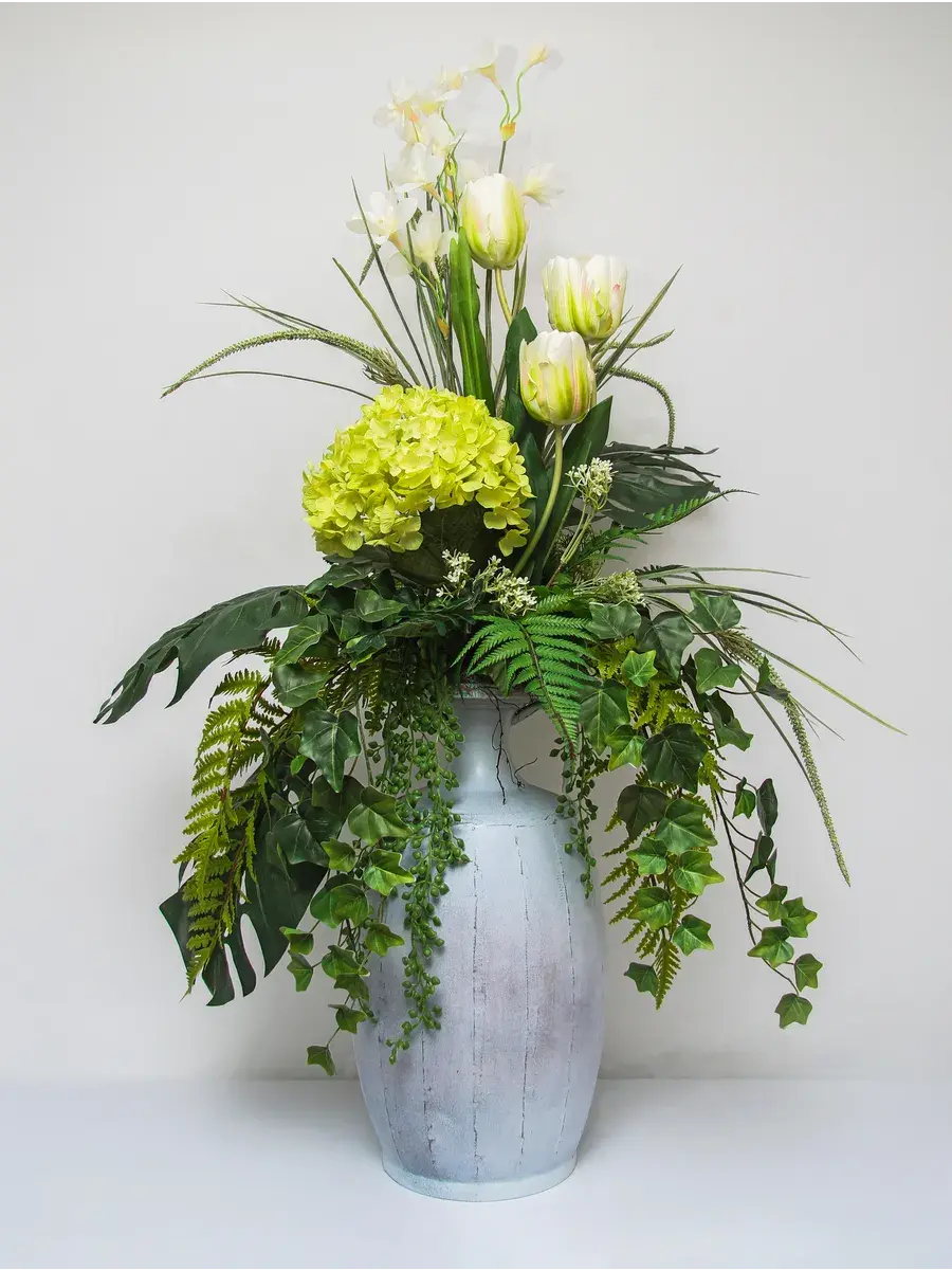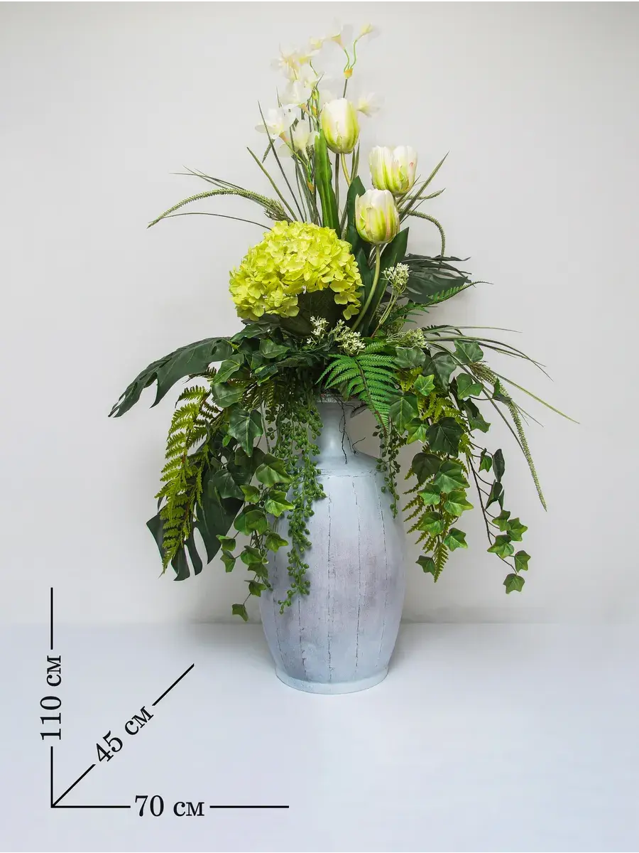 Цветочная композиция "Классика" в напольной вазе. Ваза с эффектом состаривания, искусственные растения надежно закреплены. Цветы для украшения полок, консолей, зимнего сада. Декор прекрасно дополнит декоративное окно или зеркало. Может устанавливаться на стол. Размер вазы 55*24 см, размер композиции целиком 110х70х45 см.