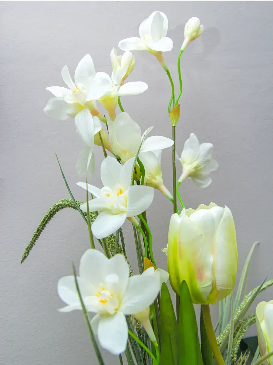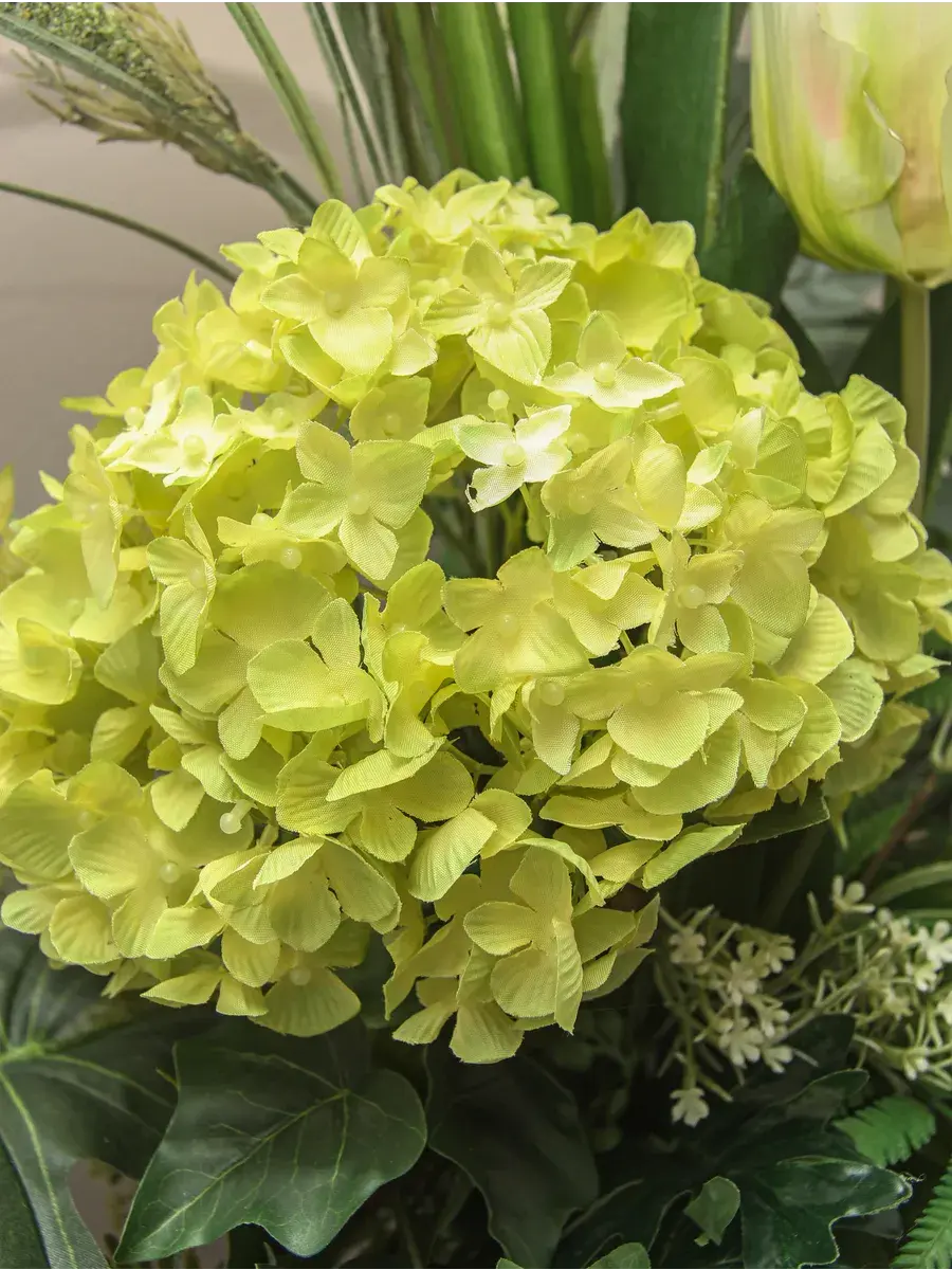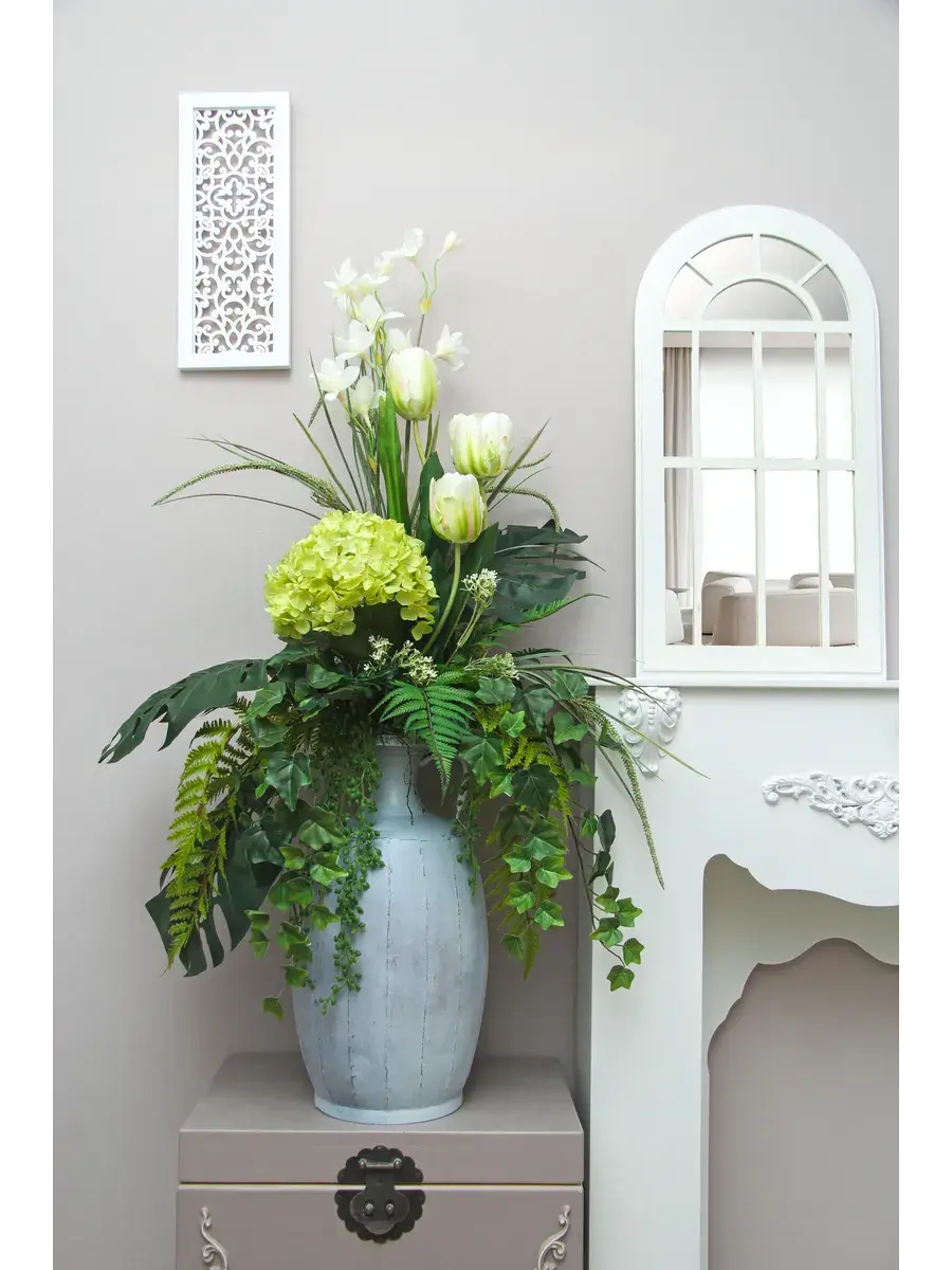 Цветочная композиция "Классика" в напольной вазе. Ваза с эффектом состаривания, искусственные растения надежно закреплены. Цветы для украшения полок, консолей, зимнего сада. Декор прекрасно дополнит декоративное окно или зеркало. Может устанавливаться на стол. Размер вазы 55*24 см, размер композиции целиком 110х70х45 см.