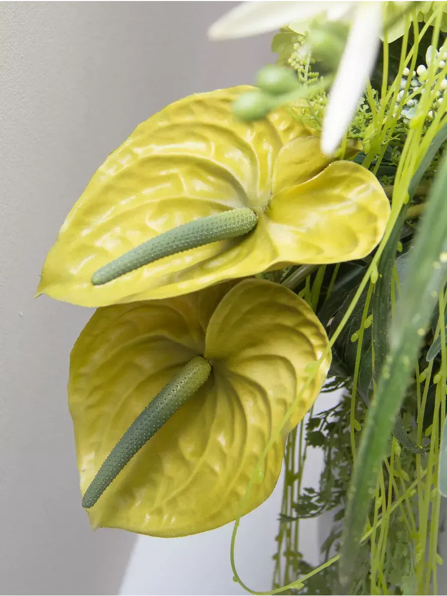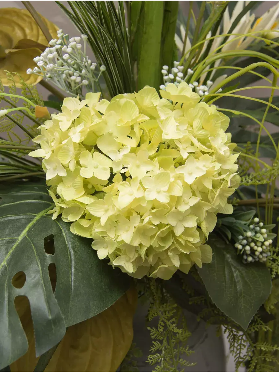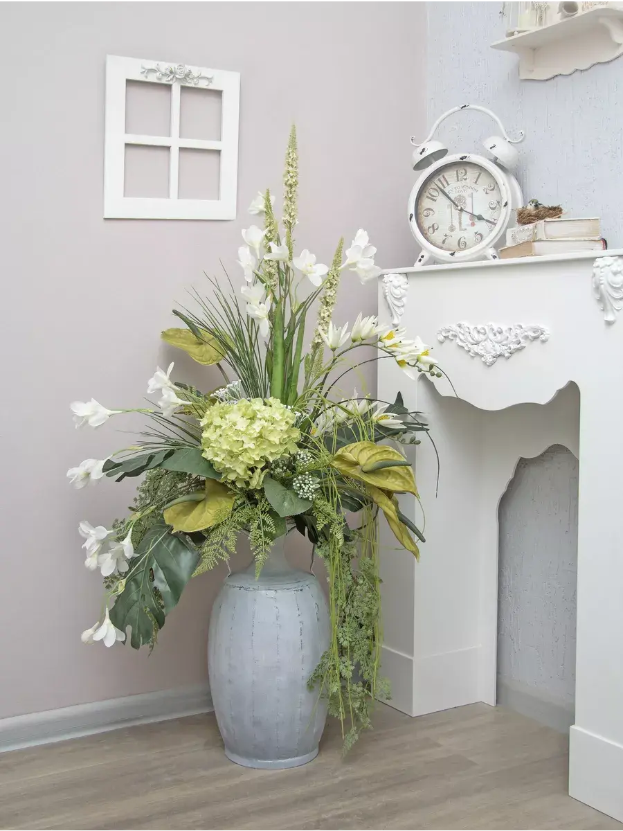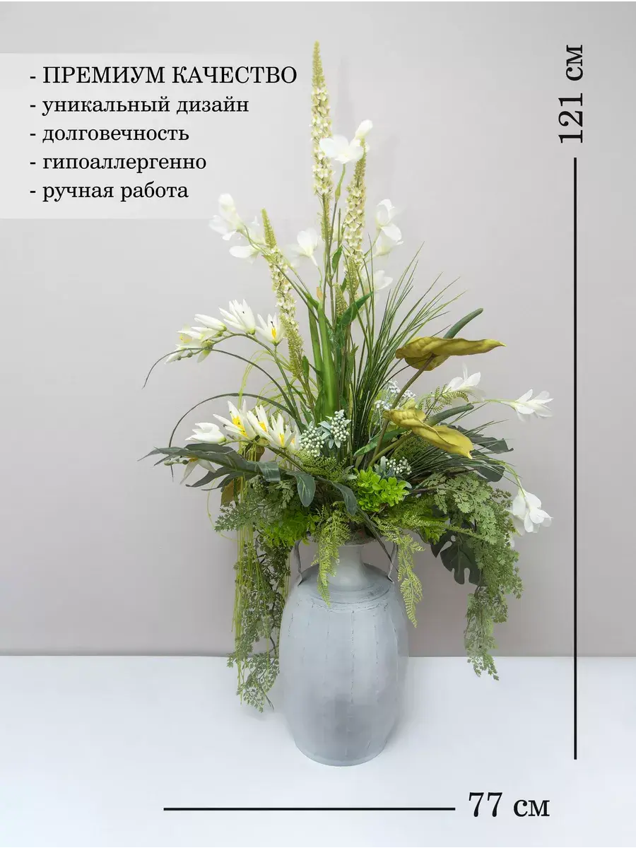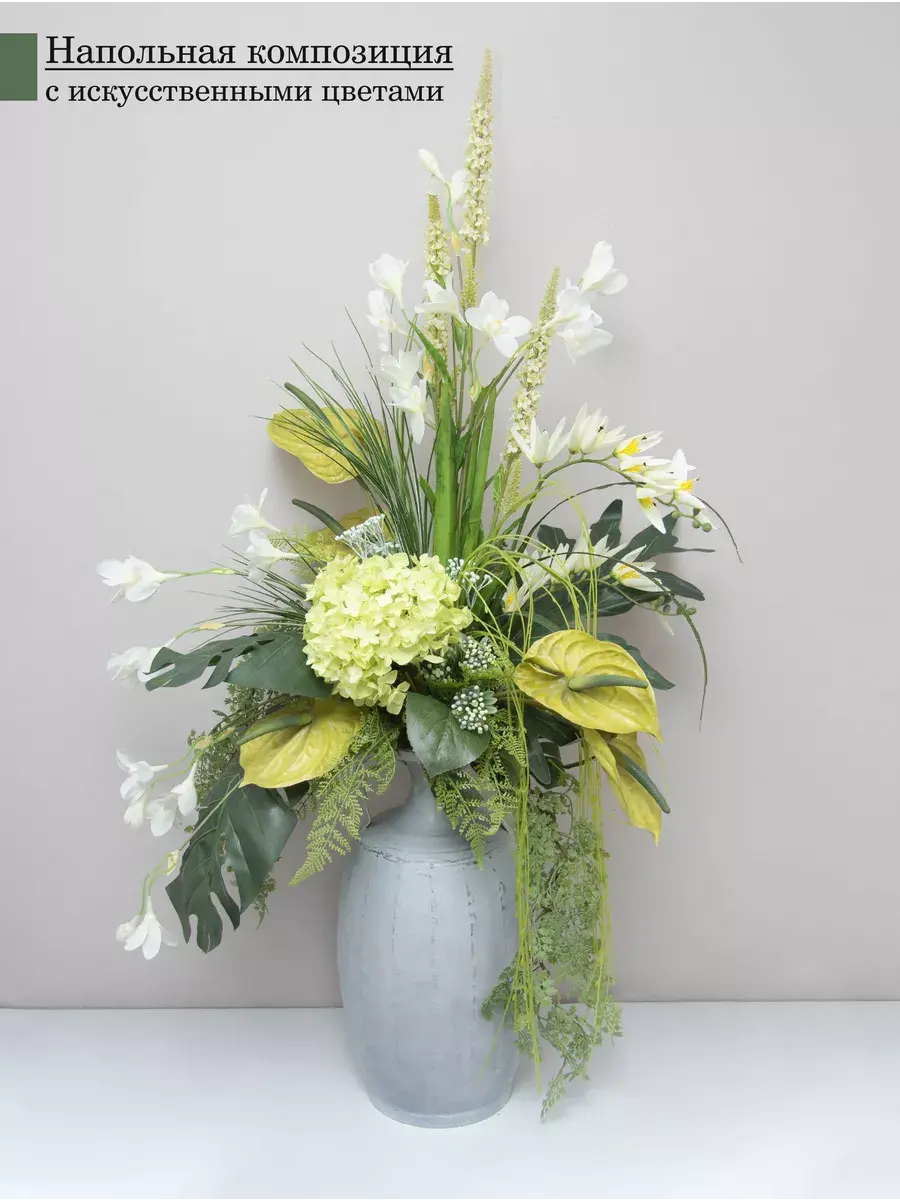 Цветочная композиция "Классика" в напольной вазе. Ваза с эффектом состаривания, искусственные растения надежно закреплены. Цветы для украшения полок, консолей, зимнего сада. Декор прекрасно дополнит декоративное окно или зеркало. Может устанавливаться на стол. Размер вазы 55*24 см, размер композиции целиком 121х77х46 см.