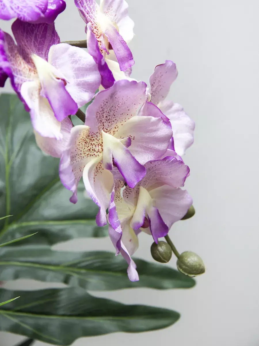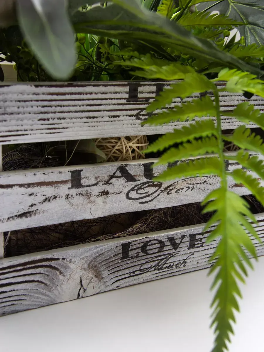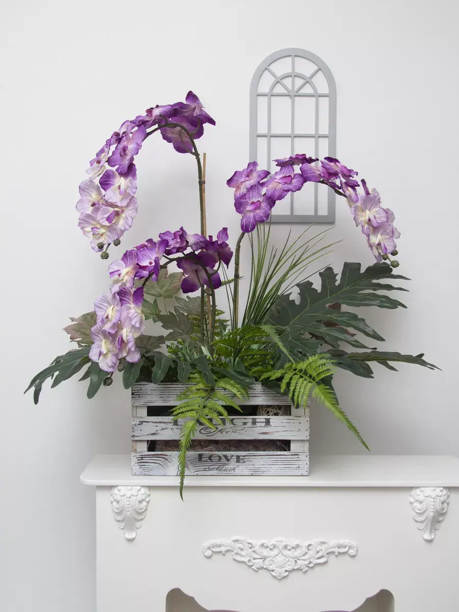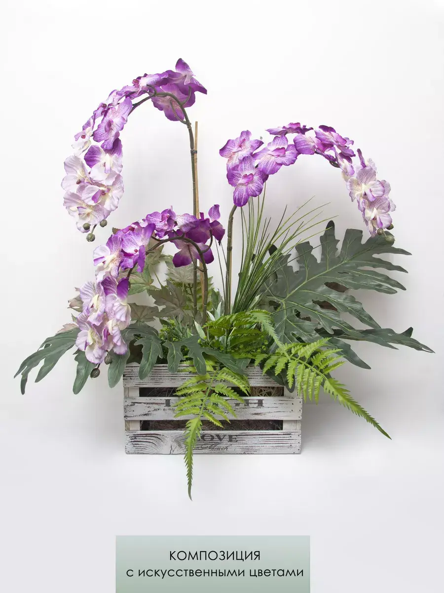 Цветочная композиция "орхидея Фаленопсис" в деревянном ящике. Искусственные растения надежно закреплены в ящике. Цветы для украшения полок, консолей, зимнего сада. Декор прекрасно дополнит декоративное окно или зеркало. Может устанавливаться на стол. Размер ящика 34х18х25 см, размер композиции целиком 80*80*65 см.