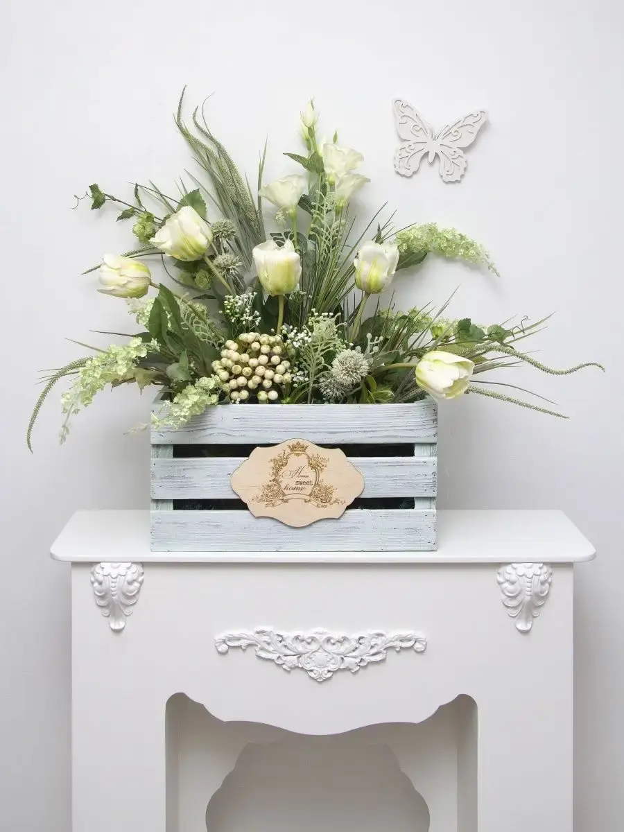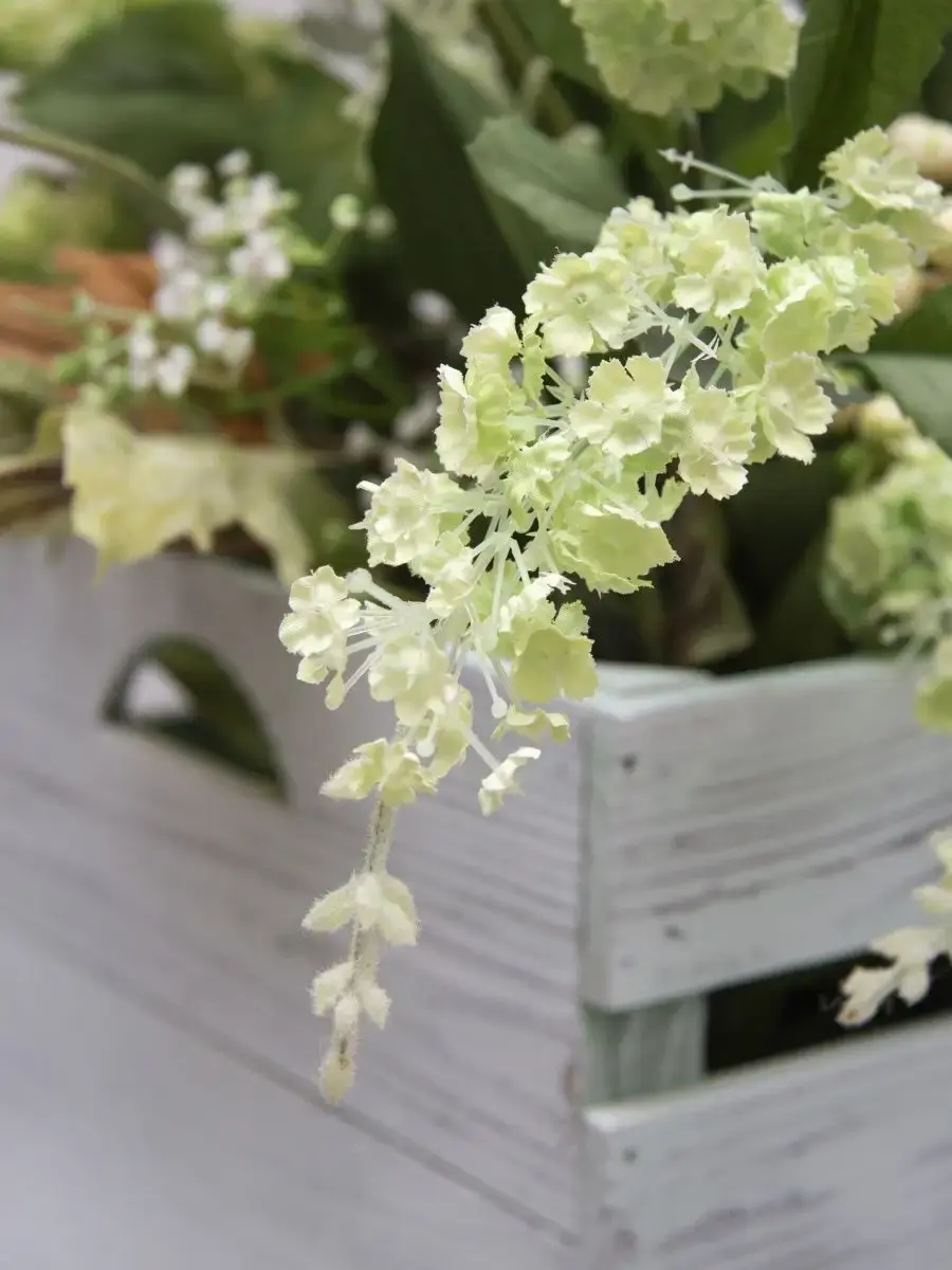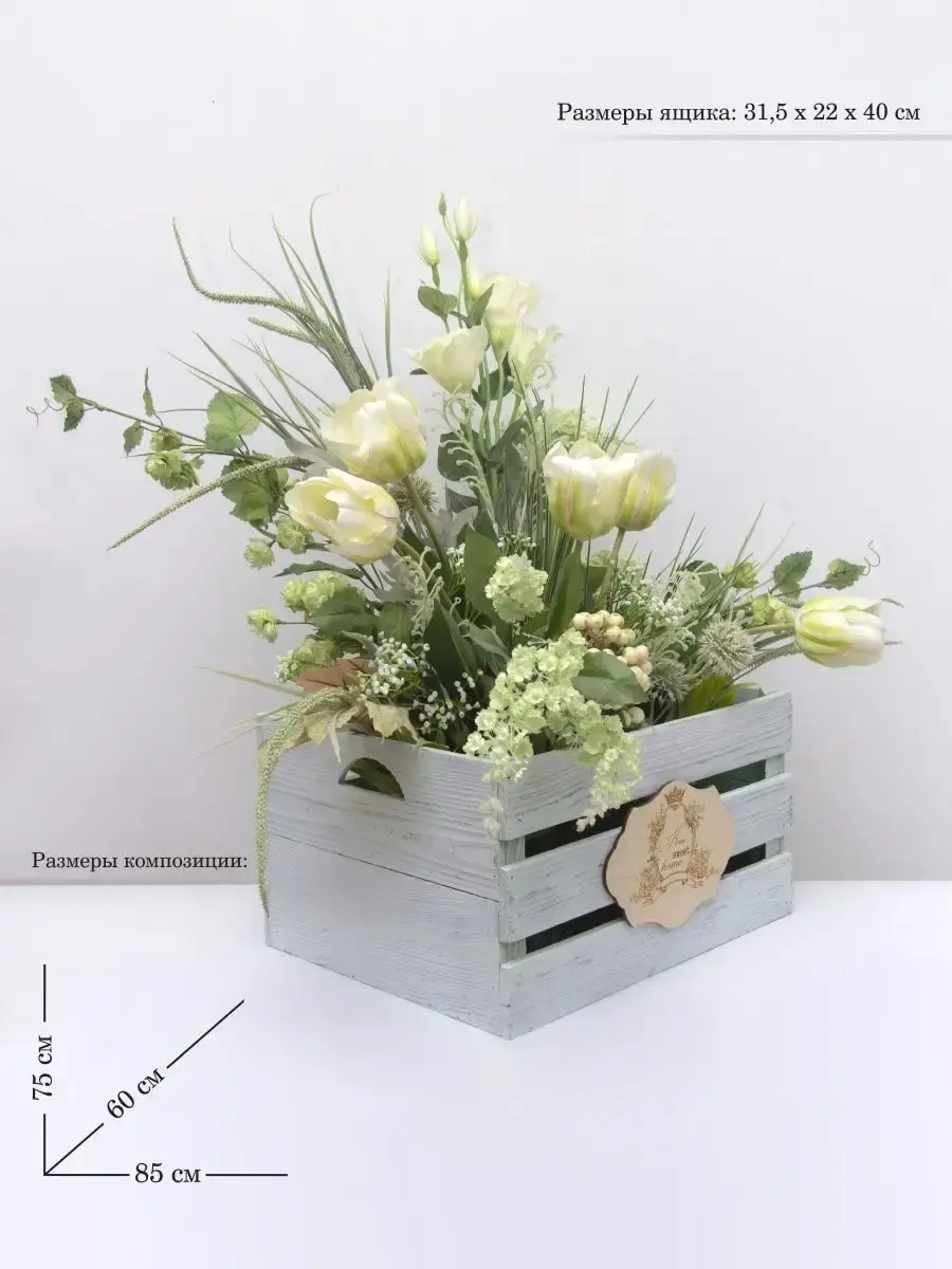 Цветочная композиция "Гортензия" в деревянном ящике. Ящик декорирован милым деревянным медальоном ручной работы с гравировкой, искусственные растения надежно закреплены в ящике. Цветы для украшения полок, консолей, зимнего сада. Декор прекрасно дополнит декоративное окно или зеркало. Может устанавливаться на стол. Размер ящика 40*22*31 см, размер композиции целиком 73*69*52 см.