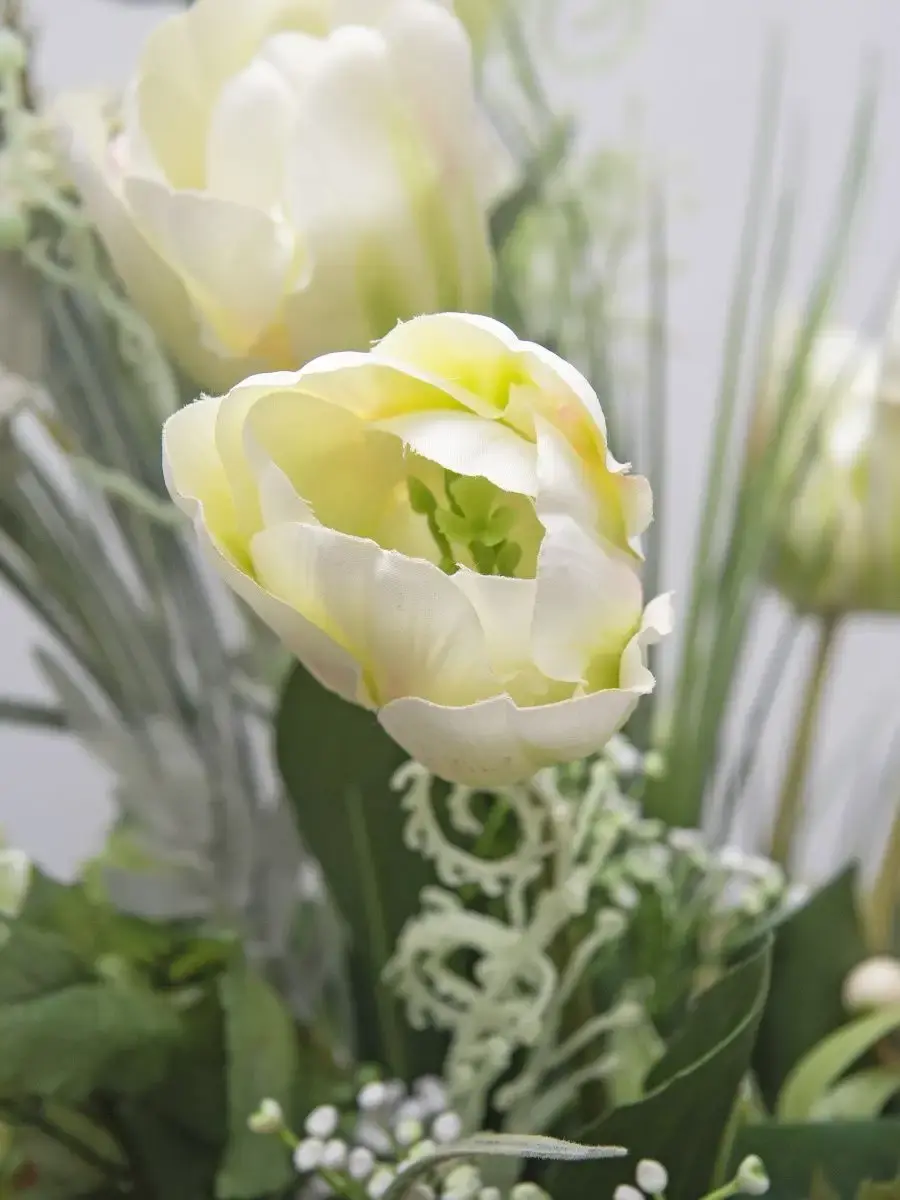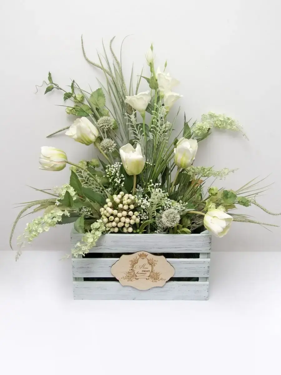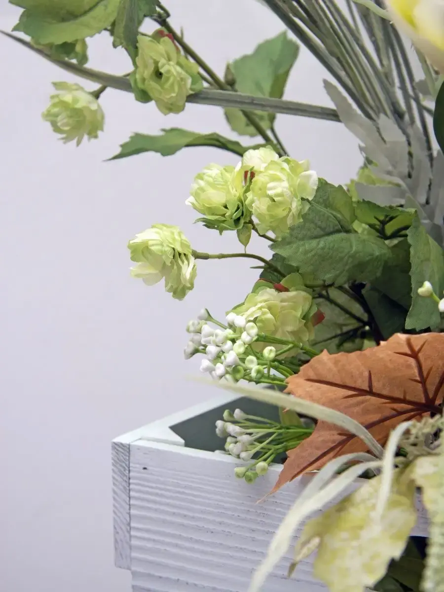 Цветочная композиция "Гортензия" в деревянном ящике. Ящик декорирован милым деревянным медальоном ручной работы с гравировкой, искусственные растения надежно закреплены в ящике. Цветы для украшения полок, консолей, зимнего сада. Декор прекрасно дополнит декоративное окно или зеркало. Может устанавливаться на стол. Размер ящика 40*22*31 см, размер композиции целиком 73*69*52 см.