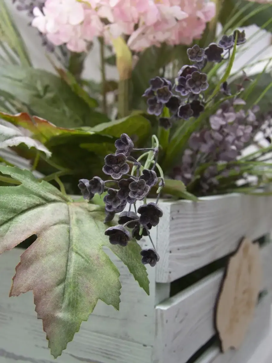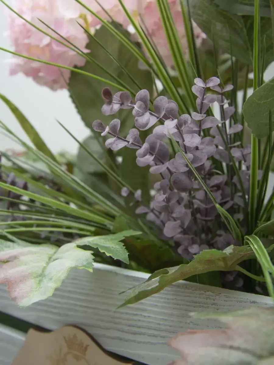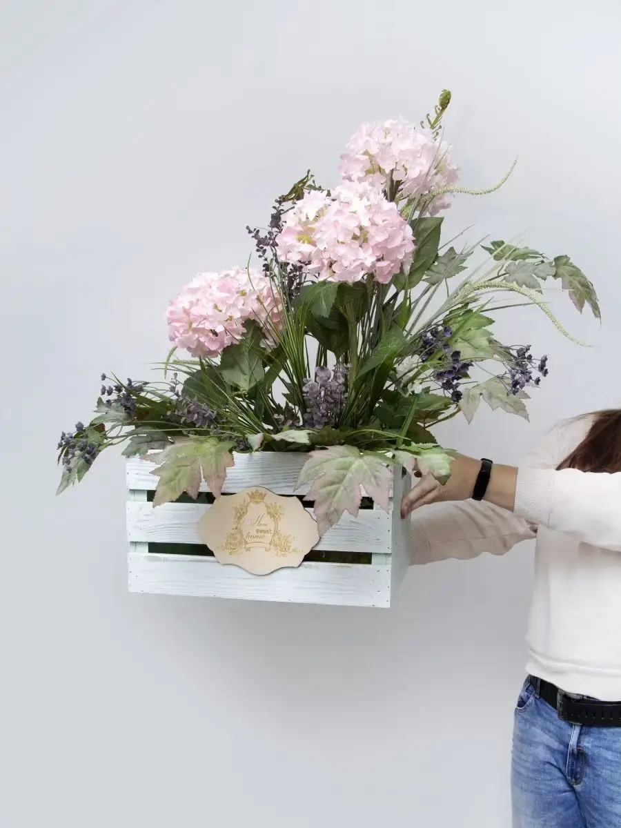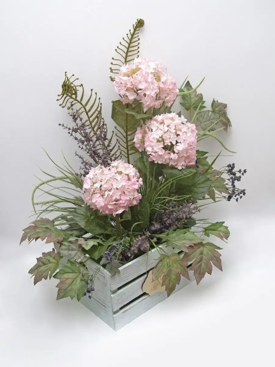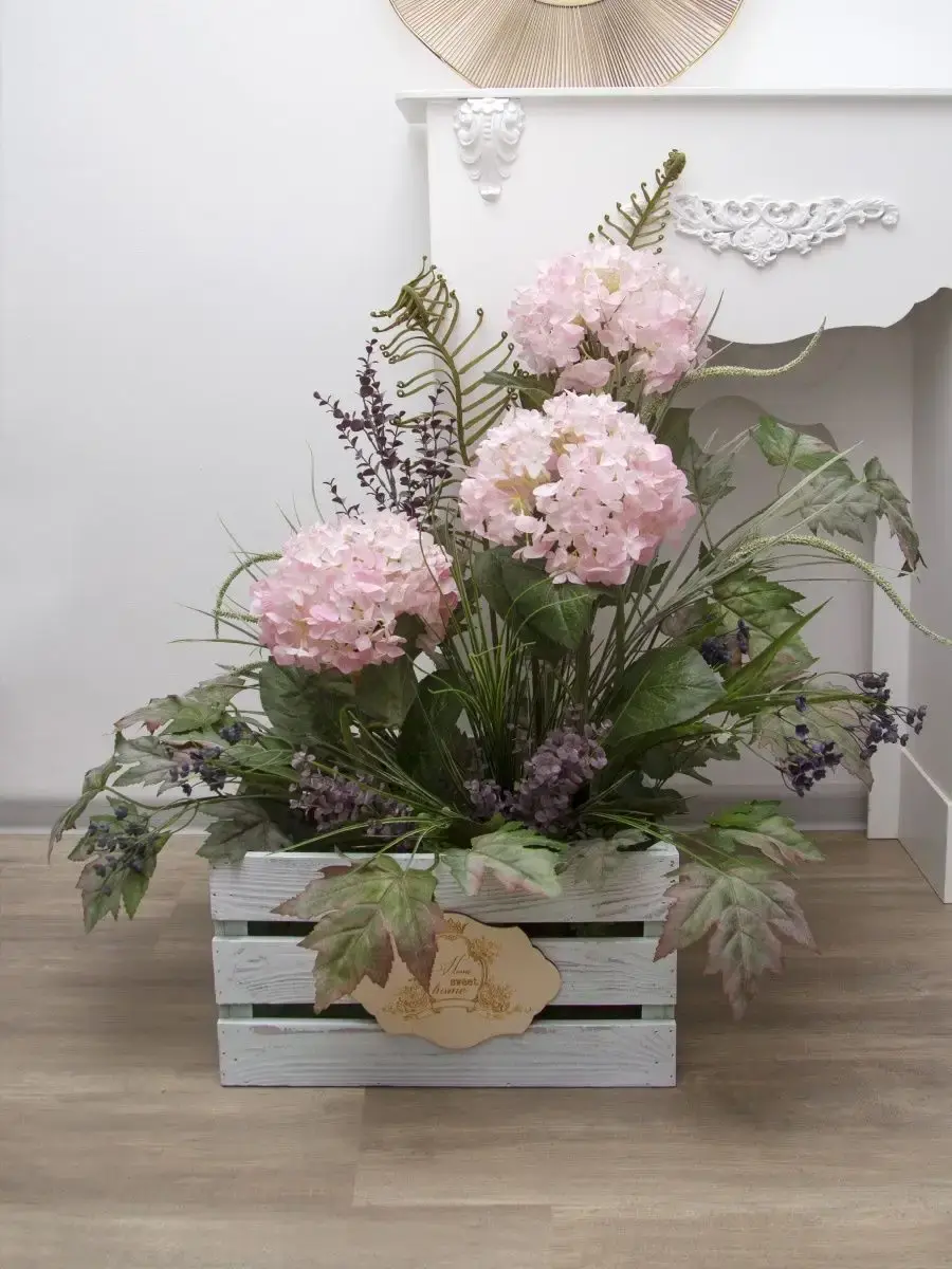 Цветочная композиция "Гортензия" в деревянном ящике. Ящик декорирован милым деревянным медальоном ручной работы с гравировкой, искусственные растения надежно закреплены в ящике. Цветы для украшения полок, консолей, зимнего сада. Декор прекрасно дополнит декоративное окно или зеркало. Может устанавливаться на стол. Размер ящика 40*22*31 см, размер композиции целиком 73*69*52 см.