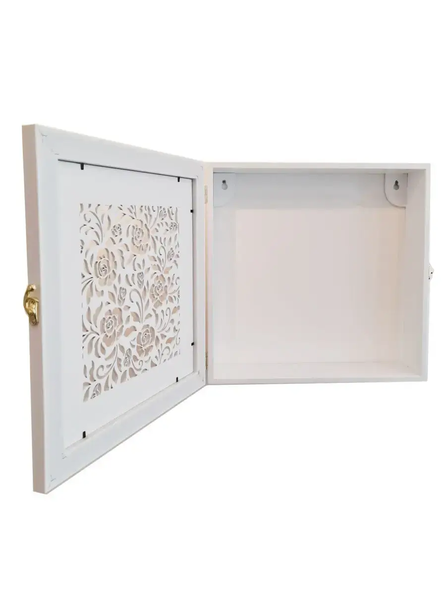 Декоративная полка в багетной раме с дверкой. Идеально подойдет для того, чтобы закрыть электрический щиток или какие-либо изъяны на стене. Может служить ключницей или просто украшать ваш дом. Дверца закрывается на замочек. Размер полки по внешнему краю 36х36см размер внутреннего пространвства 34,5х34,5*9 см. Максимальный размер щитка для размещения внутри полки 34,5*28,5*8,5 см.
