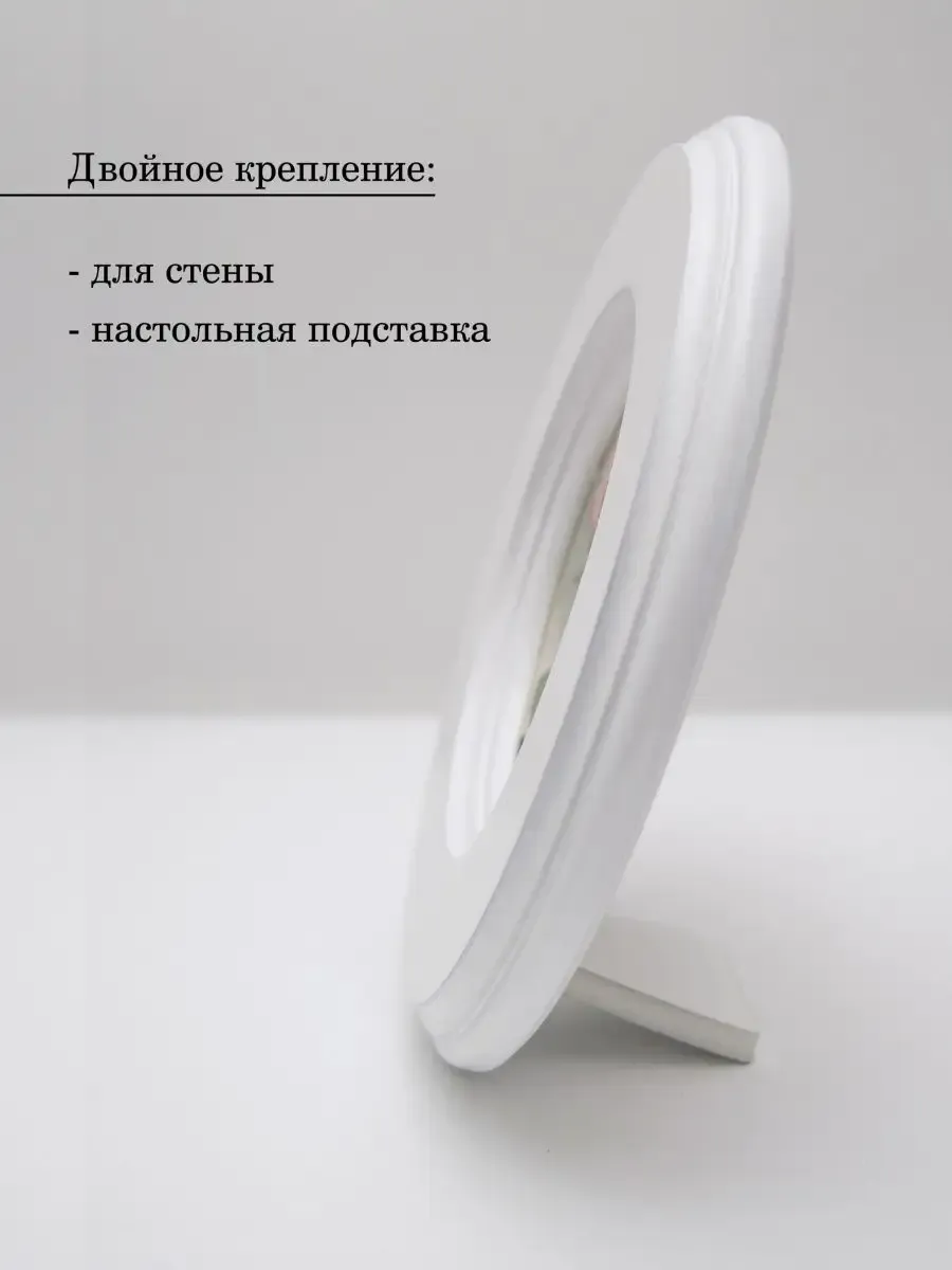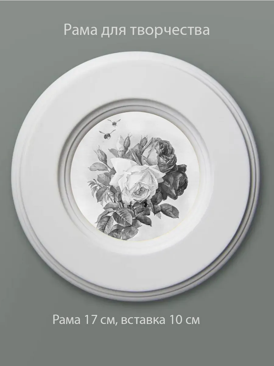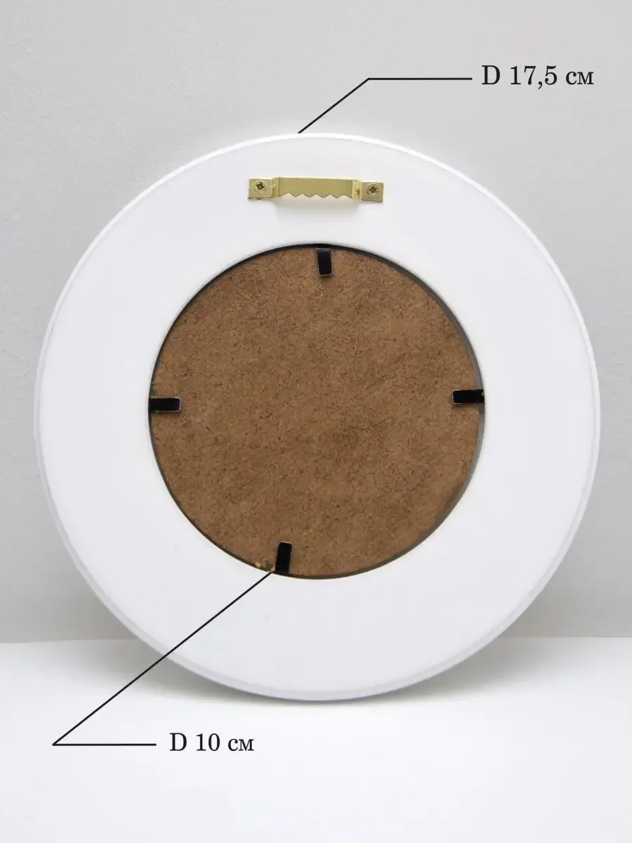 Рама цельная, без стыков и зазоров. Изготовлена из МДФ 16 мм, диаметр изображения - 9см., диаметр с рамой 17 см., размер оргалита в четверти 10см, с оргстеклом 0,6мм (необходимо снять защитную пленку). Окрашена акриловой эмалью без запаха. Рама подойдет для фотографий, рисунков, вышивки и других видов творчества. Крепление для стены и ножка в комплекте.