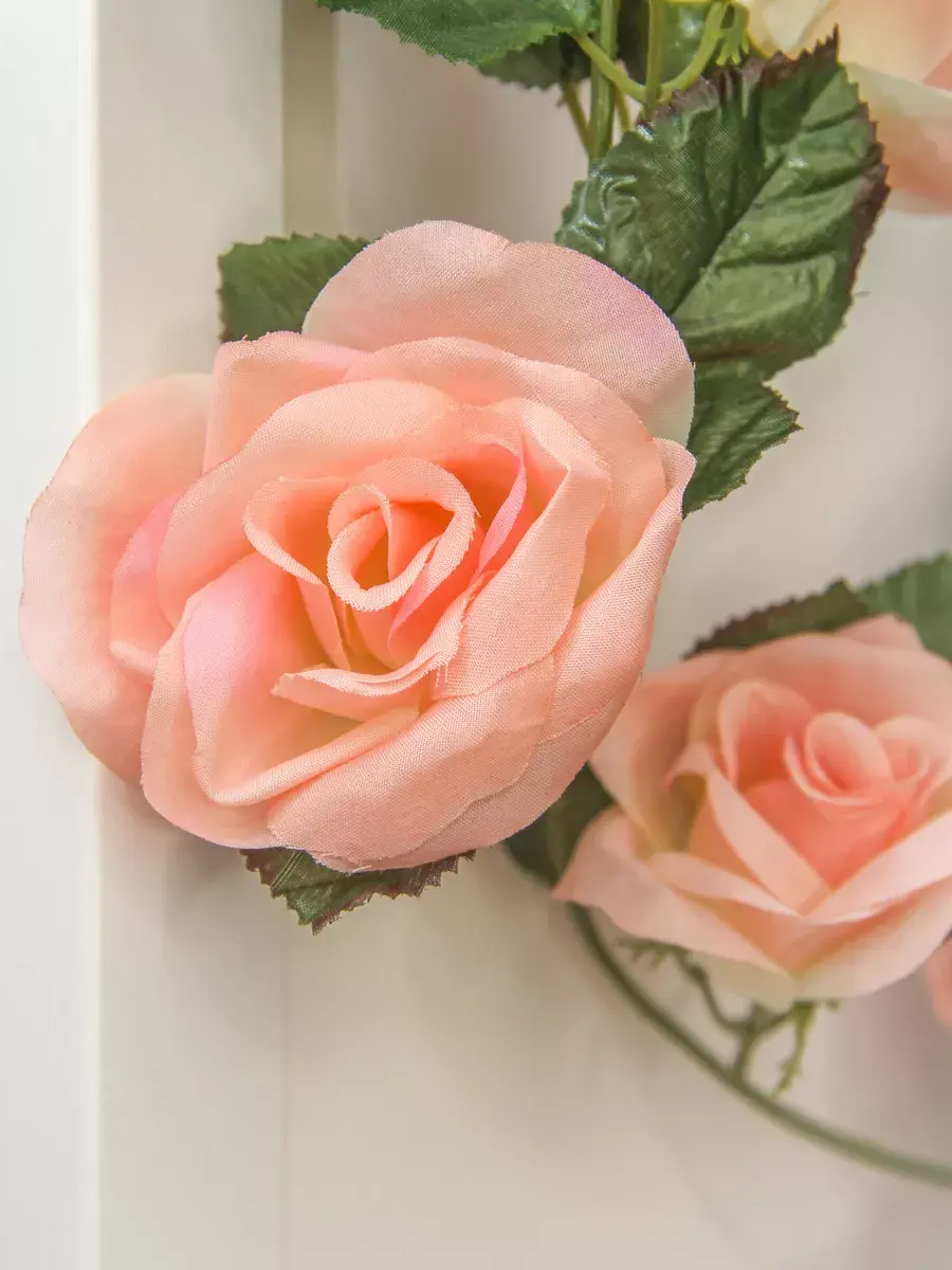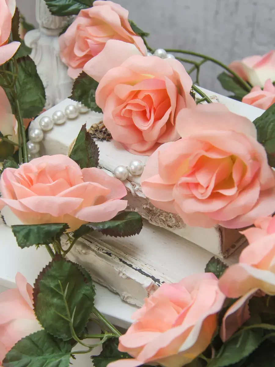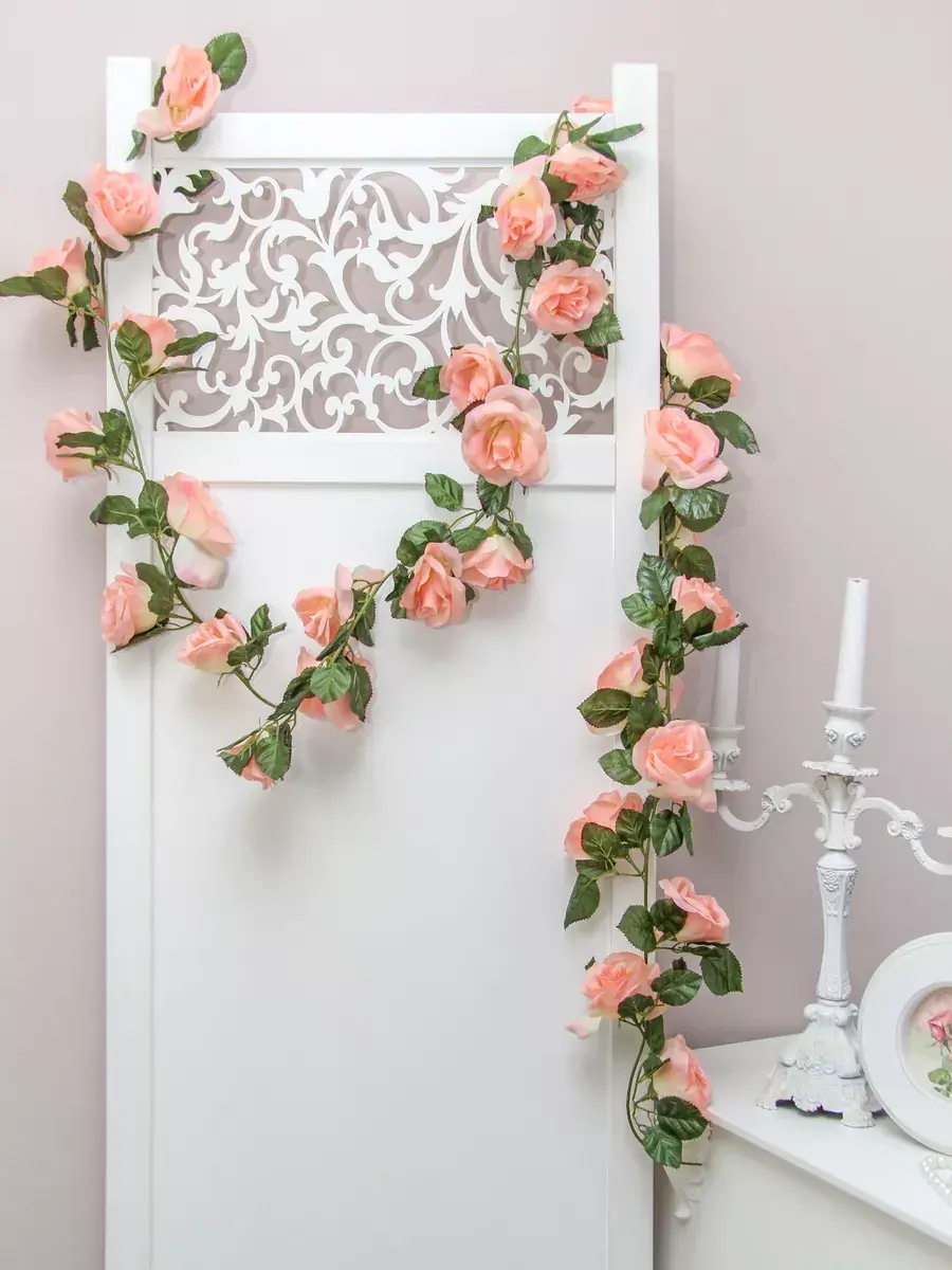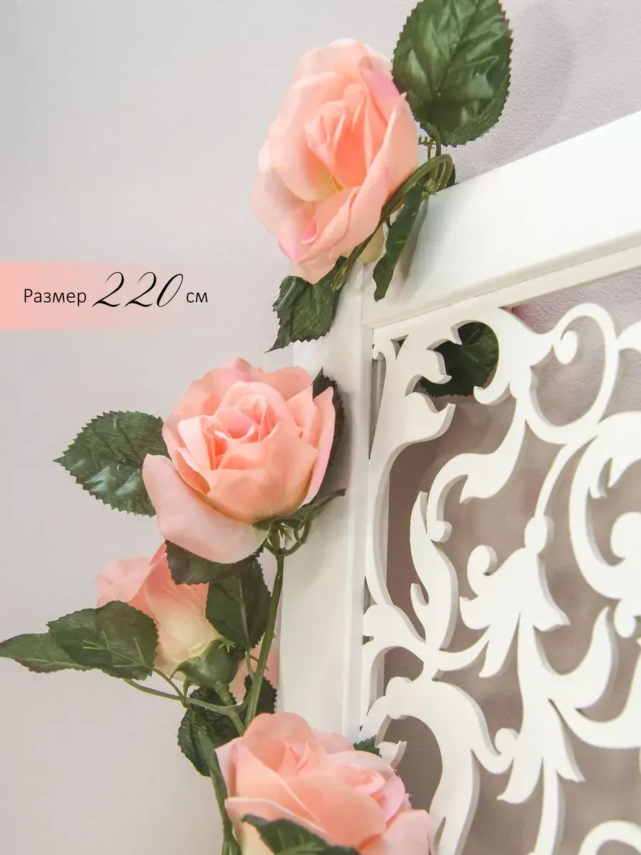Лиана изготовлена из высококачественных искусственных роз, просто в уходе (протирать влажной тканью, обдуть феном).