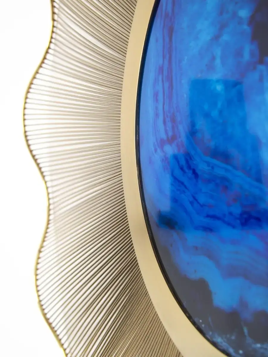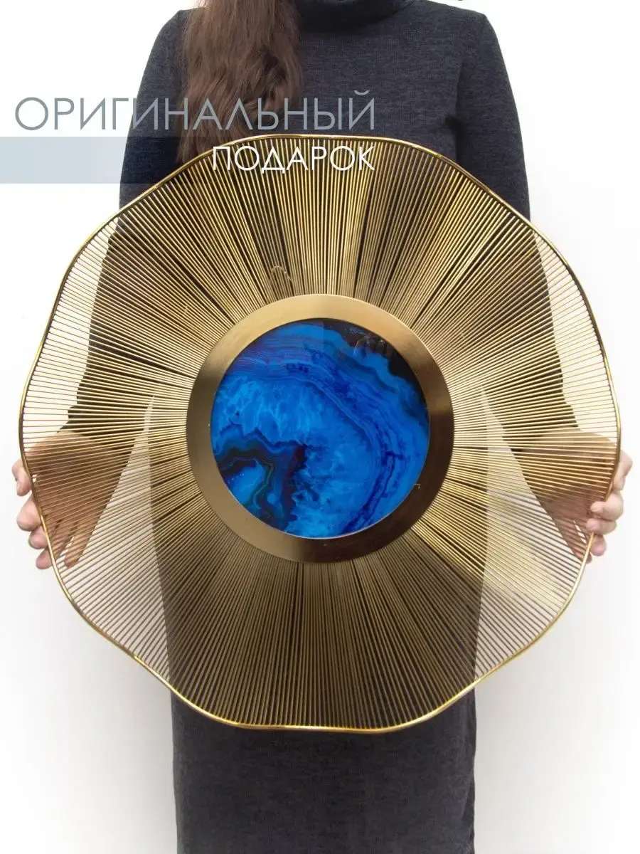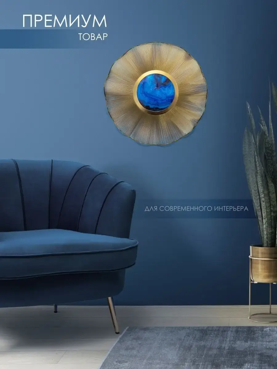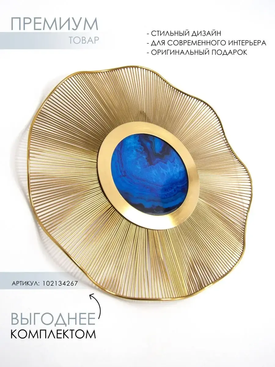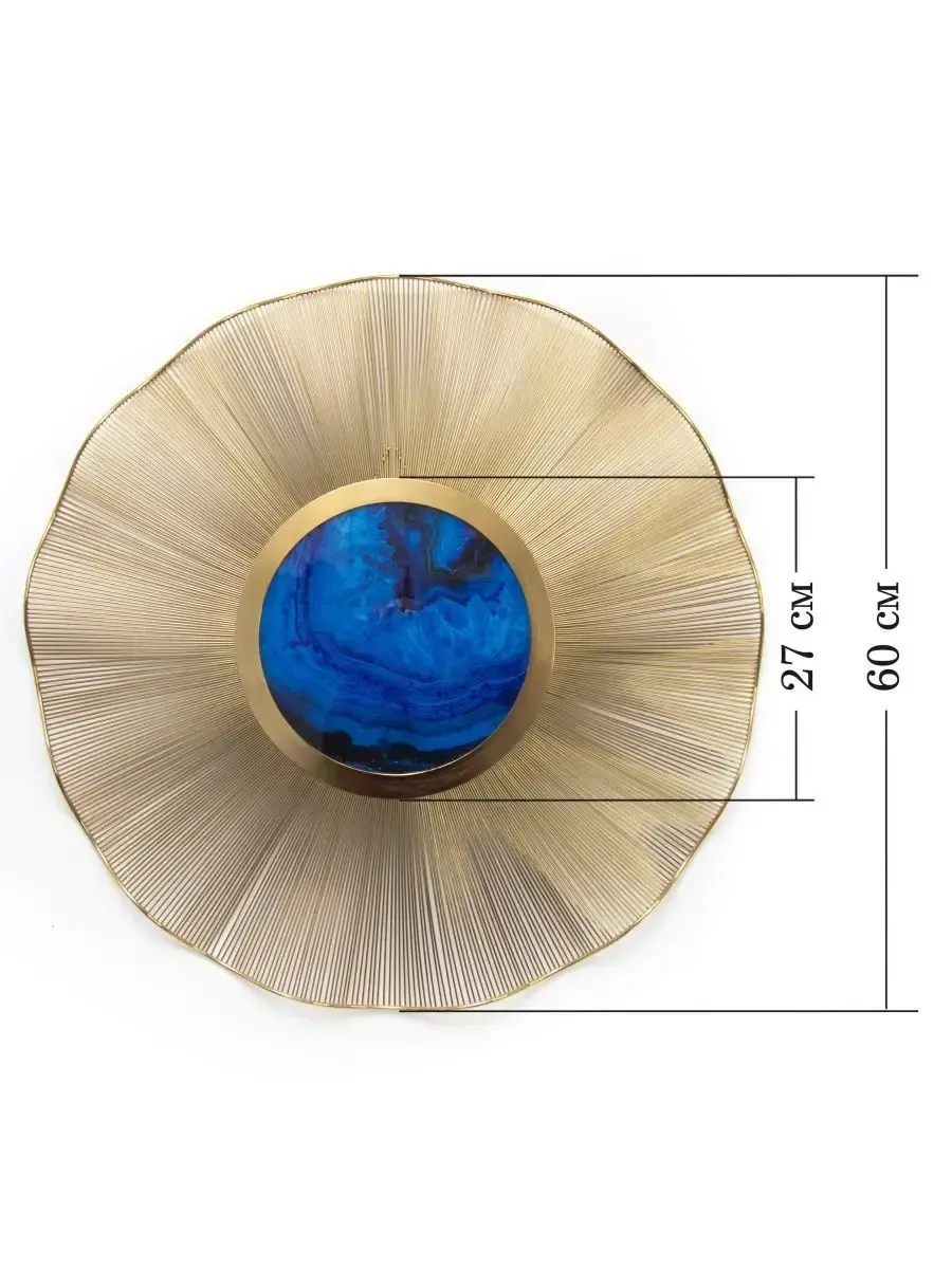 Настенный декор для современного интерьера. Большое металлическое настенное панно для современного интерьера дома, офиса, отеля или гостиниц. Настенная художественная скульптура, металлический солнечный цветок с акцентом "Голубая планета". Золотое металлическое панно со вставкой из синего материала под камень или натурального зеркала. Панно представлены в трех размерах: 75 см, 60 см, 46 см и комплект из трех панно разного размера. Настенный Арт объект украсит интерьер гостиной, прихожей, спальной комнат. Оформление стен этими панно подойдет для любого интерьера, универсальные цвета золотой, синий. Металлический декор для стен добавляет вашему интерьеру много блеска, освежающего ощущения природы и создает непринужденную атмосферу. Это идеальный выбор для современного дома. Художественный цветок ручной работы с ручной росписью - лучший подарок для друзей и семьи. Подарки на новоселье или свадьбу. Украсьте свой дом или сад этим потрясающим 3D-декором для стен в форме цветка. Декор изготовлен из металла, имеет идеальную форму, сварен из гладких металлических спиц, а затем отполирован. Подходит для любых чистых и гладких стен, плитки, окон, металла, пластика и шкафов. Это филигранное металлическое настенное искусство ручной работы с мягким кованым железом выглядит роскошно, является лучшим выбором для вашего внутреннего и наружного декора.
