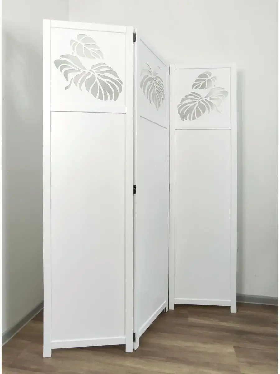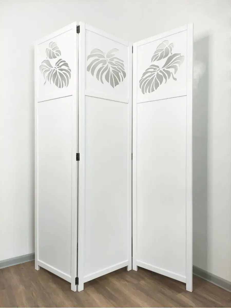 Ширма напольная с резными вставками "Листья монстеры". Деревянная ширма - перегородка для зонирования помещений, студий, современных интерьеров. Рама ширмы выполнена из массива сосны ширина 4 см. и толщиной 2см., покрыта натуральным акриловым лаком. Вставки из березовой фанеры 4 мм. Ширма дополнит и украсит интерьер квартиры, загородного дома, салона красоты. Ширма продается в собранном виде. Вам останется только достать из коробки, снять упаковку и поставить ее на выбранное место. Размер створки ширмы 1800х480 мм. В развернутом виде трехстворчатая ширма шириной 144см. Ширма изготовлена в России.