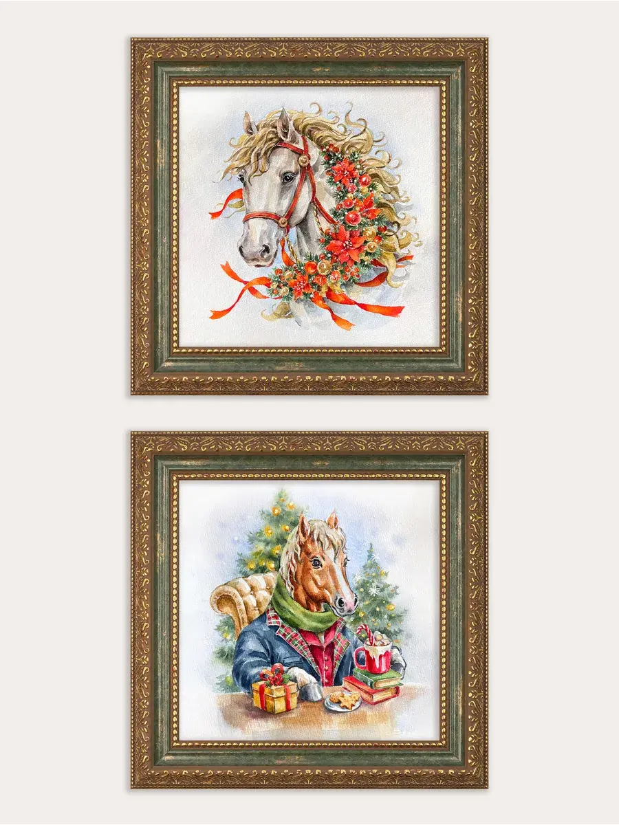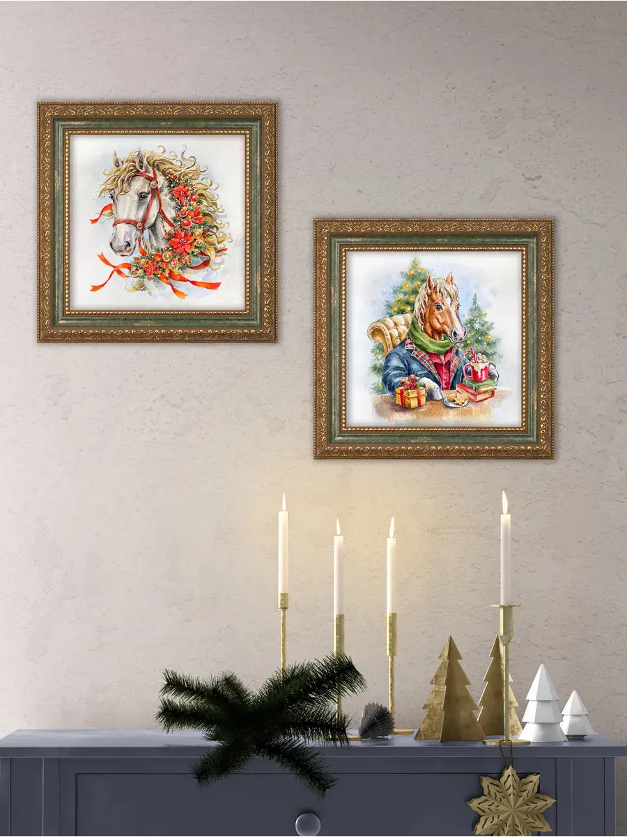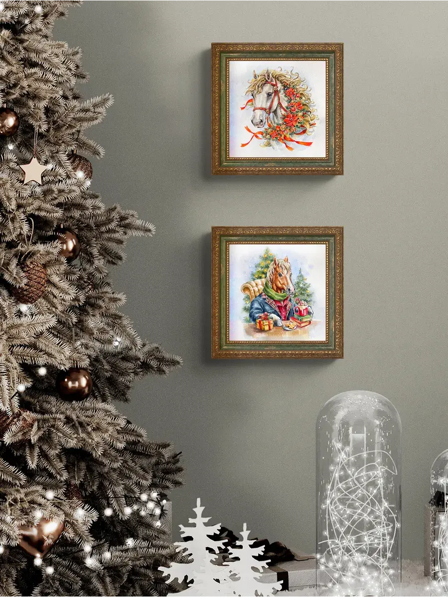 Символ наступающего 2026 года - огненная лошадь. Набор картин от Elenadecor с изображением красивых лошадок - прекрасный подарок на торжество любимым родственникам или дорогим друзьям! Картины напечатаны на натуральном холсте. Размер изображения 20*20 см, размер картины целиком 26*26 см. Багетная рама в классическом стиле придает картинам праздничный законченный вид. Удивите своих гостей необычным уникальным подарком - подарите им частичку красоты, которая привнесет в дом новогоднего настроения.