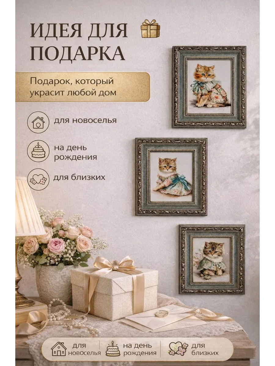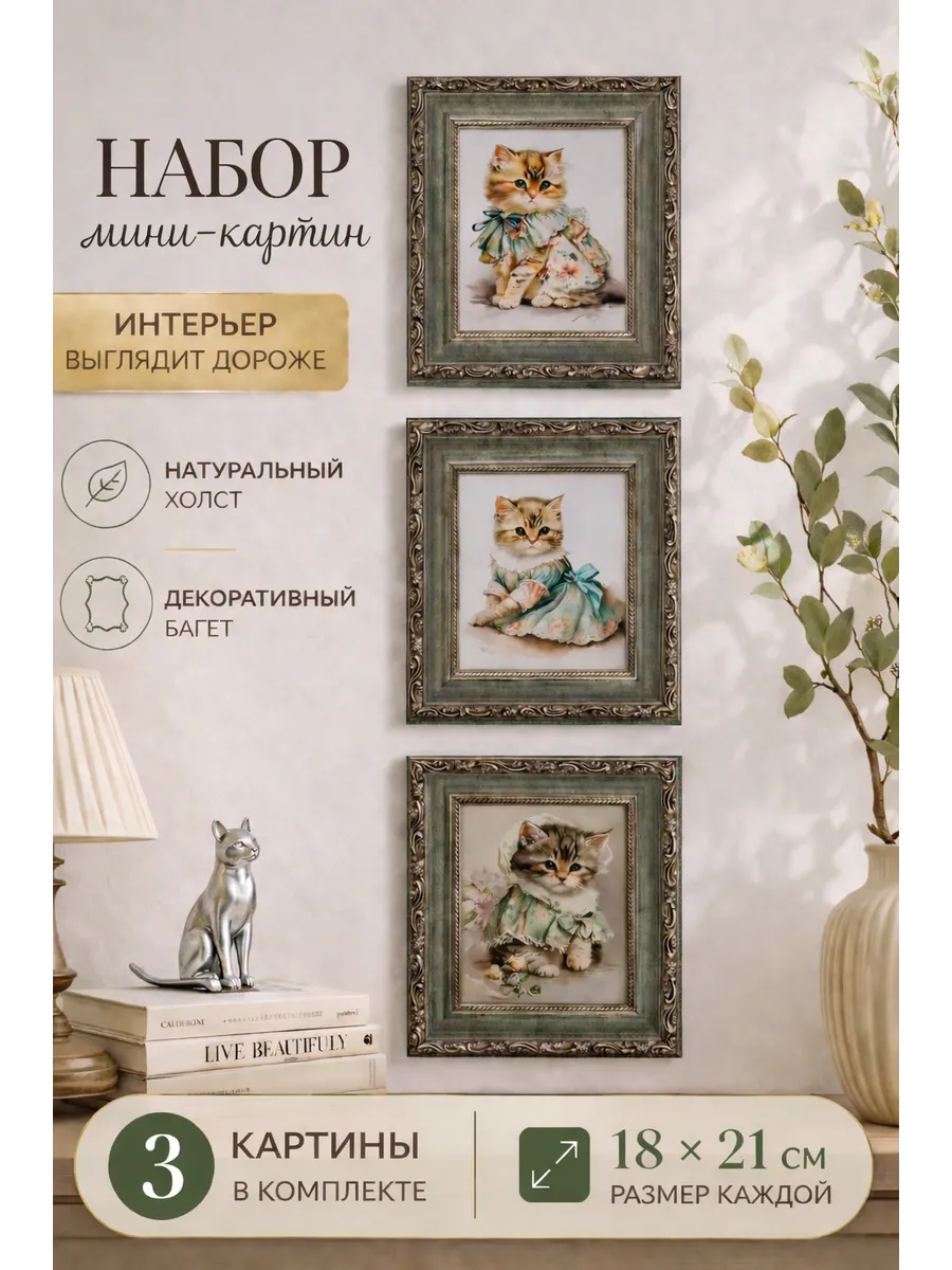 Набор декоративных мини-картин с котиками — это очаровательный элемент декора, который наполнит интерьер уютом и теплом. Милые винтажные иллюстрации с котятами создают атмосферу нежности и спокойствия, делая пространство более живым и гармоничным. Такой декор для дома легко станет стильным акцентом в любой комнате.
