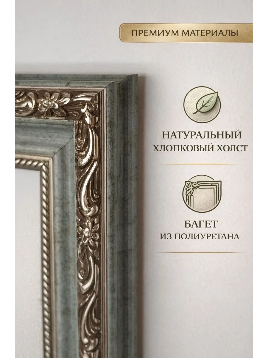 Картины выполнены на натуральном хлопковом холсте, благодаря чему изображение выглядит глубже, а текстура добавляет ощущение настоящей художественной работы. Каждая картина оформлена в декоративный багет из полиуретана, который отличается прочностью, долговечностью и аккуратным внешним видом. Рамы выглядят элегантно и придают композиции завершённость.