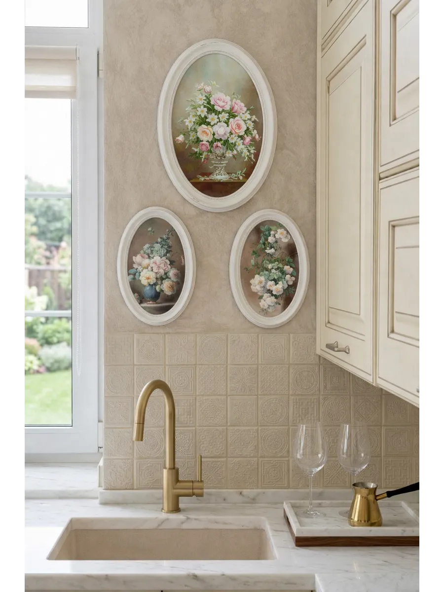 Овальные рамы подчеркивают классическую эстетику и добавляют интерьеру нотки французского прованса. Такой декор особенно красиво смотрится в светлых интерьерах, в комнатах с текстилем, деревом и пастельными оттенками.