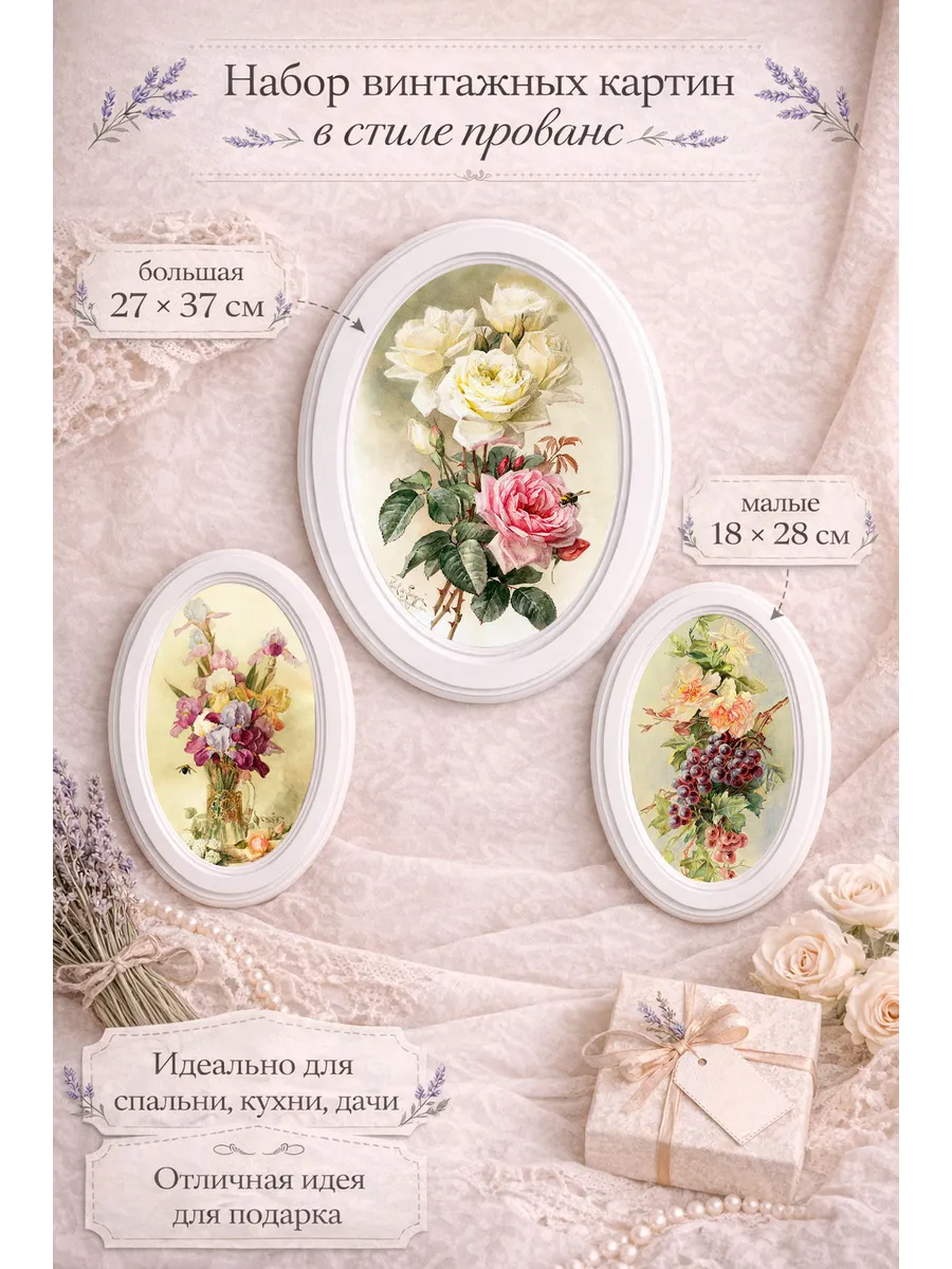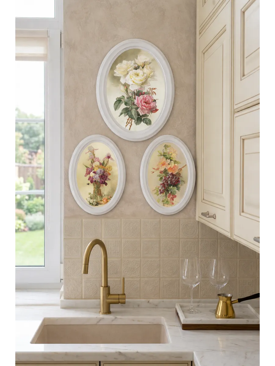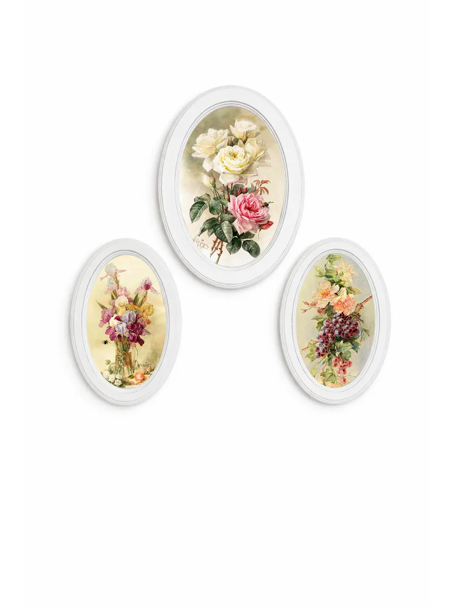 Элегантный набор из трёх картин в овальных рамах станет изысканным акцентом в интерьере и наполнит пространство атмосферой уюта и романтики. Нежные иллюстрации в винтажном стиле с цветами создают теплое настроение и прекрасно подходят для оформления спальни, кухни, гостиной или дачного дома.