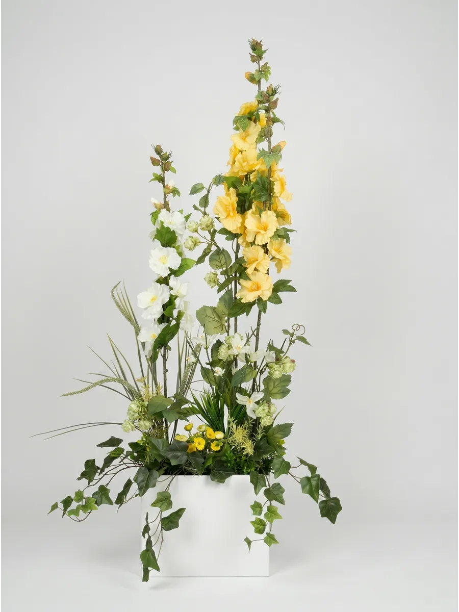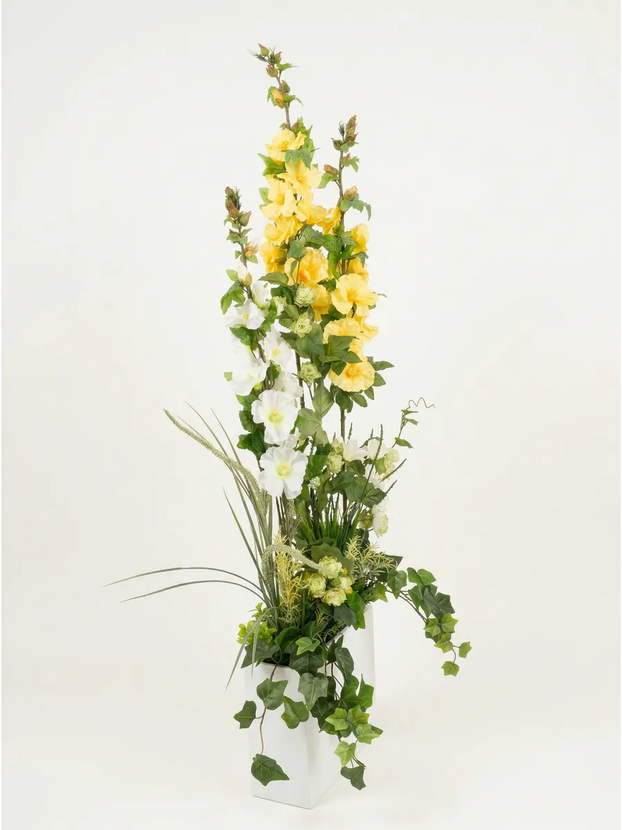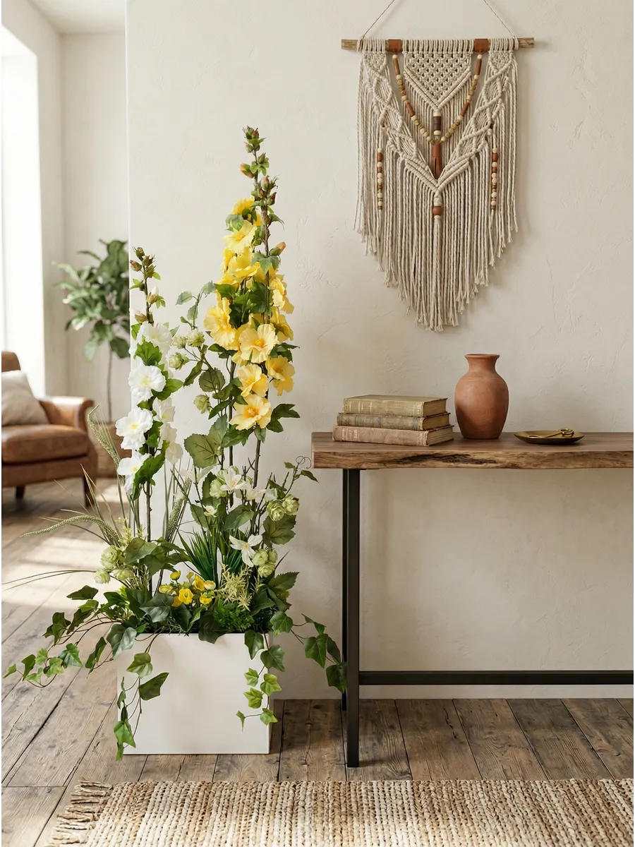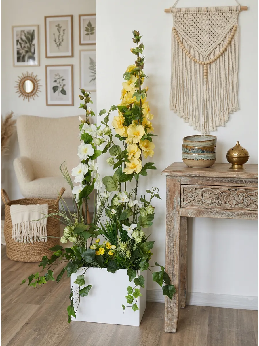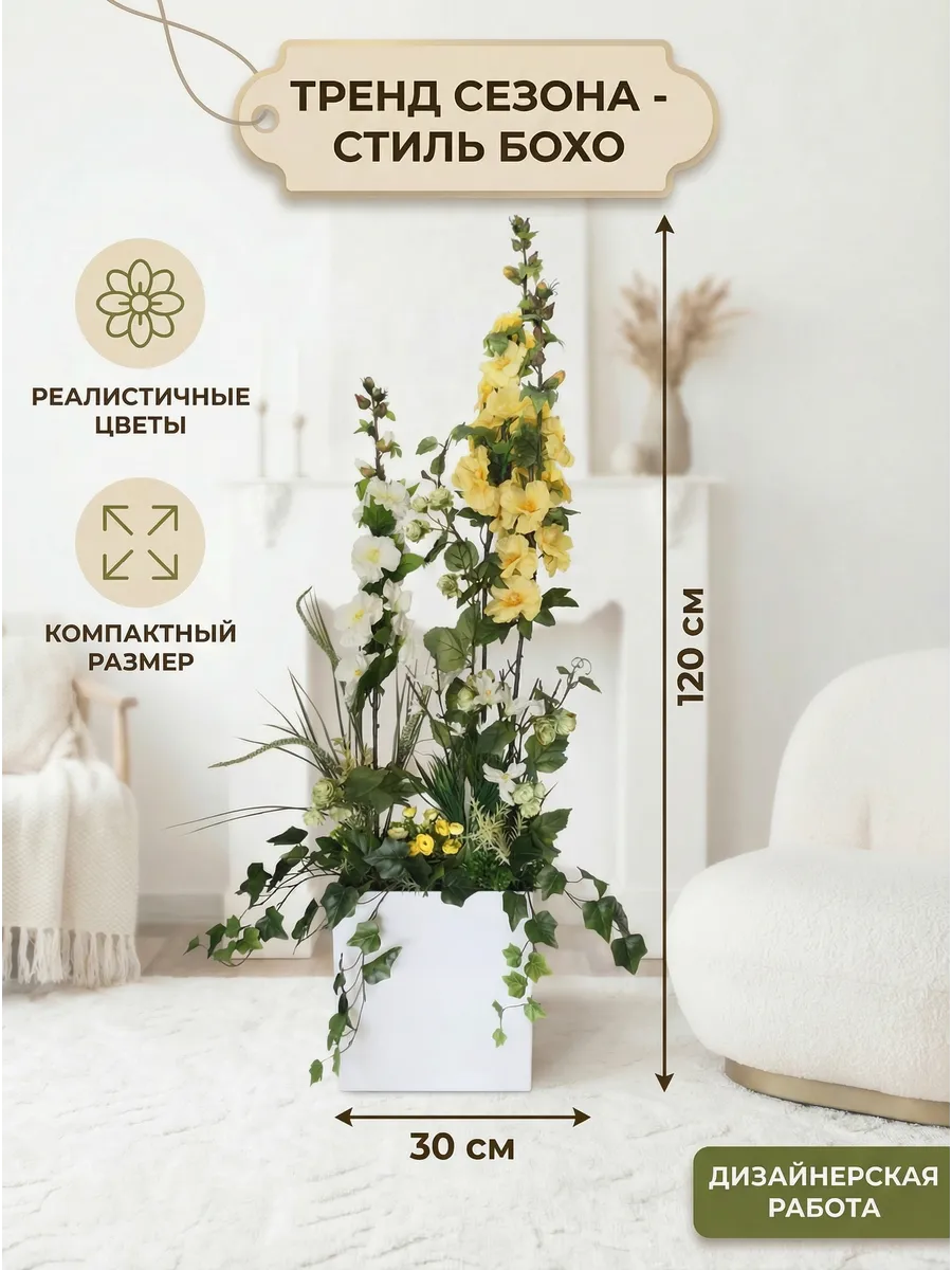 Цветочная композиция "Ящик с мальвой" от Elenadecor - это стильное и качественное украшение, которое добавит уютную атмосферу в любую комнату. Благодаря реалистичности искусственных растений, эта композиция выглядят как настоящая, но при этом не требуют особого ухода. Декоративные растения впишутся в любой дизайн, создавая акценты и украшая пространство. Композиция идеально подойдет для тех, кто хочет добавить зелень в свой дом, не заботясь о поливе и уходе. Благодаря своим возможностям, эти украшения с легкостью преобразят вашу комнату, создавая уютную и стильную атмосферу.