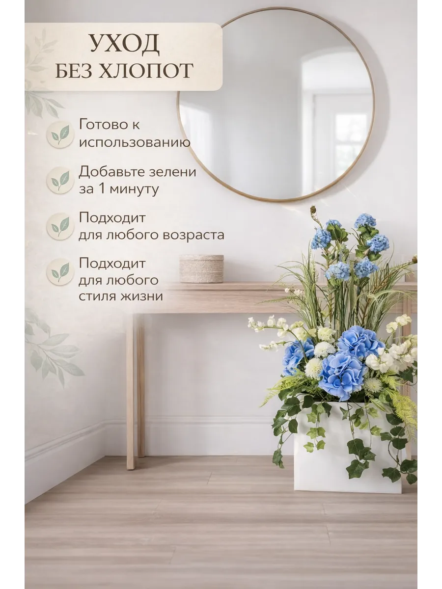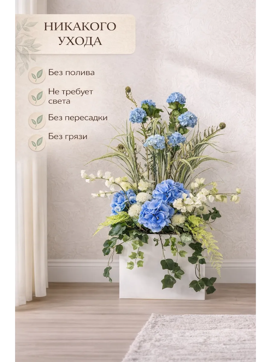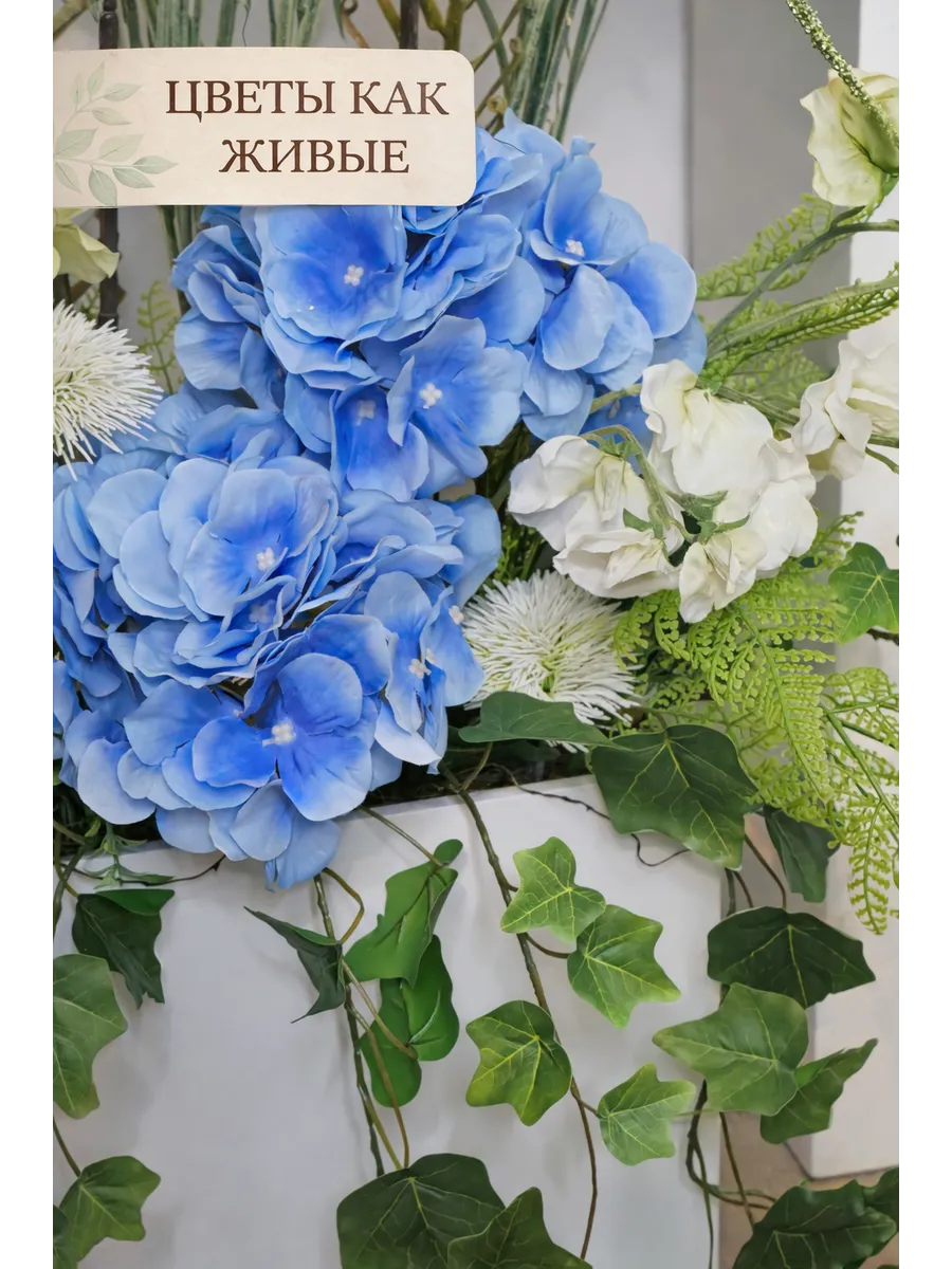 Цветочная композиция "Ящик с голубой гортензией" от Elenadecor - это стильное и качественное украшение, которое добавит уютную атмосферу в любую комнату. Благодаря реалистичности искусственных растений, эта композиция выглядят как настоящая, но при этом не требуют особого ухода. Декоративные растения впишутся в любой дизайн, создавая акценты и украшая пространство. Композиция идеально подойдет для тех, кто хочет добавить зелень в свой дом, не заботясь о поливе и уходе. Благодаря своим возможностям, эти украшения с легкостью преобразят вашу комнату, создавая уютную и стильную атмосферу.