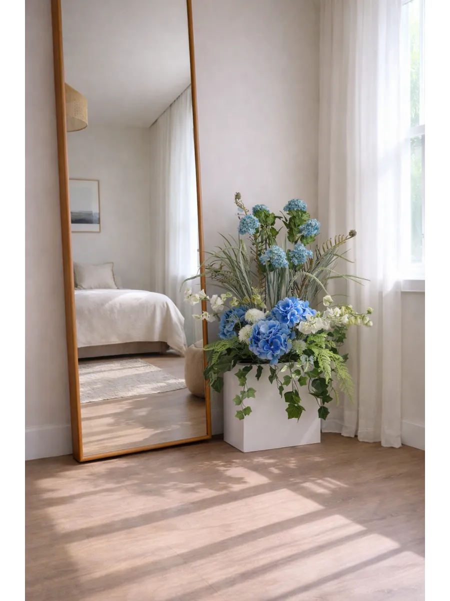 Большая напольная композиция из искусственных растений в деревянном ящике. Станет прекрасным дополнением интерьера или отдельным акцентом у камина, большого зеркала, в прихожей, где живым цветам мало света. Ящик изготовлен из березовой фанеры, покрыт акриловой эмалью без запаха. Размер ящика ш30*в25*г11 см. Размер композиции целиком 95*74*47 см. Цветы надежно закреплены в ящике.