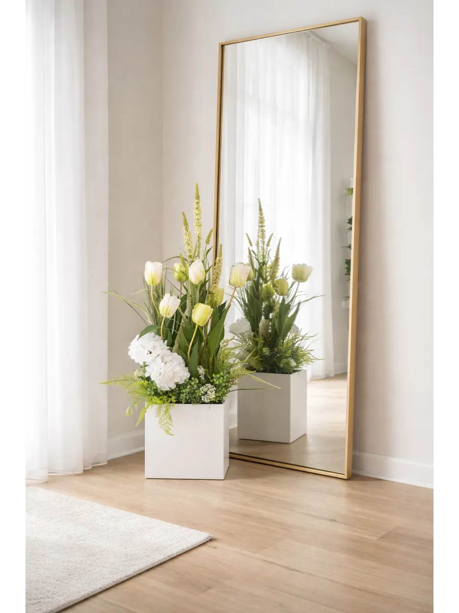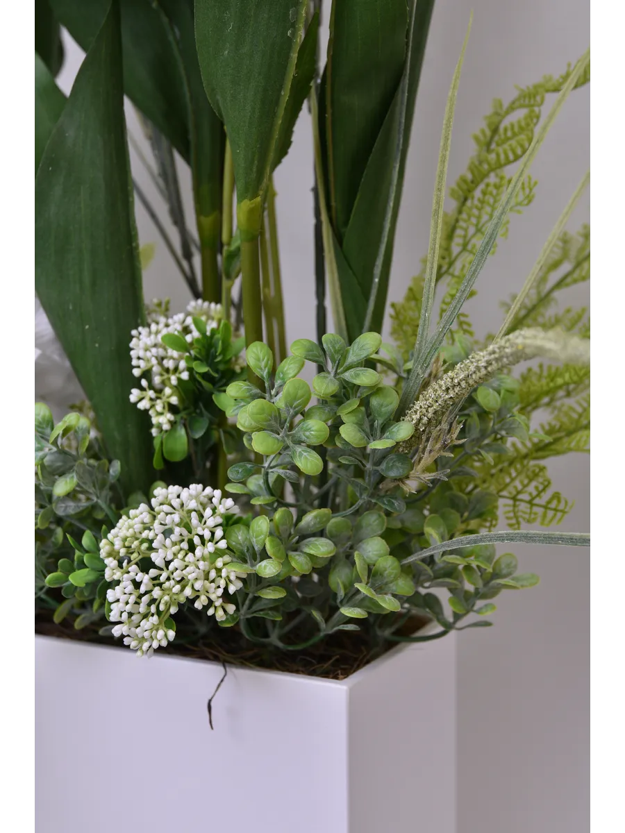 Большая напольная композиция из искусственных растений в деревянном ящике. Станет прекрасным дополнением интерьера или отдельным акцентом у камина, большого зеркала, в прихожей, где живым цветам мало света. Ящик изготовлен из березовой фанеры, покрыт акриловой эмалью без запаха. Размер ящика ш30*в25*г11 см. Размер композиции целиком 110*70*40 см. Цветы надежно закреплены в ящике.