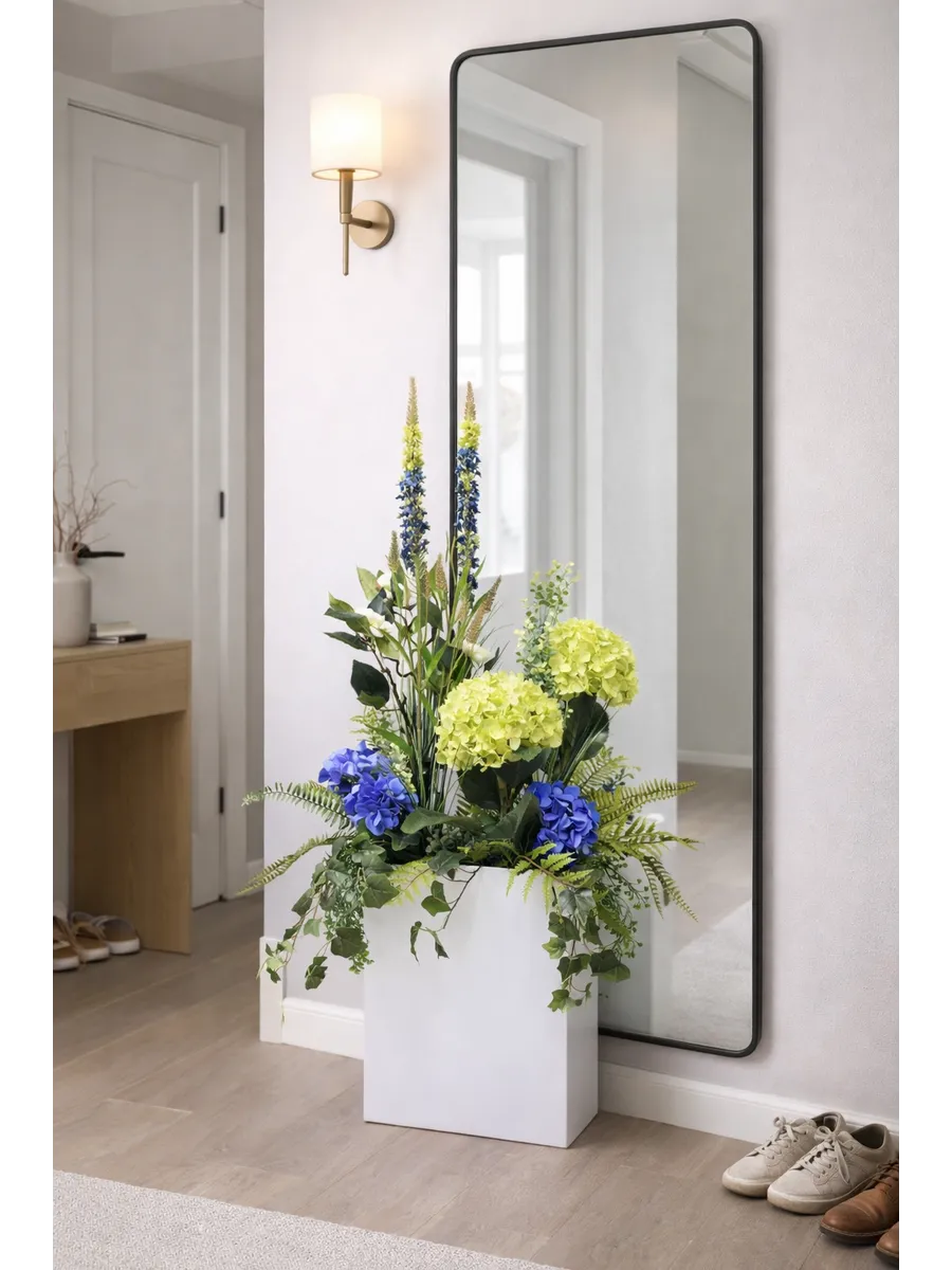 Большая напольная композиция из искусственных растений в деревянном ящике. Станет прекрасным дополнением интерьера или отдельным акцентом у камина, большого зеркала, в прихожей, где живым цветам мало света. Ящик изготовлен из березовой фанеры, покрыт акриловой эмалью без запаха. Размер ящика ш30*в35*г11 см. Размер композиции целиком 111*67*57 см. Цветы надежно закреплены в ящике.