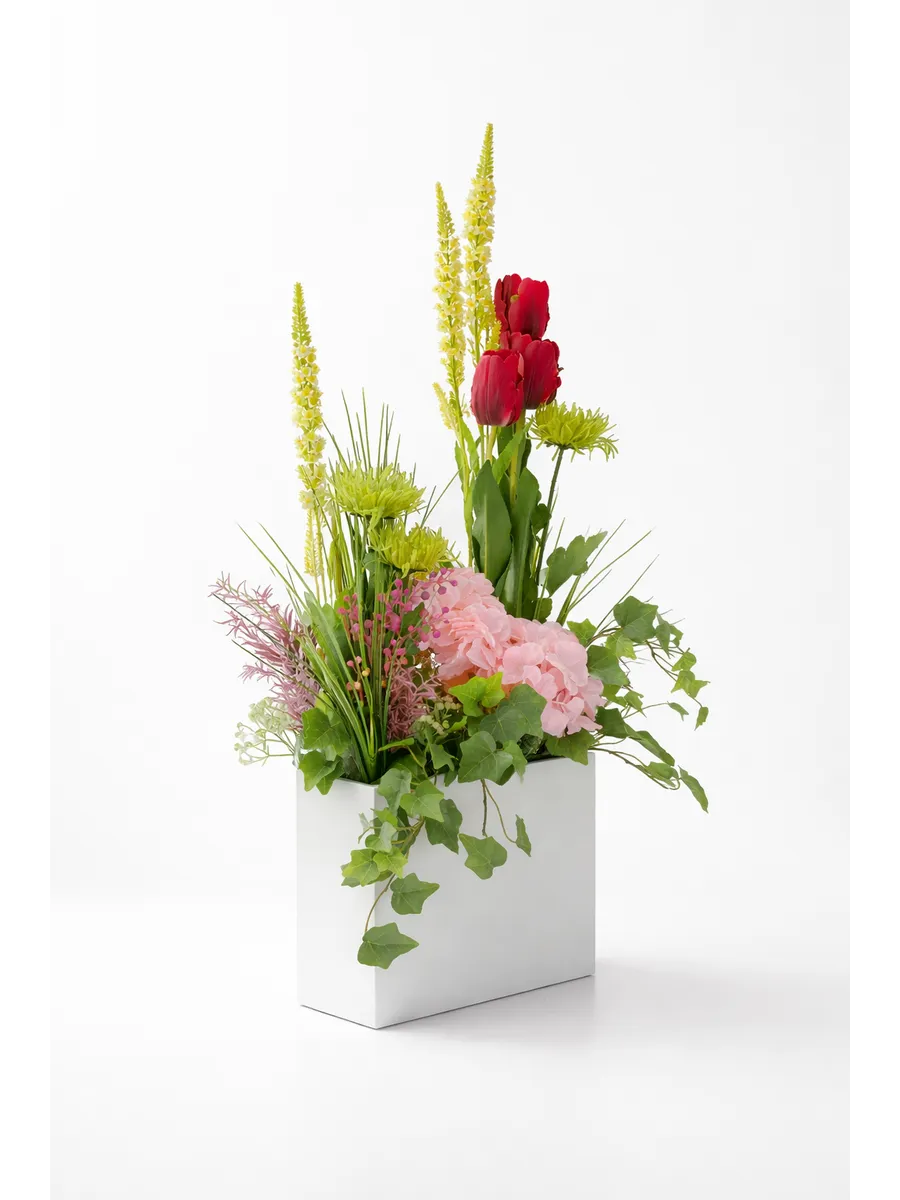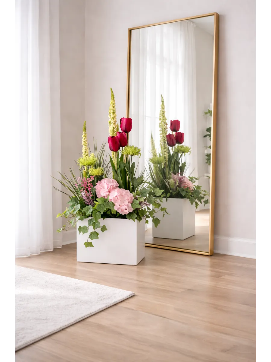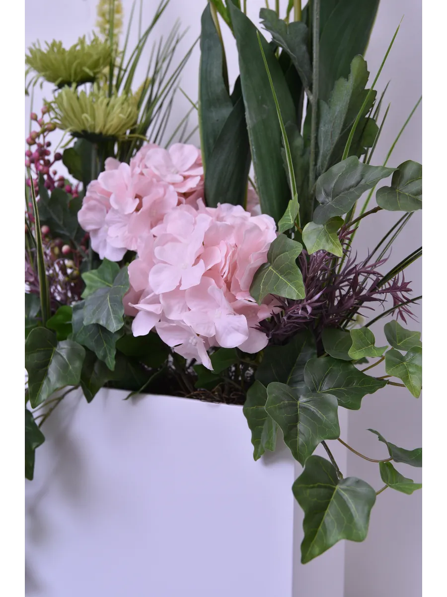 Большая напольная композиция из искусственных растений в деревянном ящике. Станет прекрасным дополнением интерьера или отдельным акцентом у камина, большого зеркала, в прихожей, где живым цветам мало света. Ящик изготовлен из березовой фанеры, покрыт акриловой эмалью без запаха. Размер ящика ш30*в25*г11 см. Размер композиции целиком 110*70*40 см. Цветы надежно закреплены в ящике.