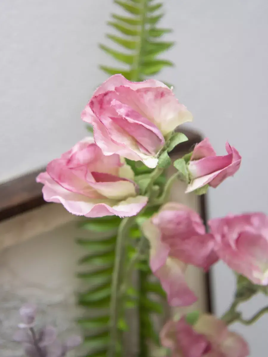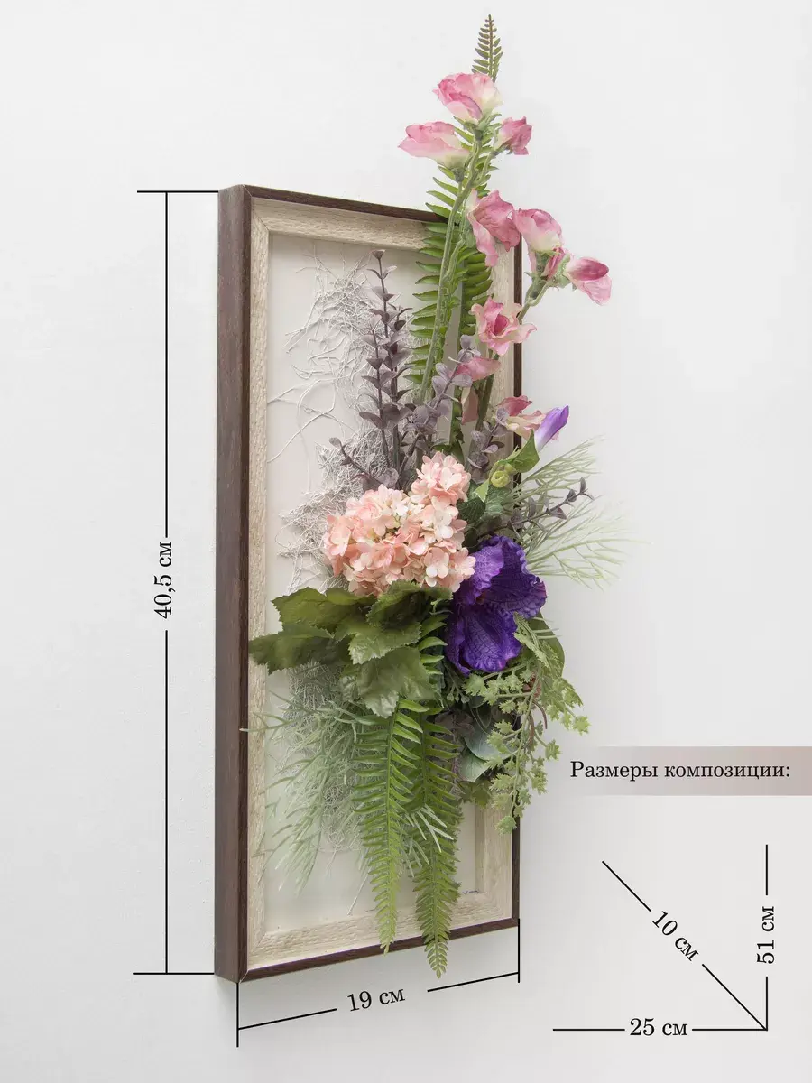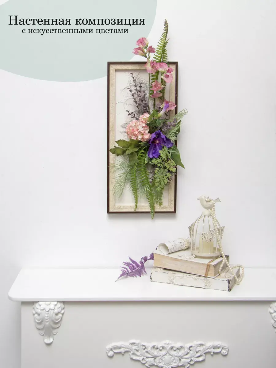 Авторская композиция из интерьерных цветов в багетной раме. Настенная цветочная композиция в багетной раме с искусственными интерьерными цветами. Выполнена из высококачественных искусственных цветов и растений , лаванда и гортензия, горошек, орхидеи . Размер рамы 40,5*19 см. В комплекте шуруп с дюбелем и зубчатый крепеж на раме. Отличное украшение к зеркалу, коллекции картин с цветами или в прихожей, где живым цветам недостаточно света. Панно долго будет радовать и добавлять уюта в дом.