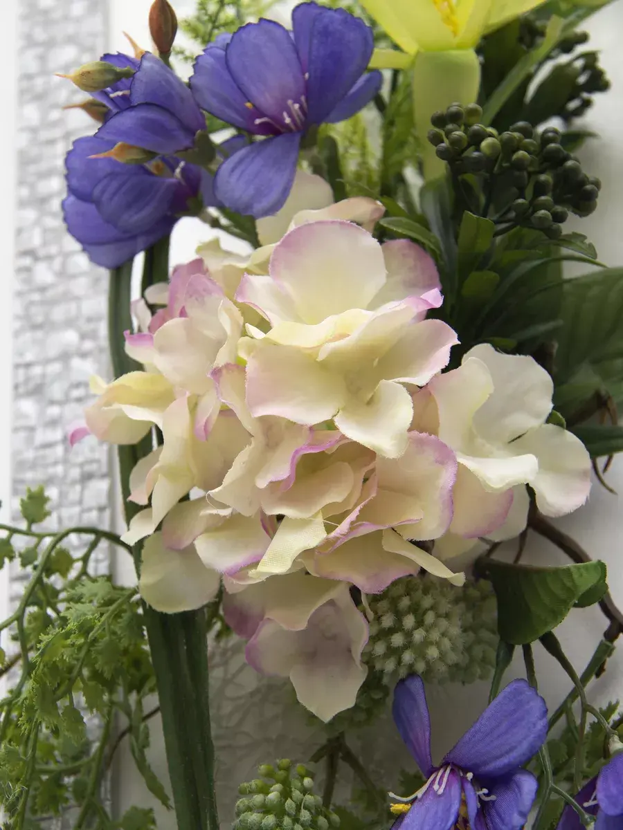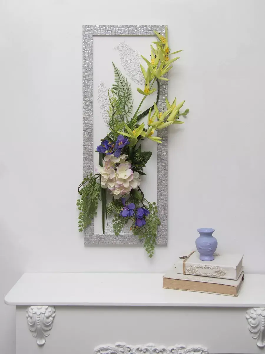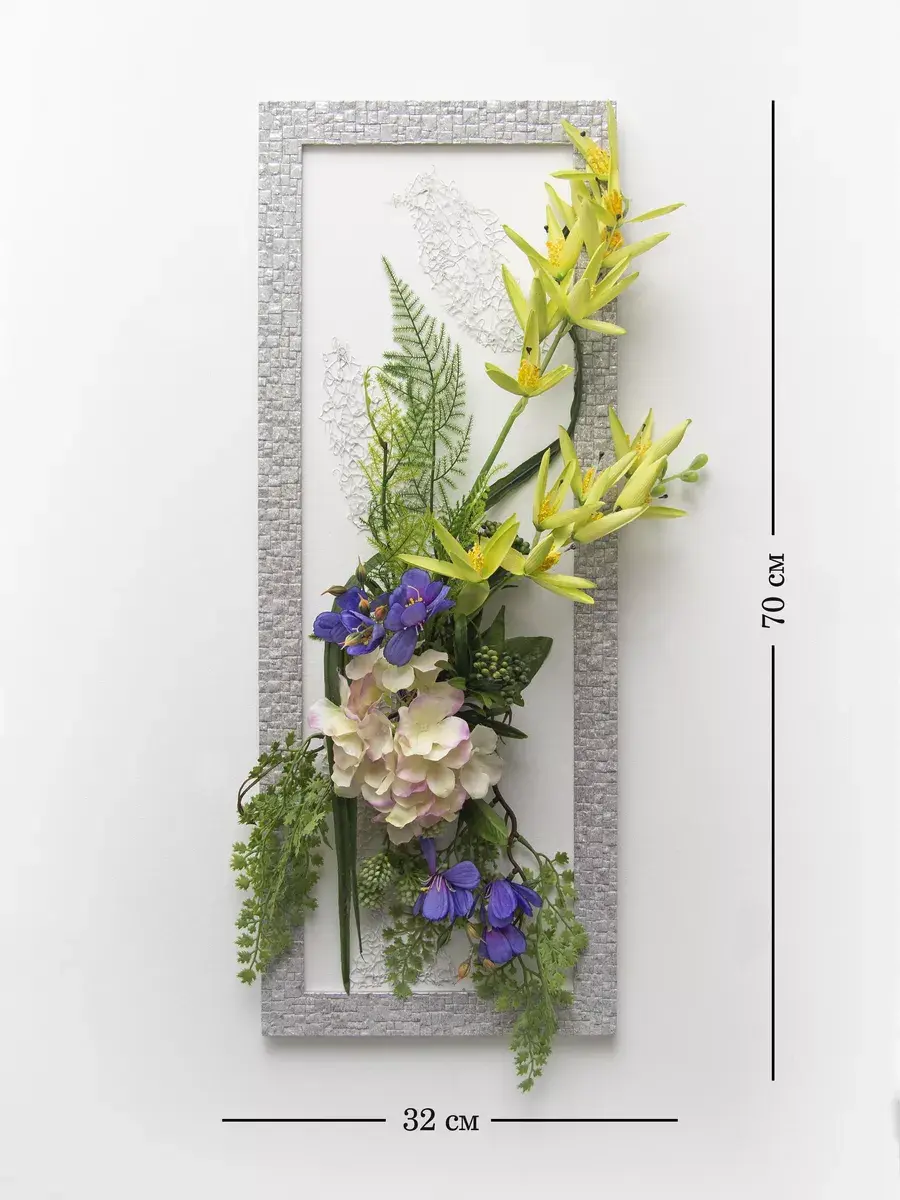 Авторская композиция из интерьерных цветов в багетной раме. Настенная цветочная композиция в багетной раме с искусственными интерьерными цветами. Выполнена из высококачественных искусственных цветов и растений , лаванда и гортензия, горошек, орхидеи . Размер рамы 65*25 см. В комплекте шуруп с дюбелем и зубчатый крепеж на раме. Отличное украшение к зеркалу, коллекции картин с цветами или в прихожей, где живым цветам недостаточно света. Панно долго будет радовать и добавлять уюта в дом.