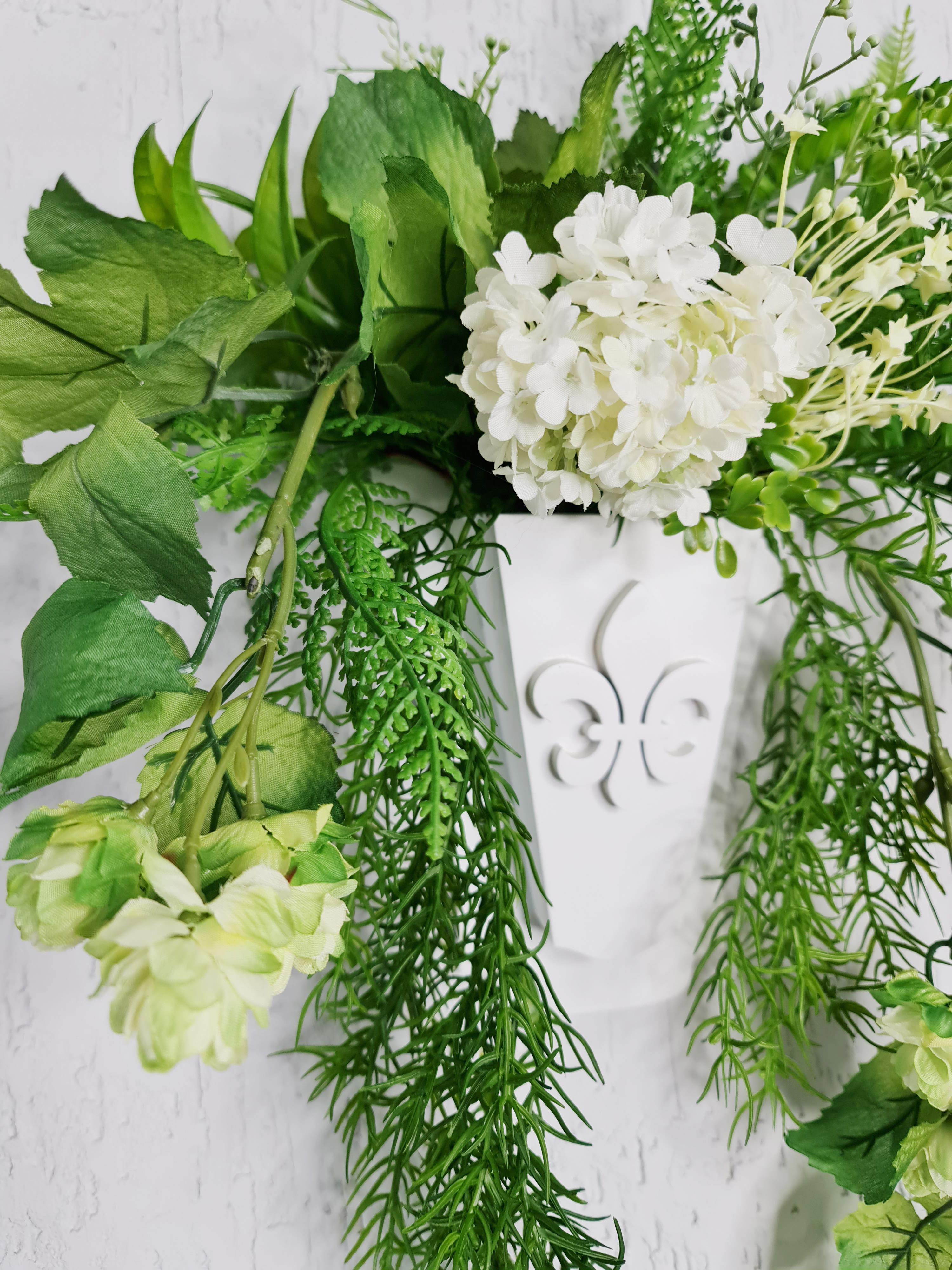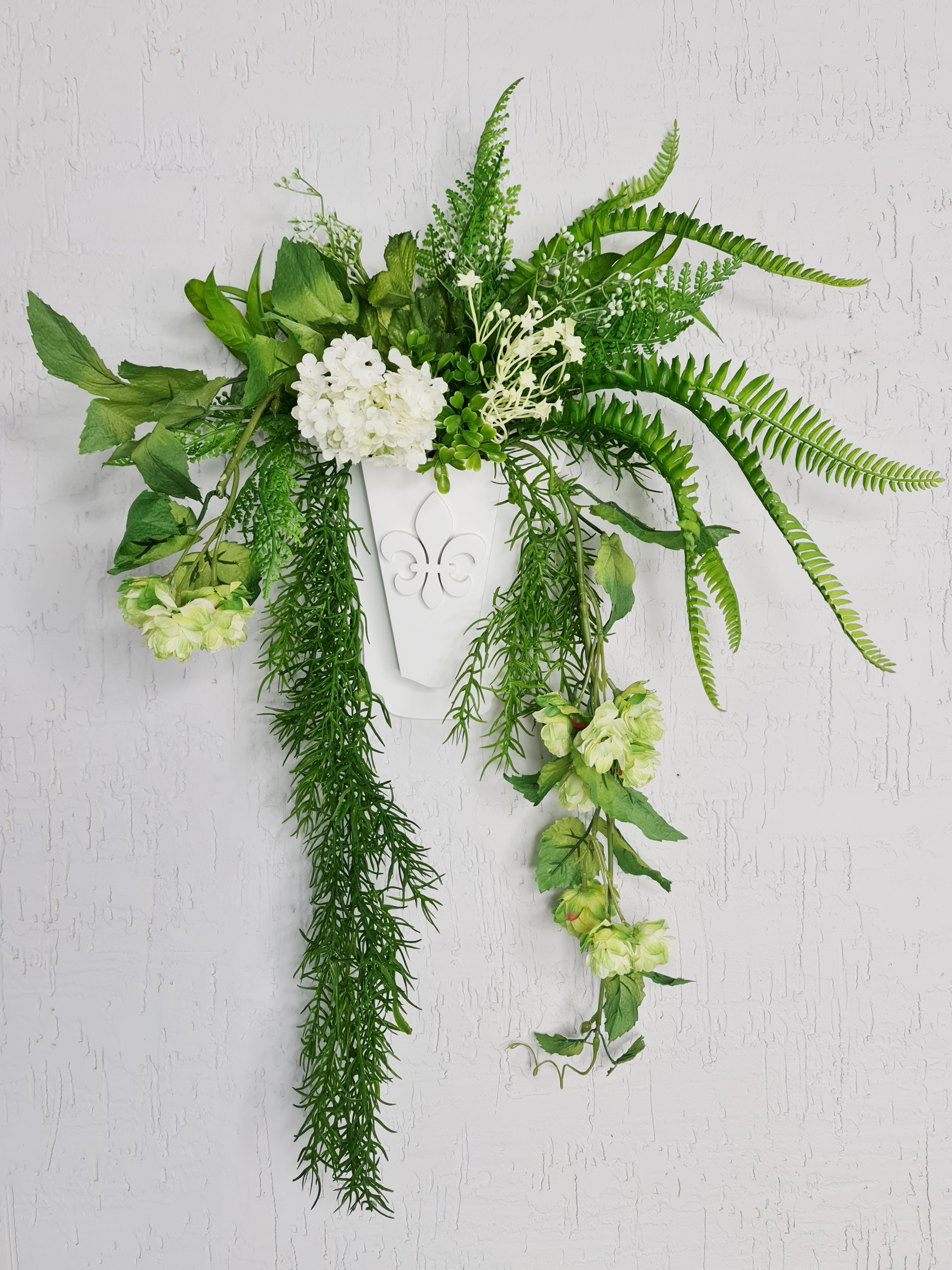 Авторская композиция из искусственных цветов и растений в деревянном кашпо. Размер 41*59*17 см.