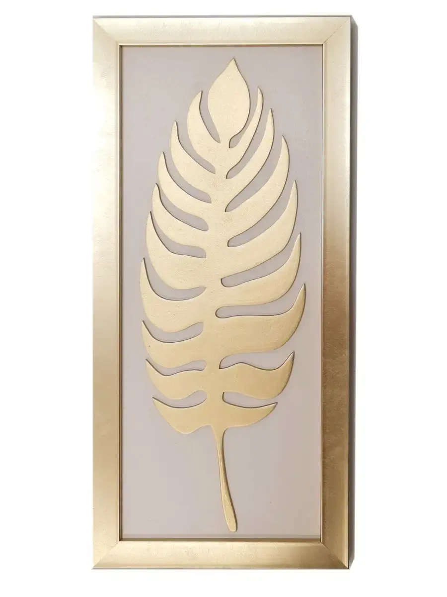 Настенные панно "Пальмовые листья". Декор 3D на стену для комнаты в современном стиле. Деревянный резной декор оформлен в золотую багетную раму, покрашен акриловой эмалью на водной основе, листья покрашены золотой поталью. Декор для интерьера дома и дачи. Декорация на стену спальни, прихожей, украшение для кухни и ванной комнаты. Деревянные панно легкие и изящные, преобразят интерьер комнат. Размер одного панно 19х41 см. С обратной стороны зубчатый крепеж, крепление для стены в комплекте.
