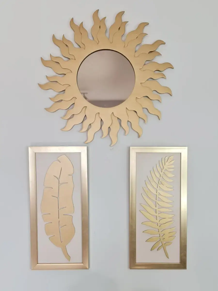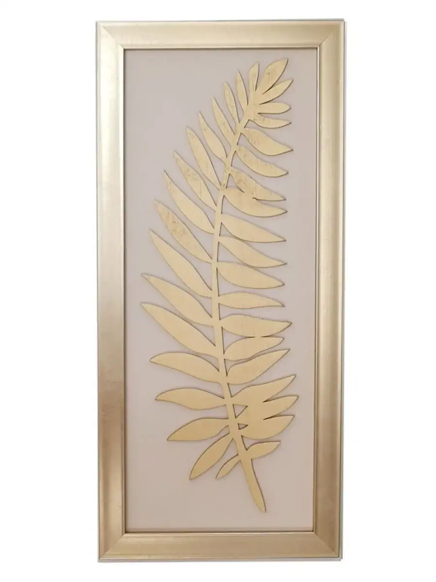 Настенные панно "Пальмовые листья". Декор 3D на стену для комнаты в современном стиле. Деревянный резной декор оформлен в золотую багетную раму, покрашен акриловой эмалью на водной основе, листья покрашены золотой поталью. Декор для интерьера дома и дачи. Декорация на стену спальни, прихожей, украшение для кухни и ванной комнаты. Деревянные панно легкие и изящные, преобразят интерьер комнат. Размер одного панно 19х41 см. С обратной стороны зубчатый крепеж, крепление для стены в комплекте.