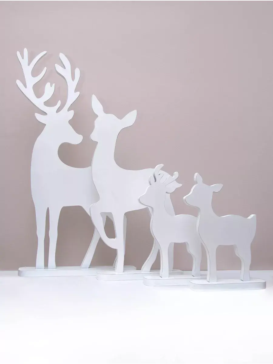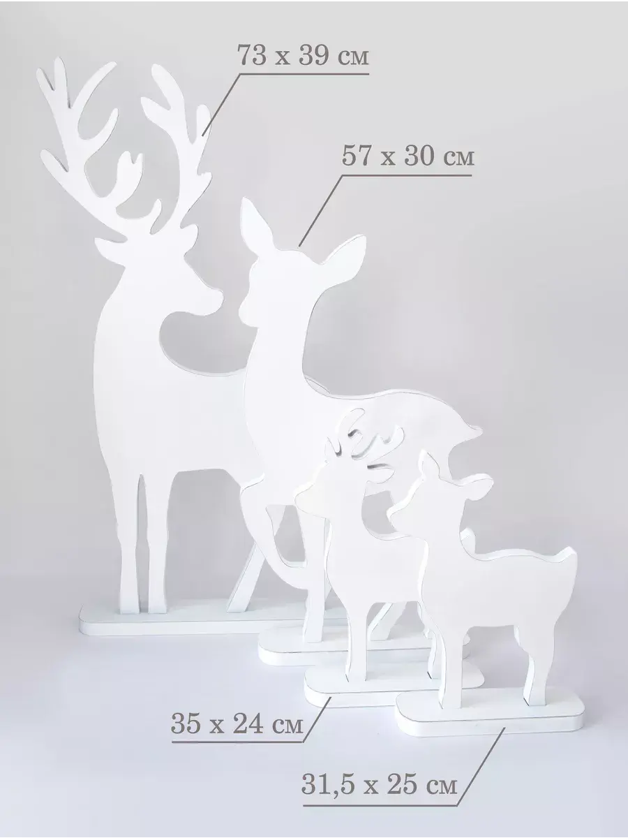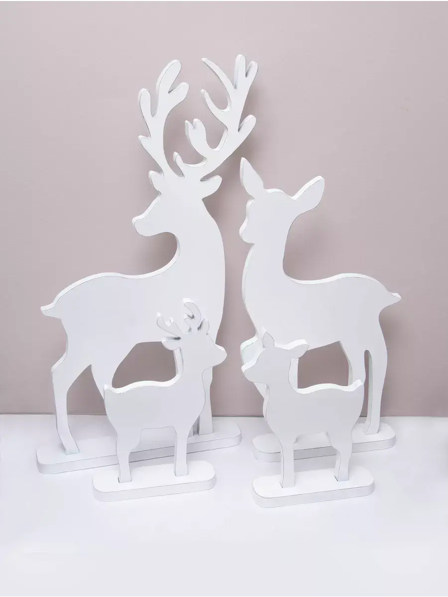 Набор декоративных фигур "Новогодние олени" для оформления интерьера. Деревянные олени для создания новогодней атмосферы дома, офиса, гостиницы, кафе или салона красоты. Олени выволнены в разных размерах, напольные фигуры оленей можно поставить рядом с елкой или камином, украсить светодиодными гирляндами и подарками. Настольный вариант оленей прекрасный сувенир, украсит стол в офисе, рядом с настольной елкой. Статуэтки тяжелые и достаточно устойчивые. Подарки для детей на их фоне буду выглядеть особенно празднично. Олени выполнены из МДФ 20мм., покрашены акриловой эмалью с эффектом старения. Размеры 73х39 см, 57х30 см, 35х24 и 31,5х25 см, выполнены из МДФ 20мм