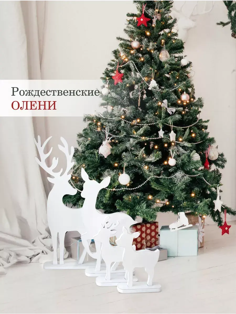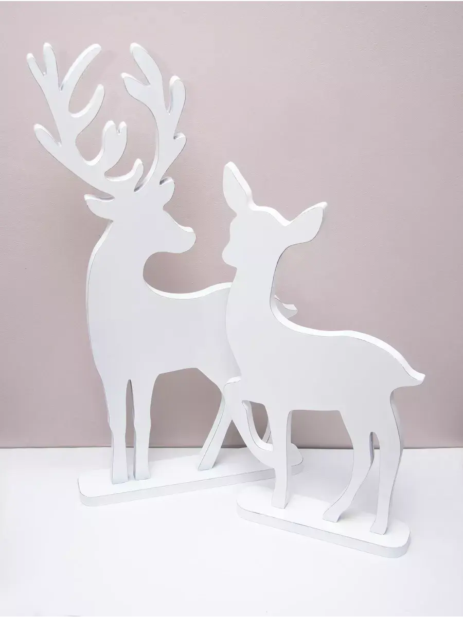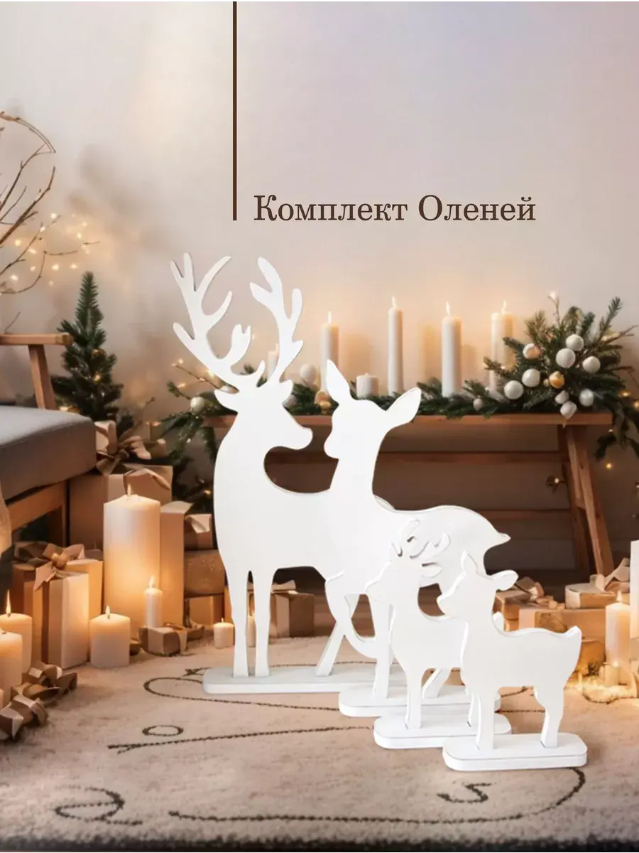 Набор декоративных фигур "Новогодние олени" для оформления интерьера. Деревянные олени для создания новогодней атмосферы дома, офиса, гостиницы, кафе или салона красоты. Олени выволнены в разных размерах, напольные фигуры оленей можно поставить рядом с елкой или камином, украсить светодиодными гирляндами и подарками. Настольный вариант оленей прекрасный сувенир, украсит стол в офисе, рядом с настольной елкой. Статуэтки тяжелые и достаточно устойчивые. Подарки для детей на их фоне буду выглядеть особенно празднично. Олени выполнены из МДФ 20мм., покрашены акриловой эмалью с эффектом старения. Размеры 73х39 см, 57х30 см, 35х24 и 31,5х25 см, выполнены из МДФ 20мм