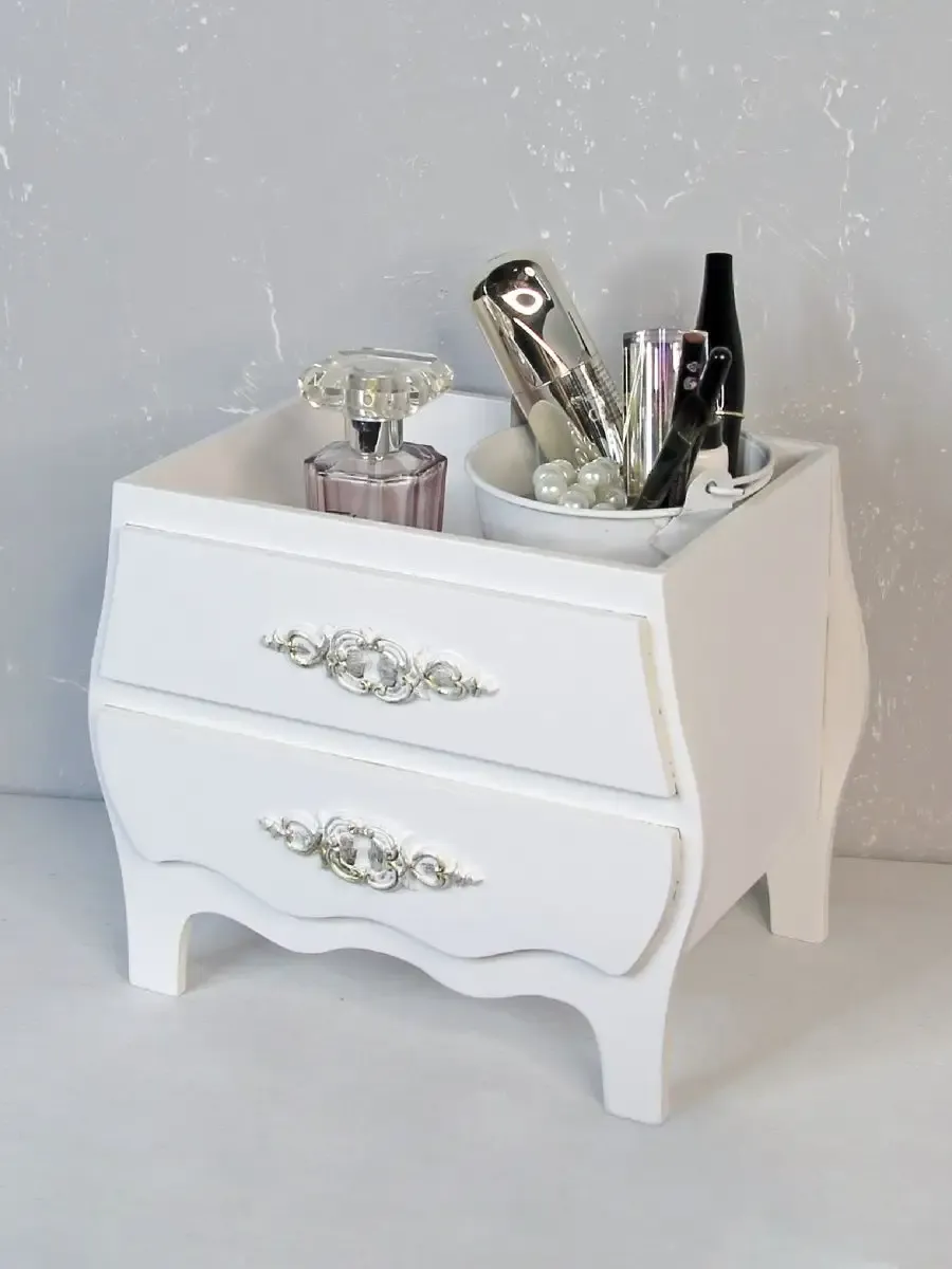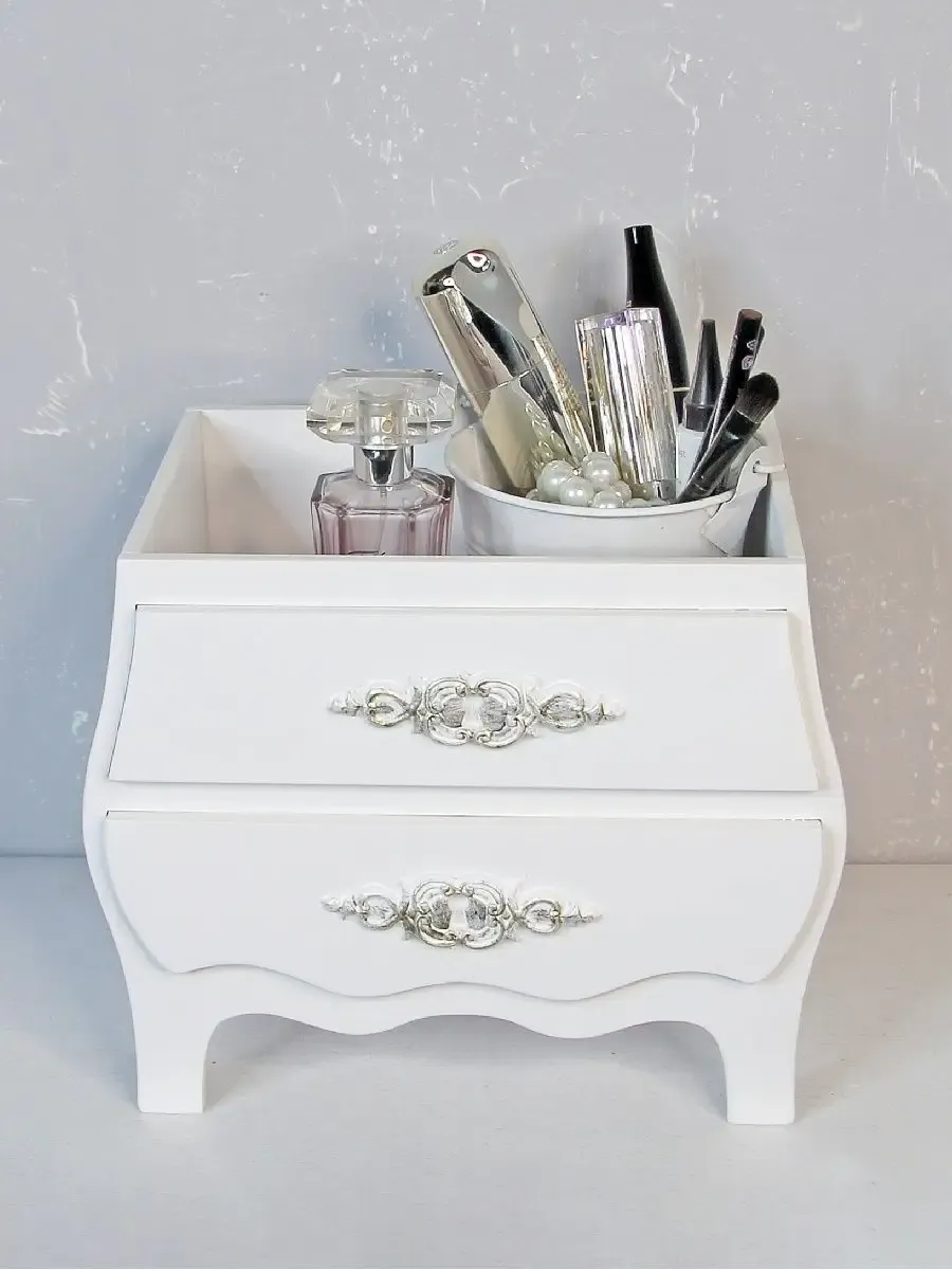 Нежный белый цвет и декоративная фурнитура делают органайзер настоящим украшением интерьера. Он прекрасно подходит для спальни, ванной комнаты, туалетного столика или рабочего стола.